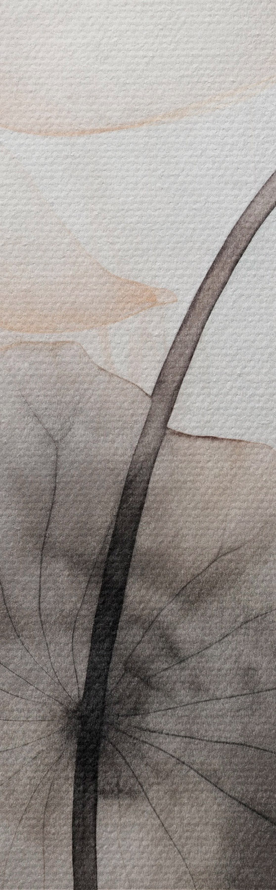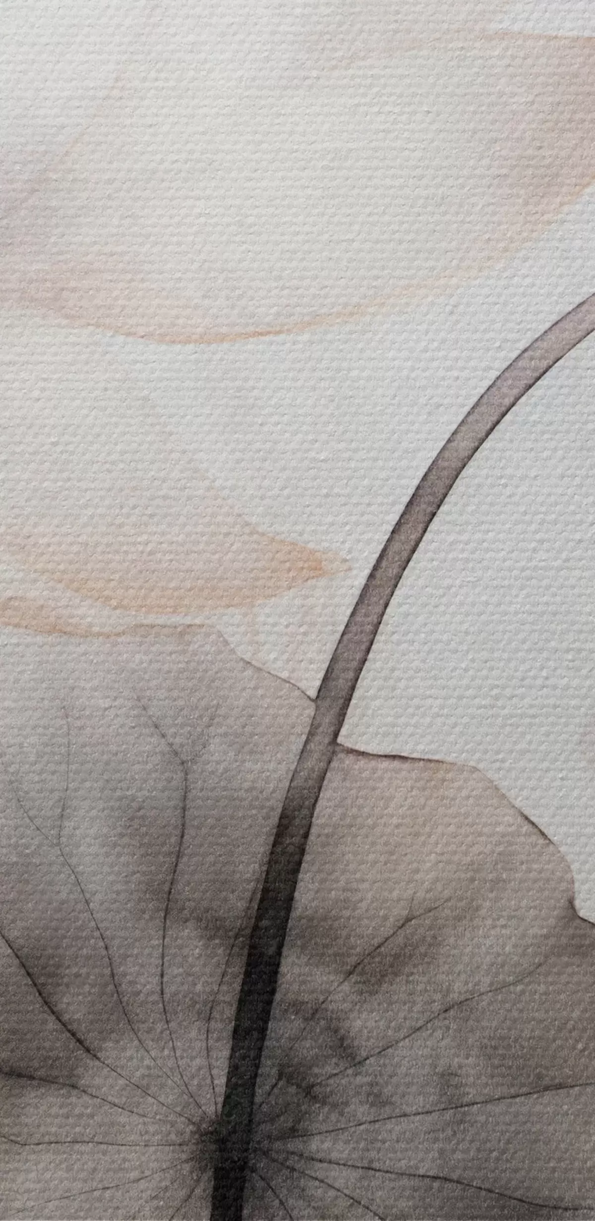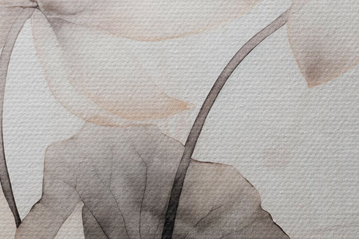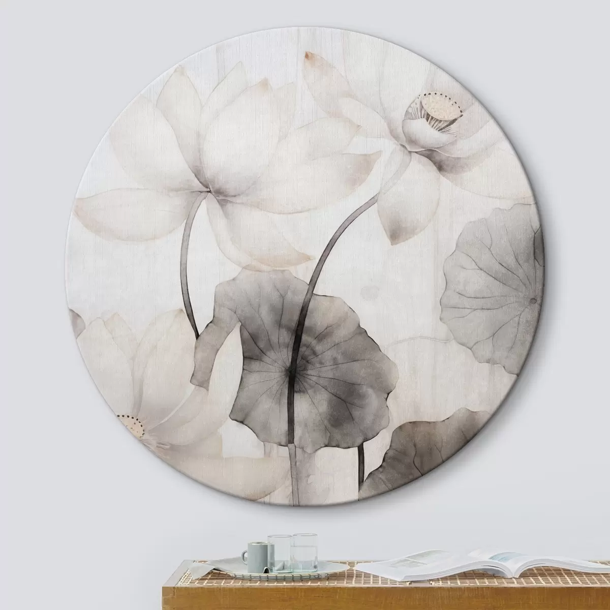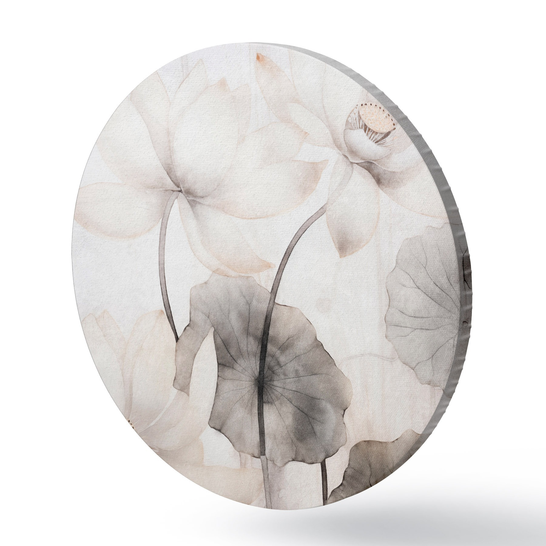 Cuadros redondos Flores de loto blancas con textura y hojas oscuras, fondo claro, diseño minimalista r45937