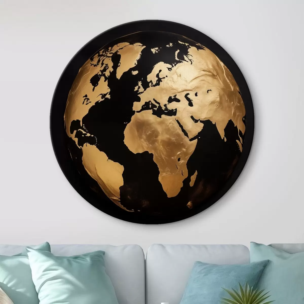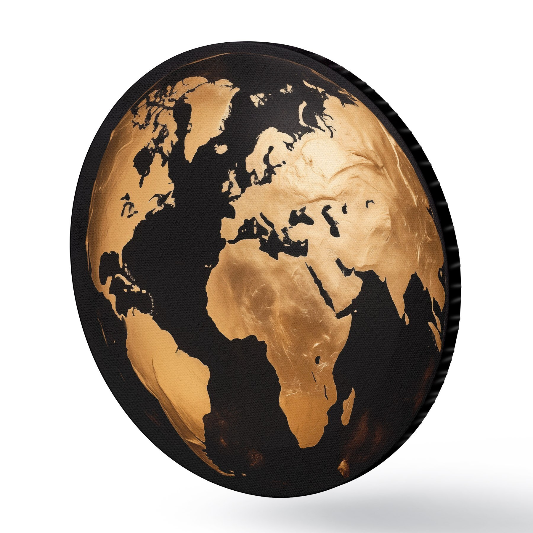 Cuadros redondos Globo terráqueo abstracto con textura amarilla, planeta sobre fondo negro, arte minimalista moderno r45942