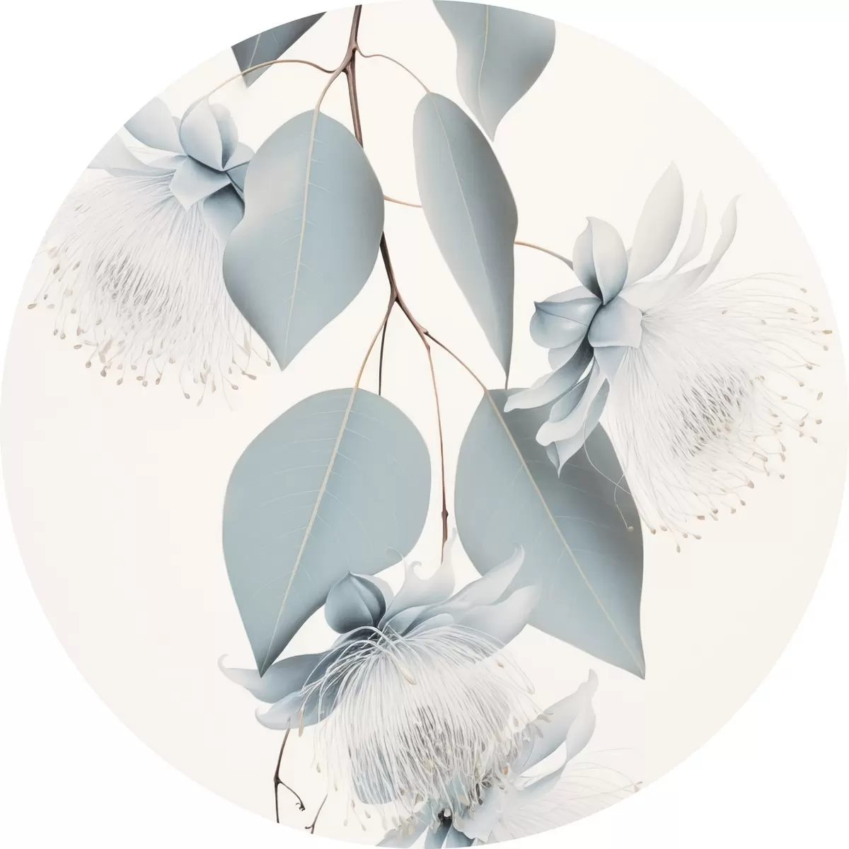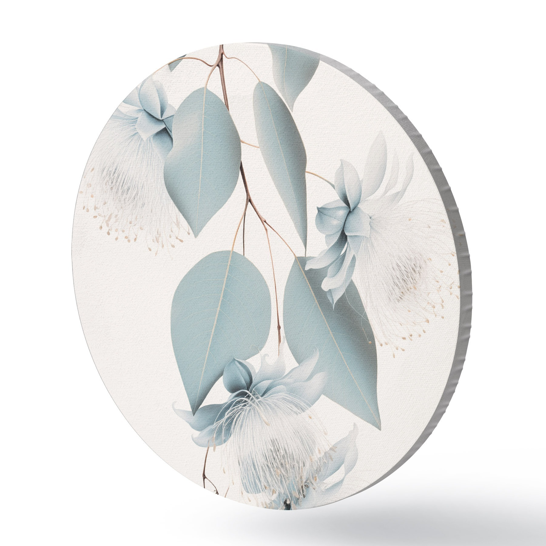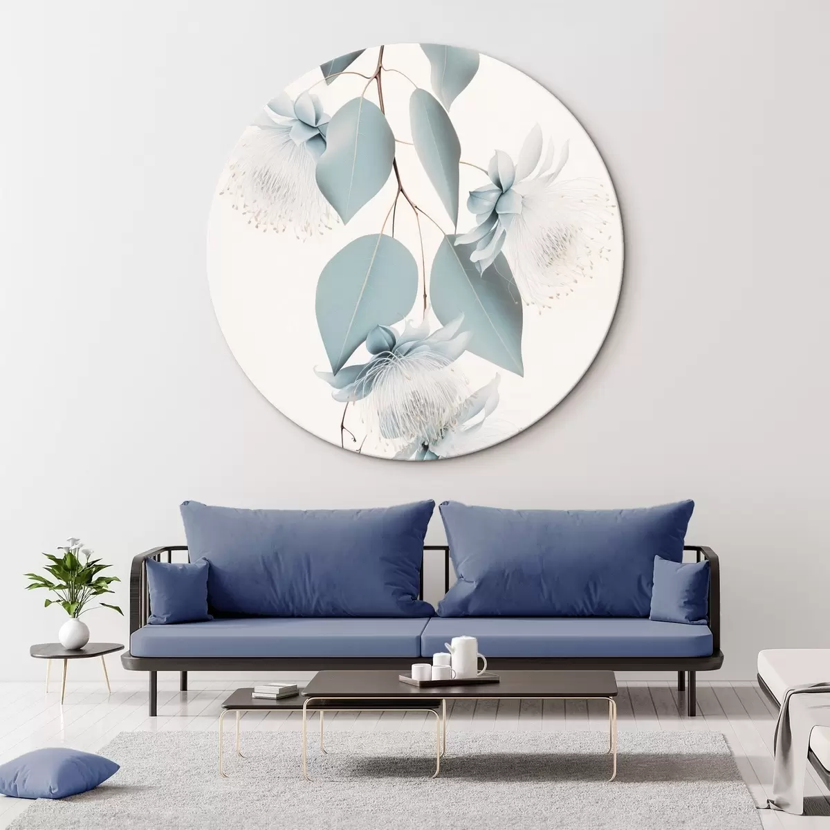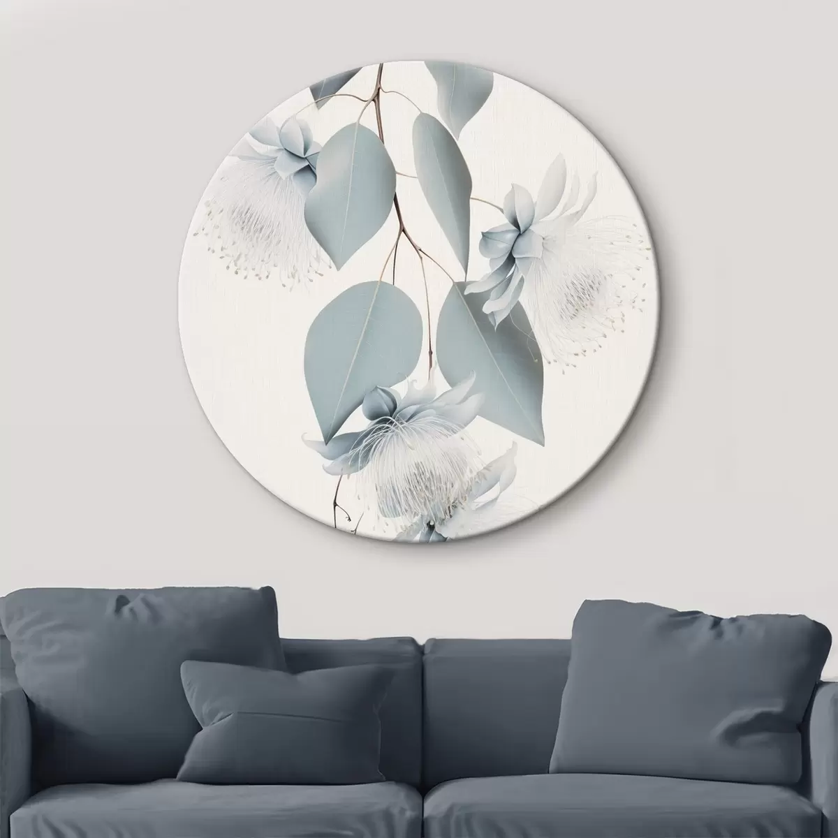 Cuadros redondos Rama de eucalipto con hojas azules y flores blancas, fondo claro r45947