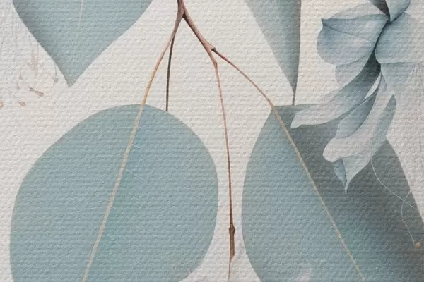 Foto Rama de eucalipto con hojas azules y flores blancas, fondo claro Nr r45947