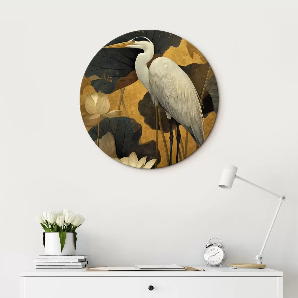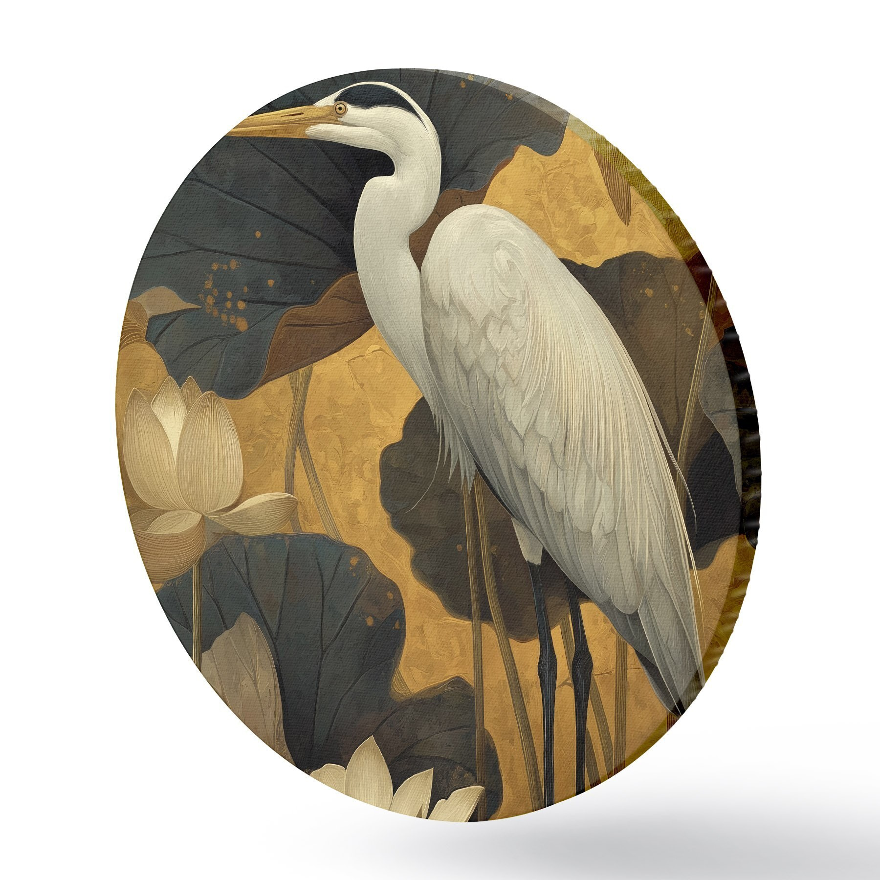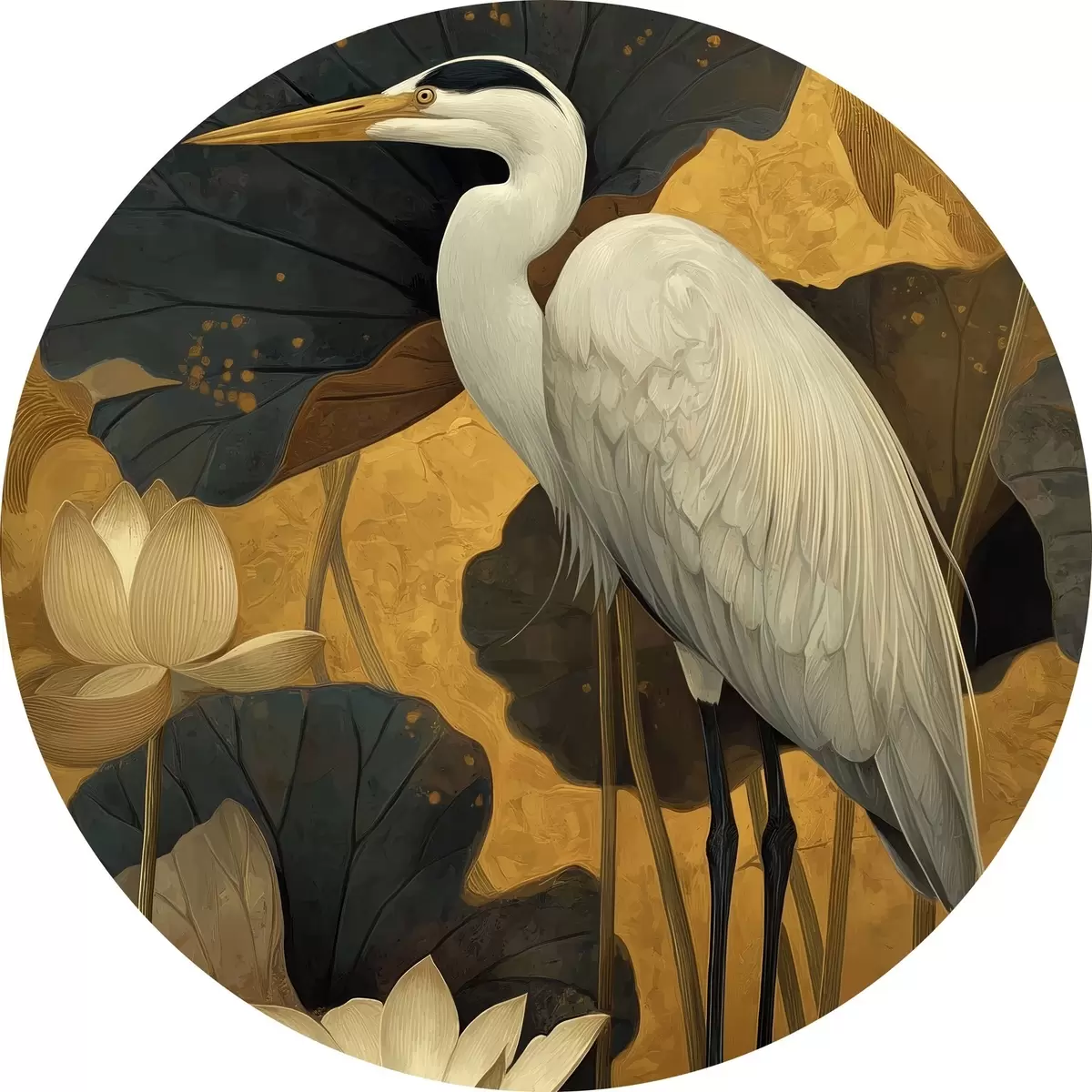 Cuadros redondos Garza entre lotos sobre un fondo cálido r46148