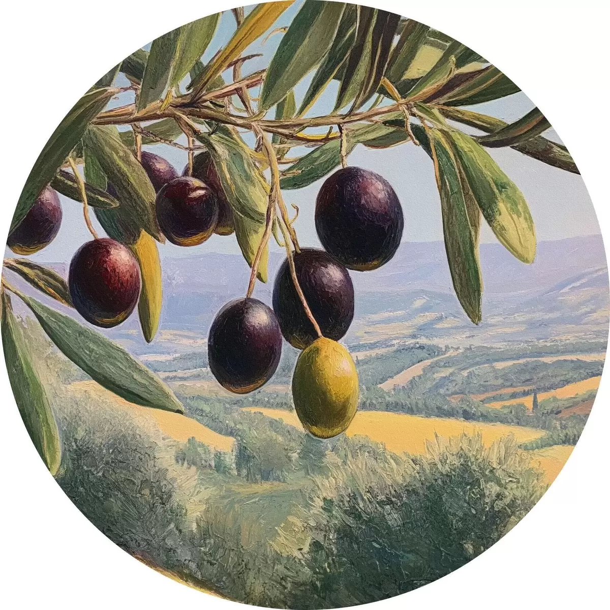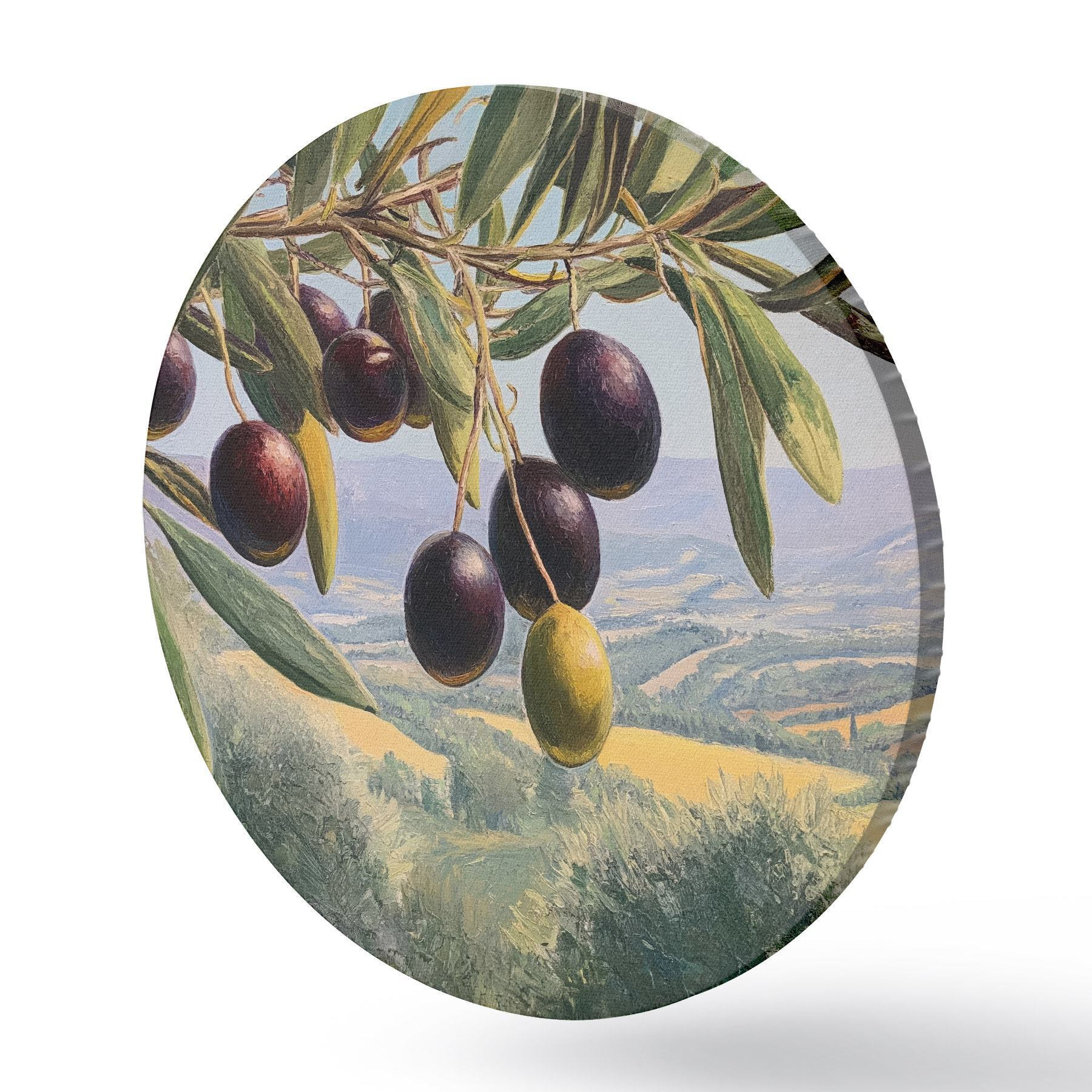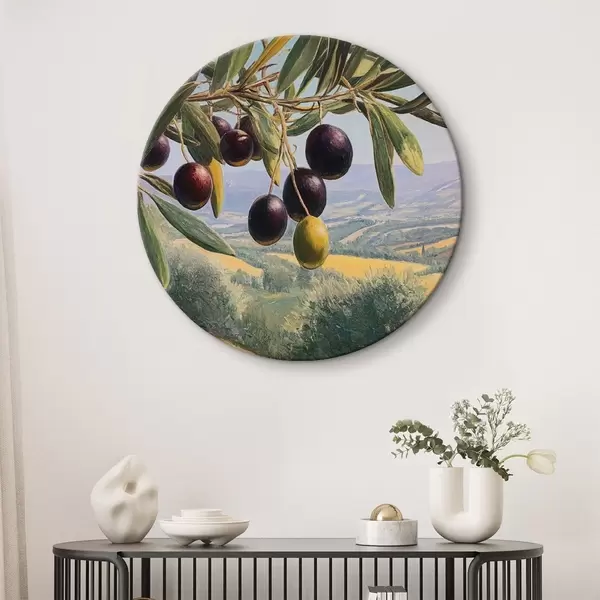 Cuadros redondos Rama de olivo con frutos oscuros sobre un paisaje veraniego r46150