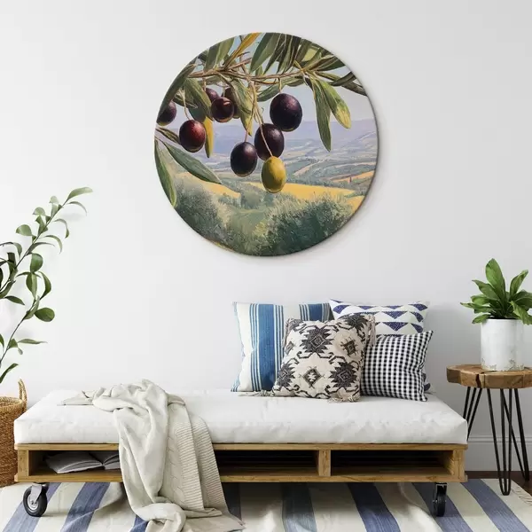 Cuadros redondos Rama de olivo con frutos oscuros sobre un paisaje veraniego r46150