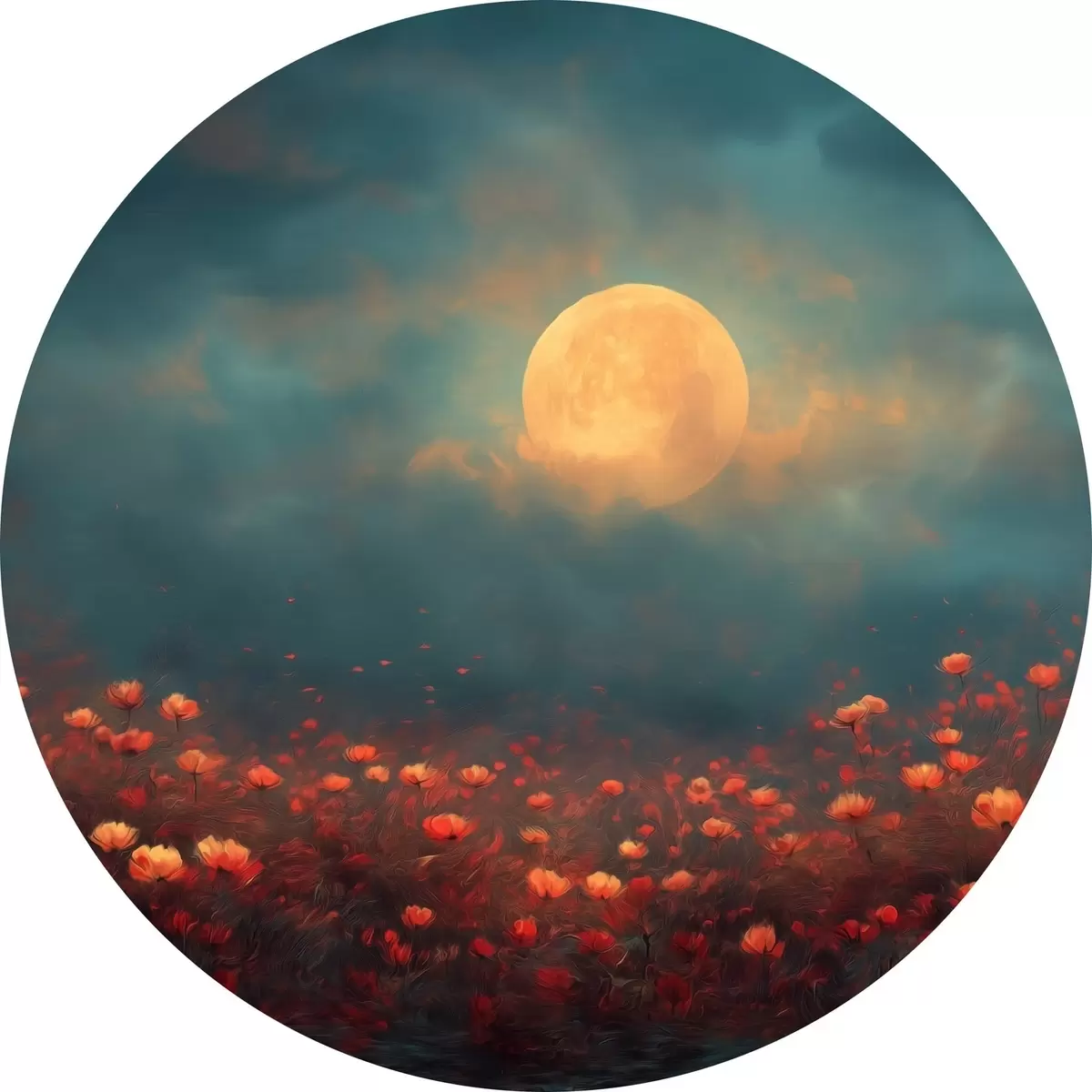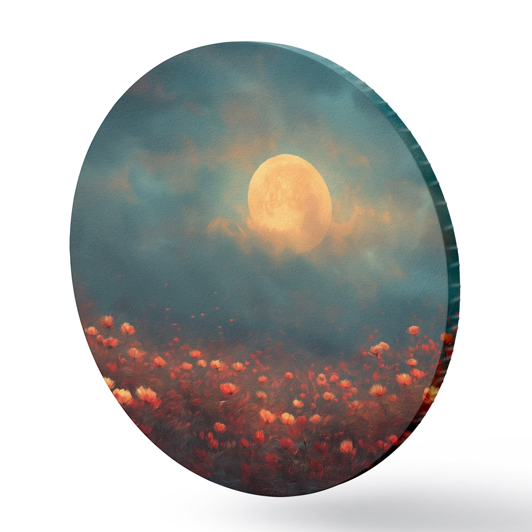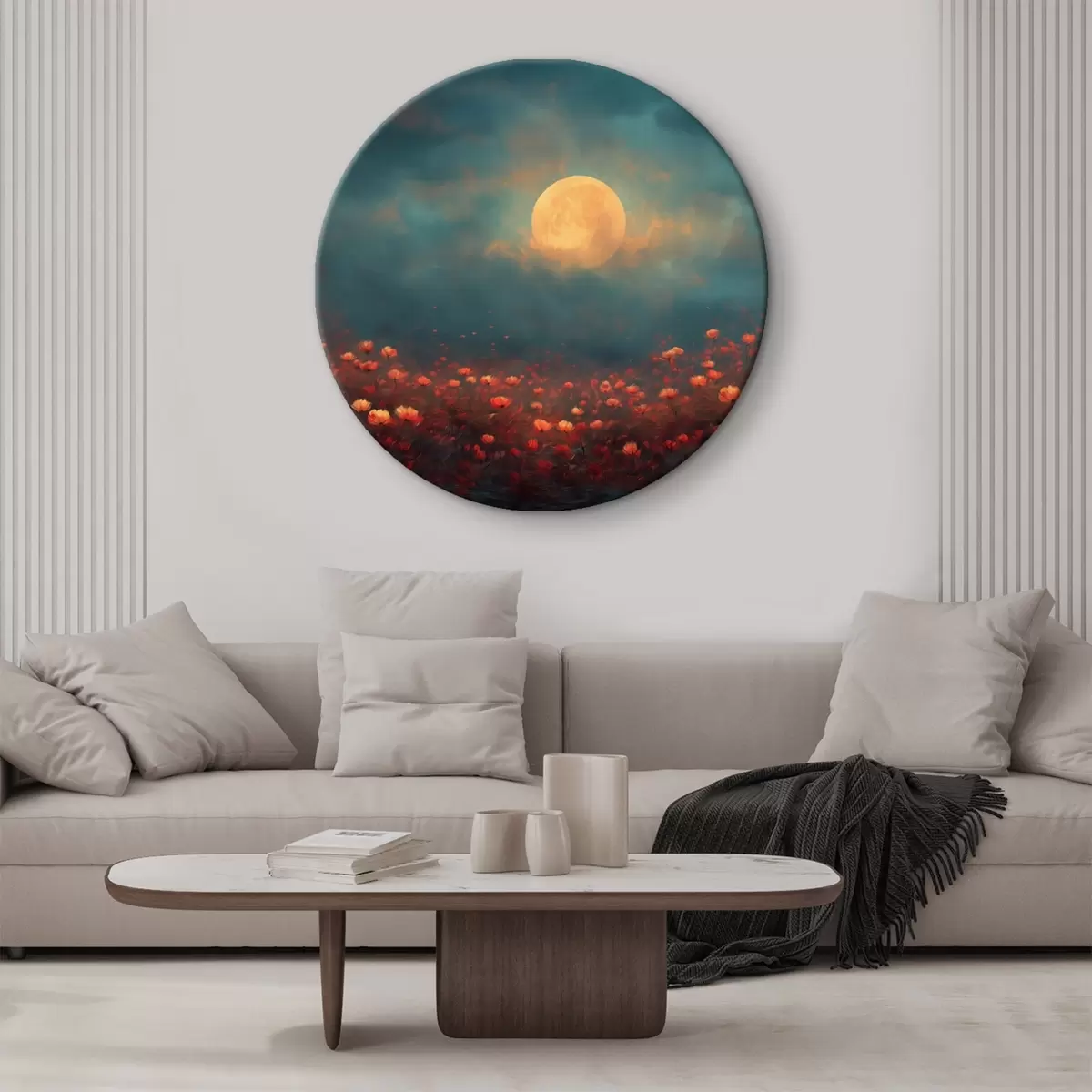 Cuadros redondos Luna sobre un campo de flores rojas en un cielo brumoso al atardecer r46167