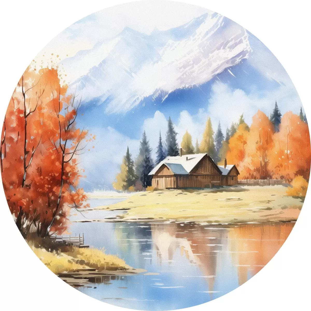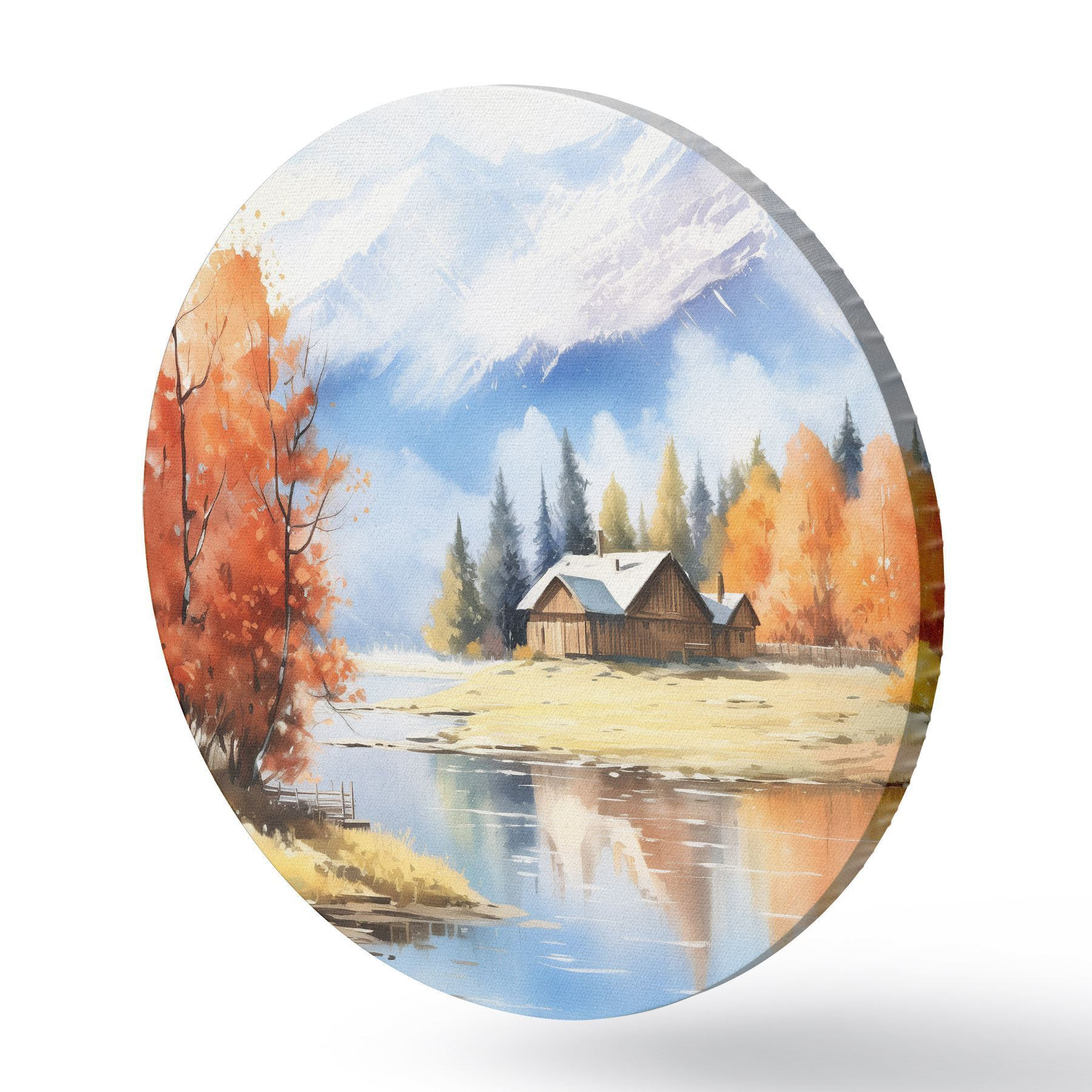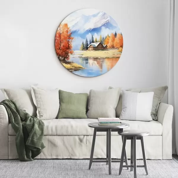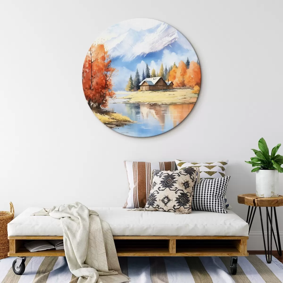 Cuadros redondos Paisaje otoñal junto al lago con una casa y montañas r46184