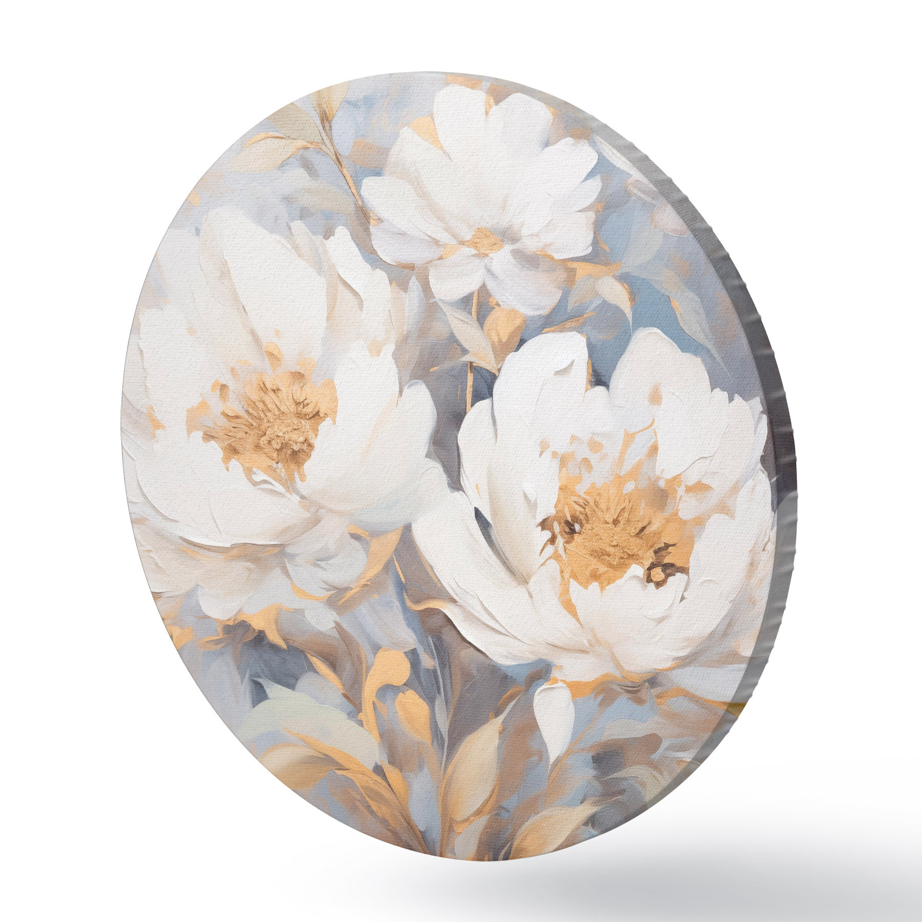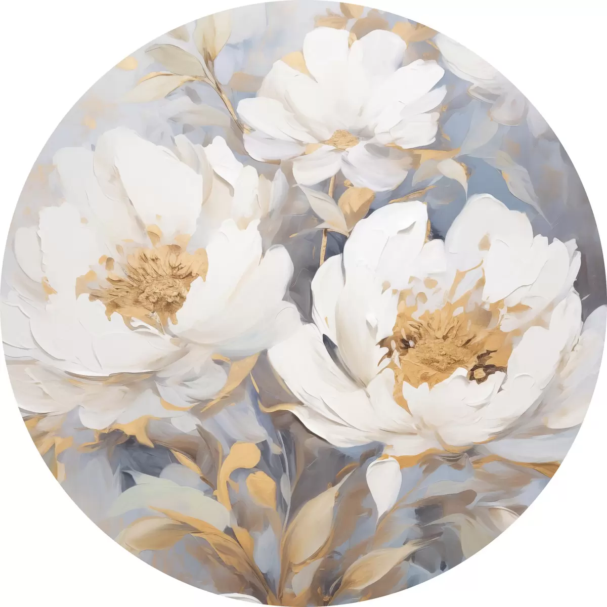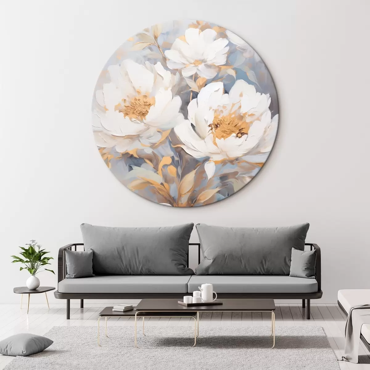 Cuadros redondos Peonías blancas con centros y hojas azules, pinceladas suaves, fondo azul claro, arreglo floral r46270