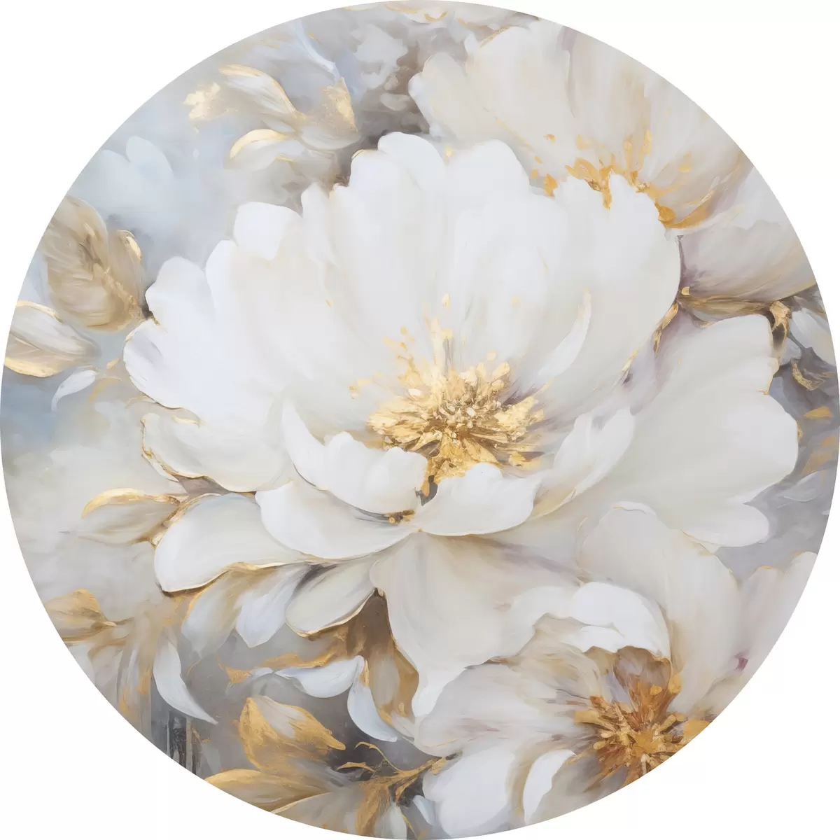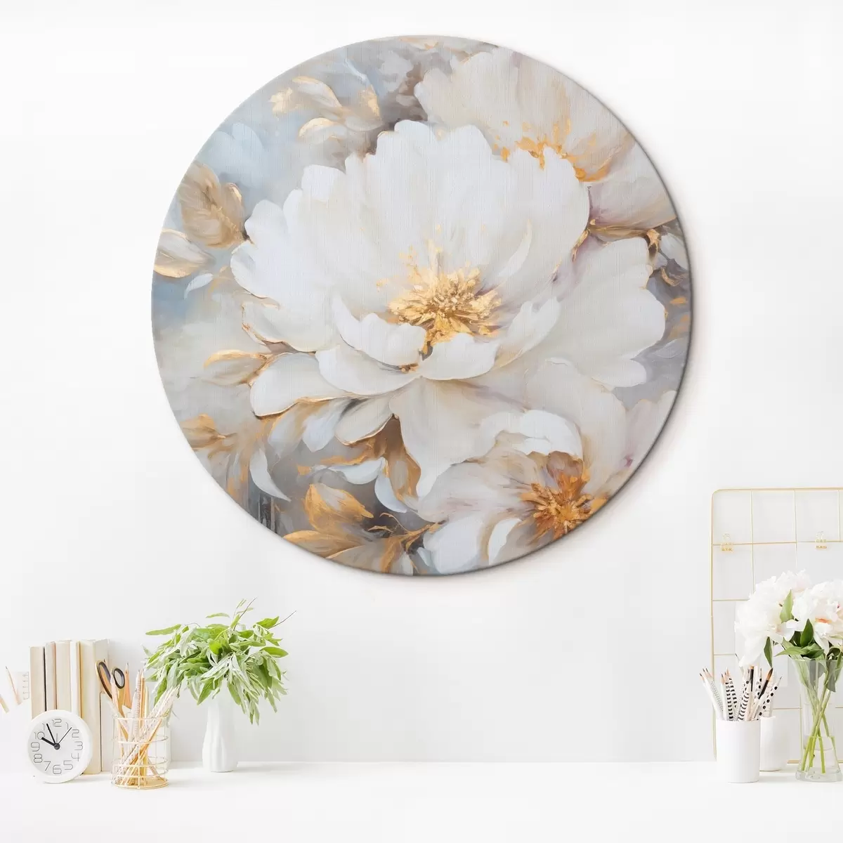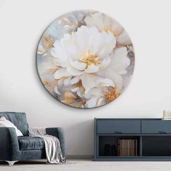 Cuadros redondos Peonías blancas con centros y hojas azules, pinceladas suaves, fondo azul claro, arreglo floral r46271