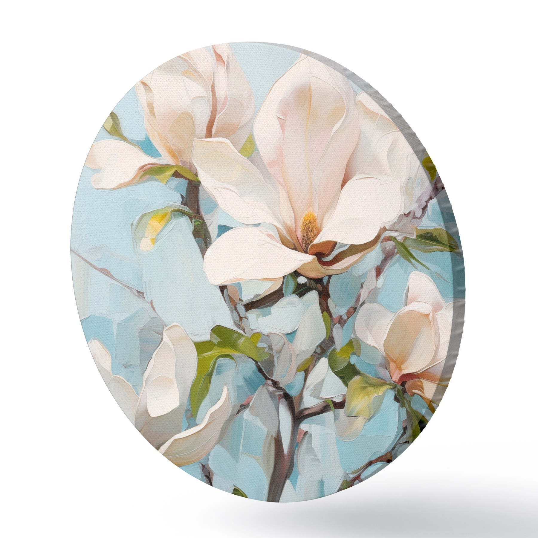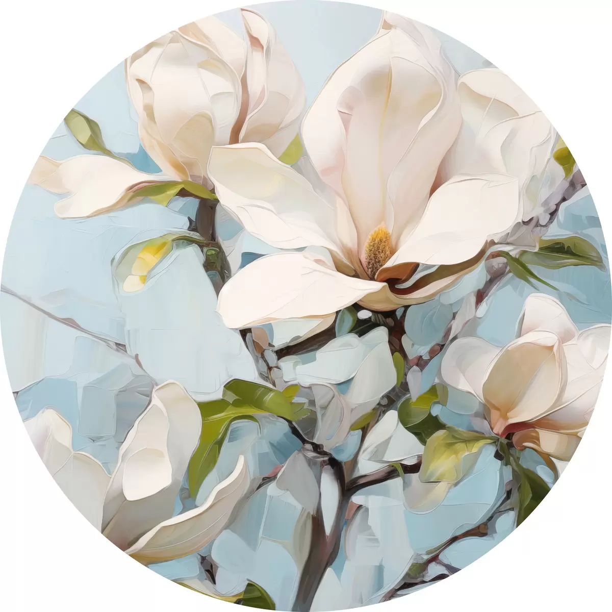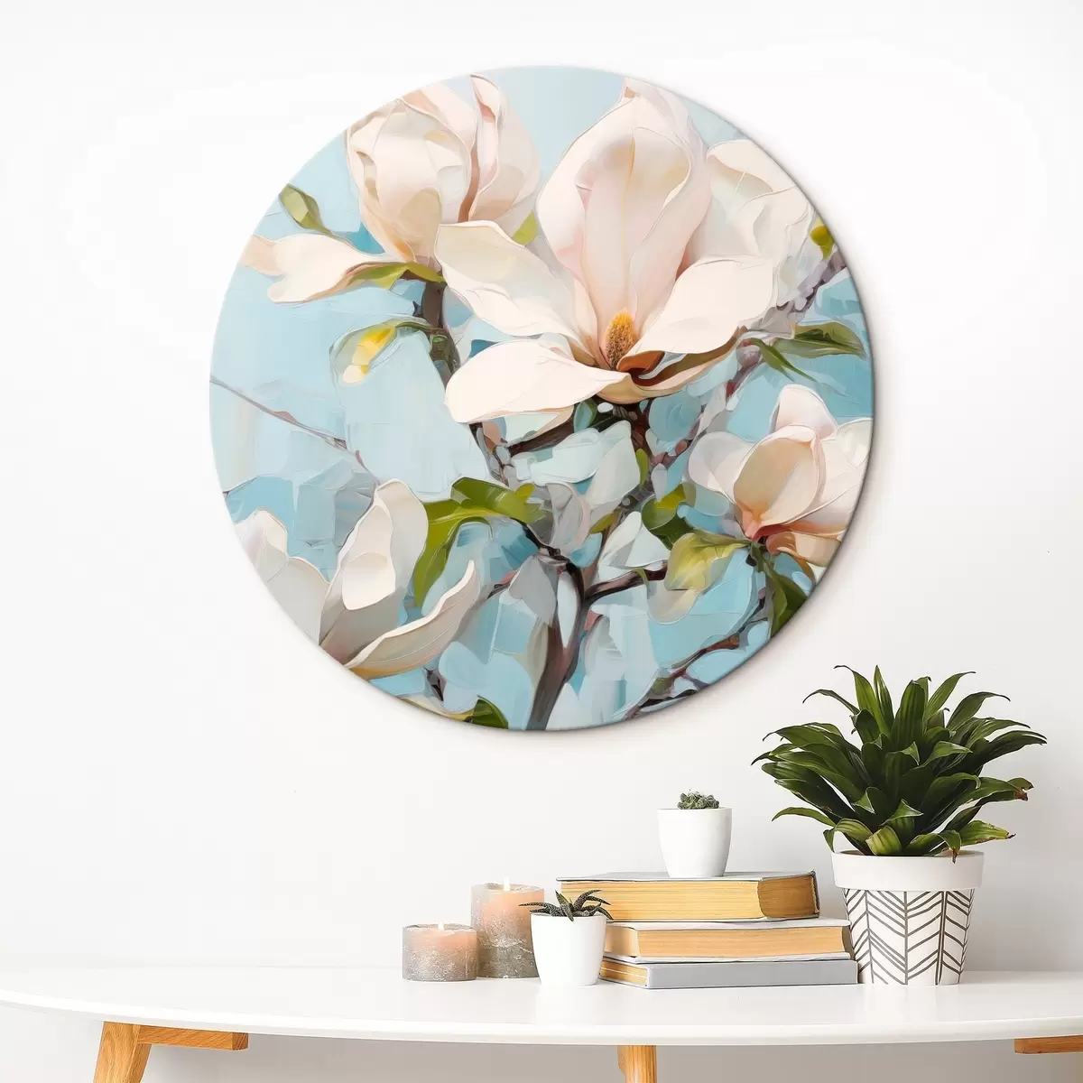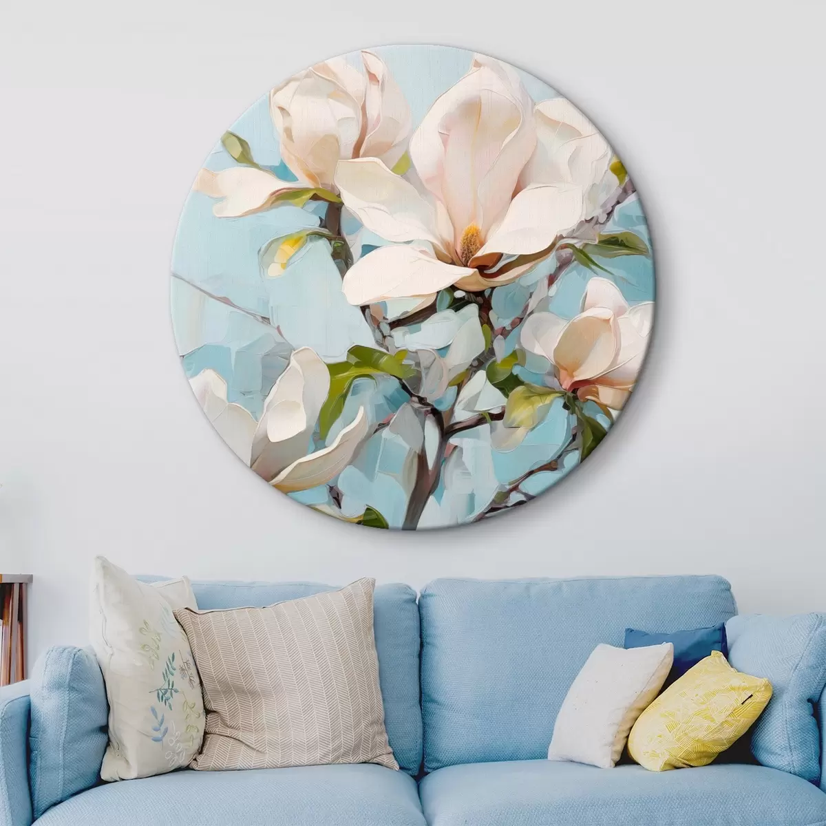 Cuadros redondos Flores blancas de magnolia, fondo azul claro con suaves pinceladas, estilo pintura al óleo, textura impasto r46277