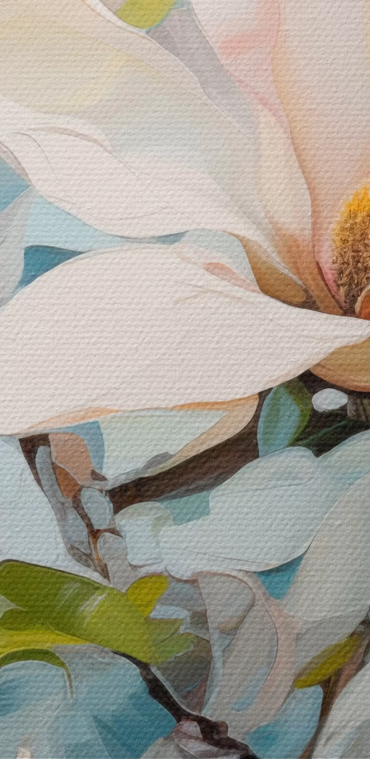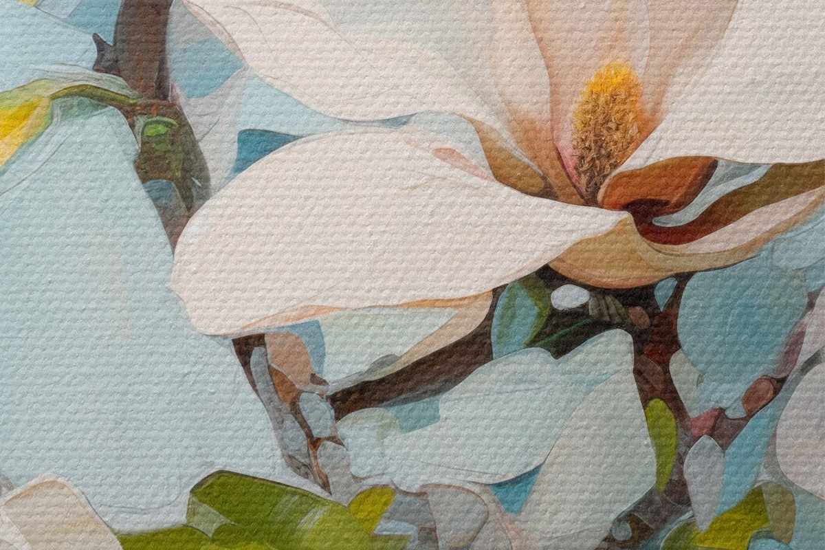 Foto Flores blancas de magnolia, fondo azul claro con suaves pinceladas, estilo pintura al óleo, textura impasto Nr r46277