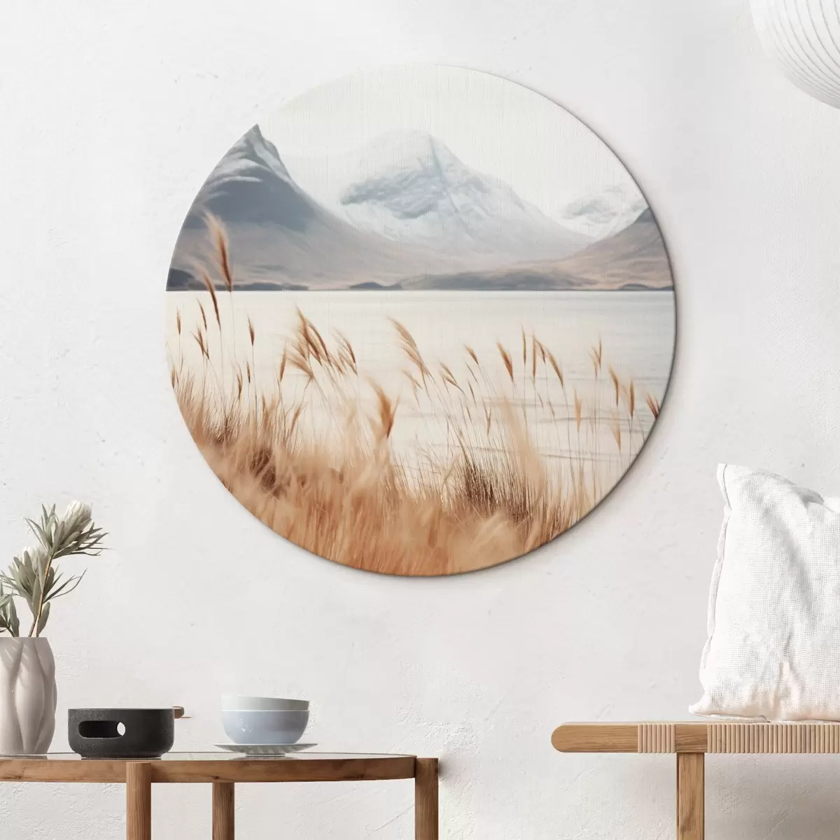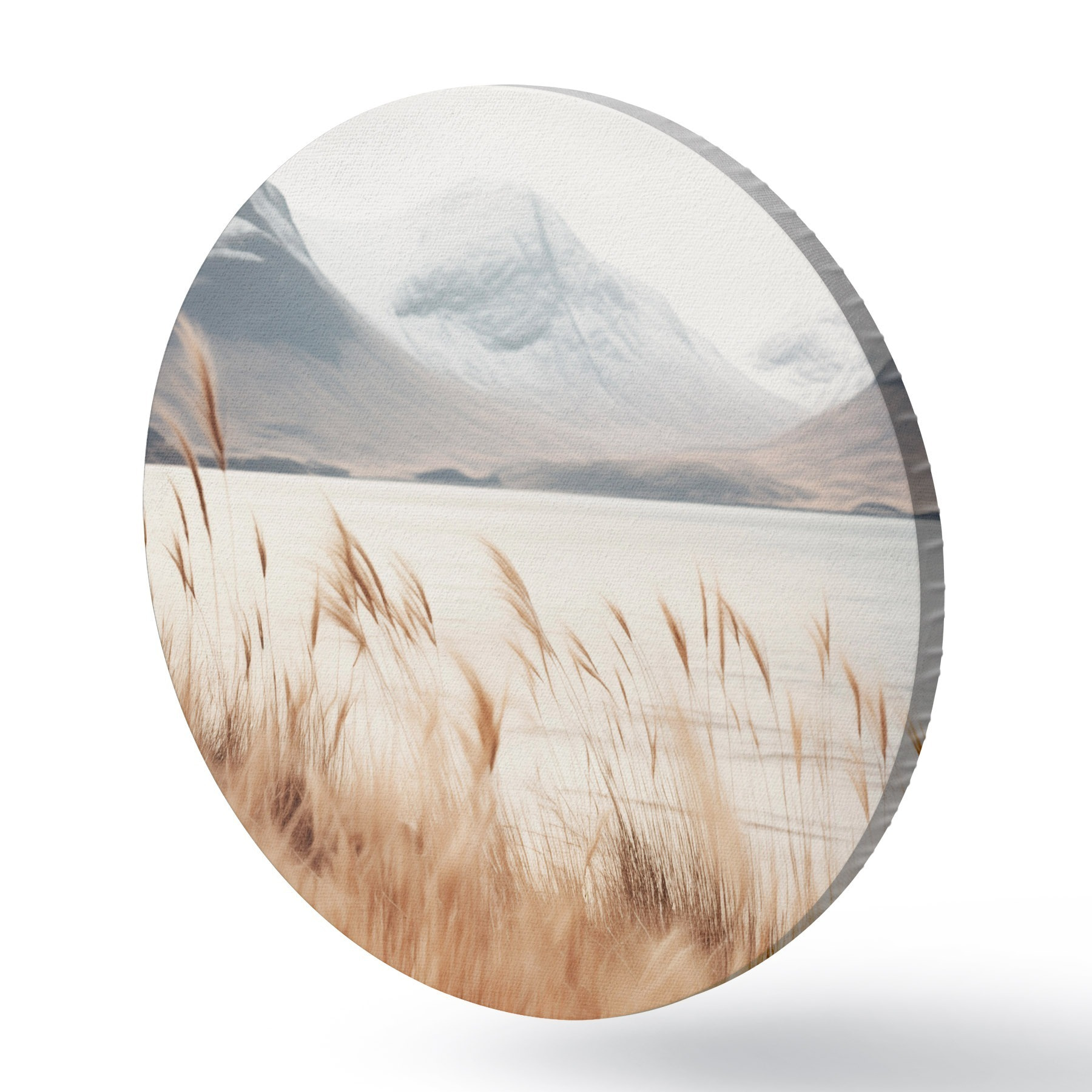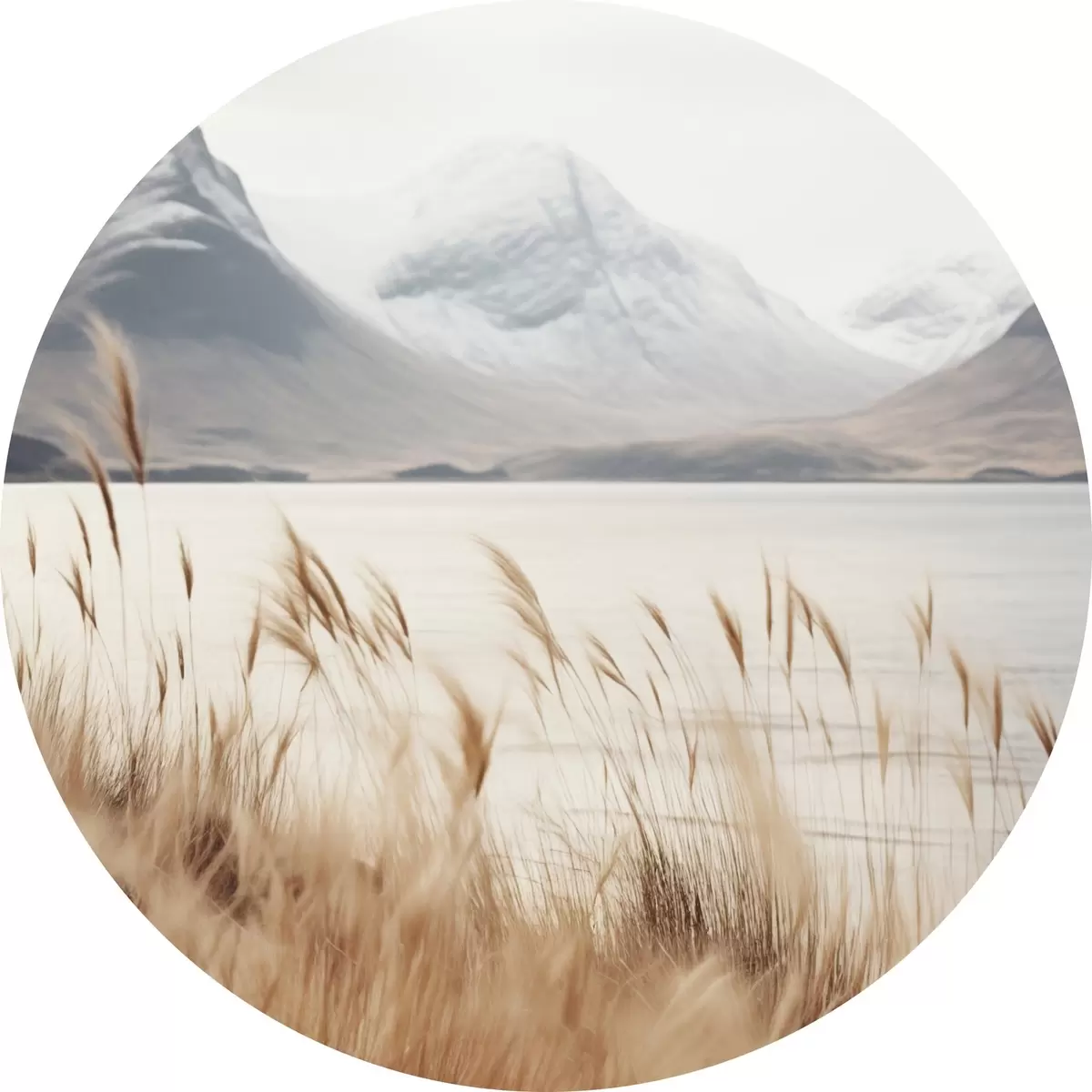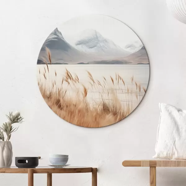 Cuadros redondos Campo de hierba de la pampa frente a un paisaje lacustre con montañas nevadas al fondo, luz suave r46282