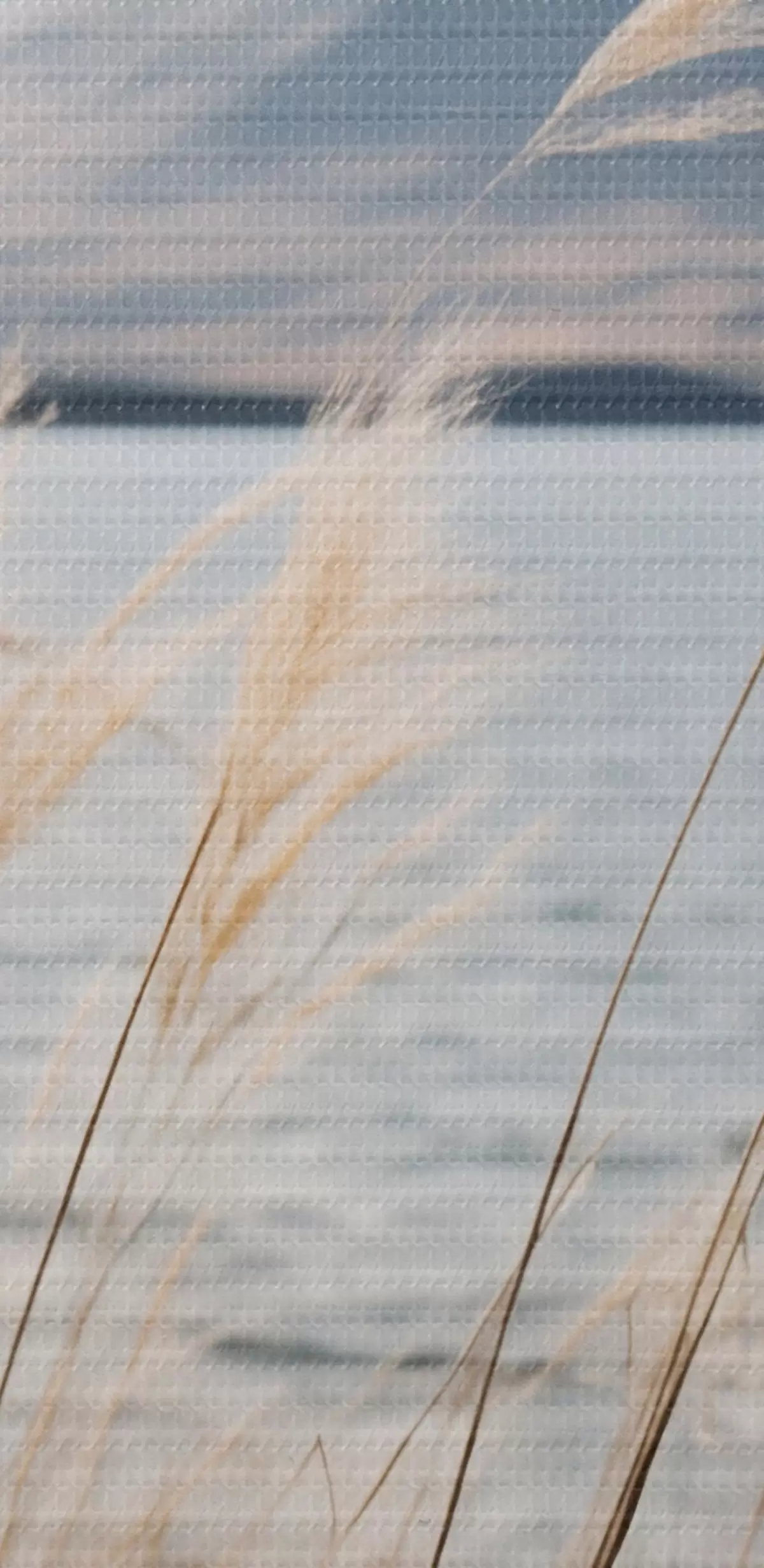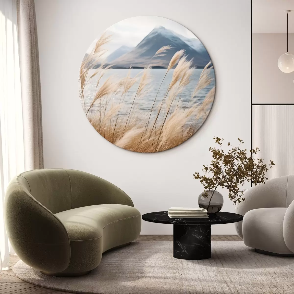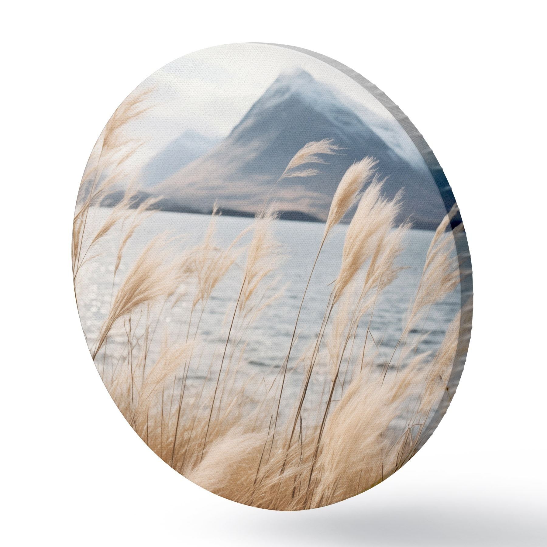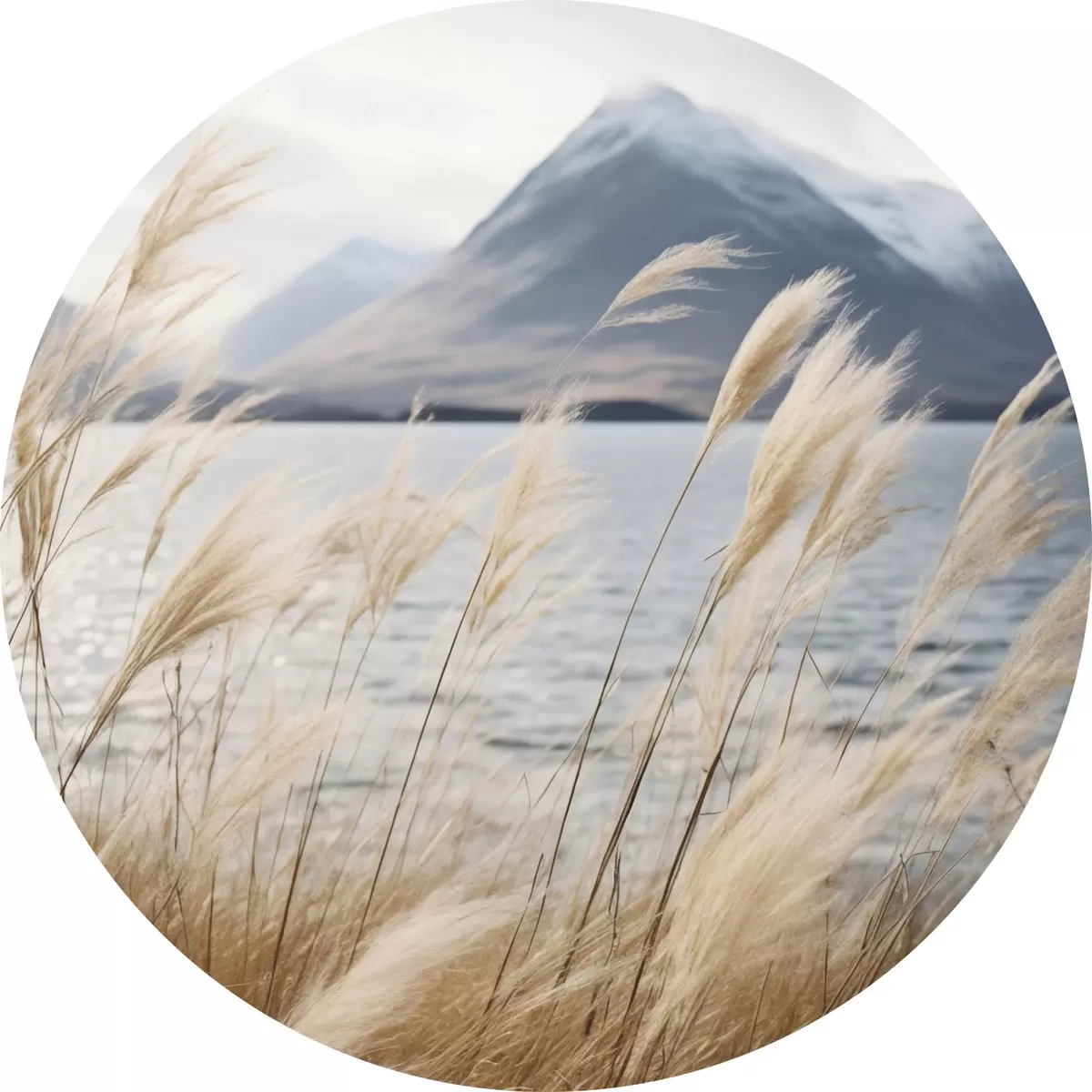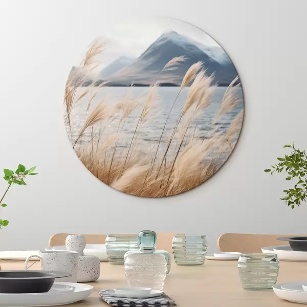 Cuadros redondos Hierba de la pampa con un lago y montañas al fondo, iluminación suave, colores apagados, estilo naturalista r46283