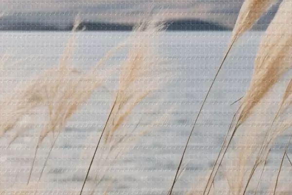 Cuadros redondos Hierba de la pampa con un lago y montañas al fondo, iluminación suave, colores apagados, estilo naturalista r46283