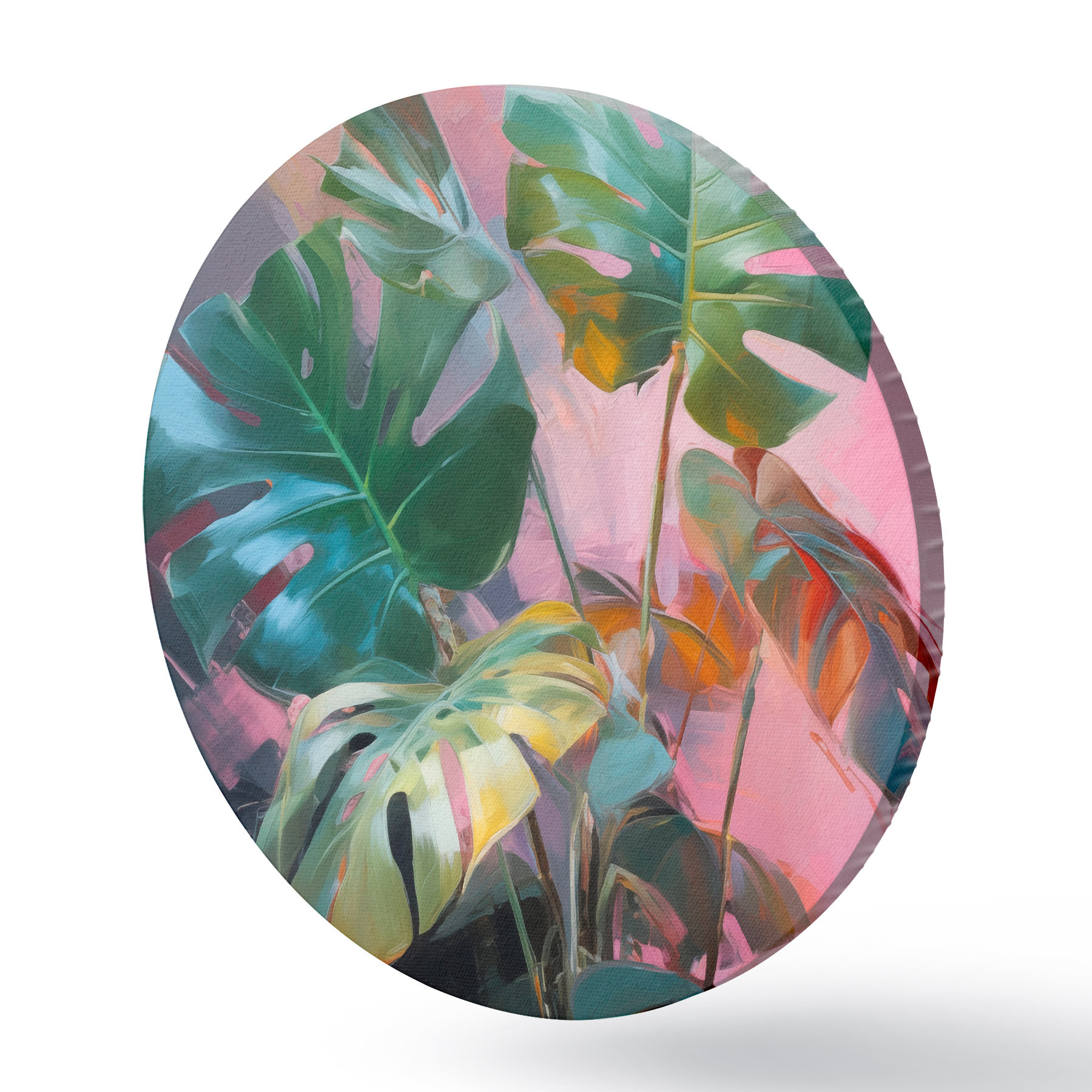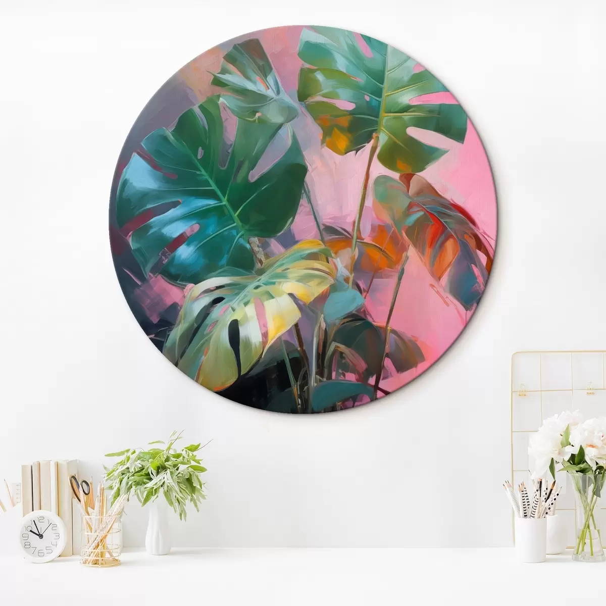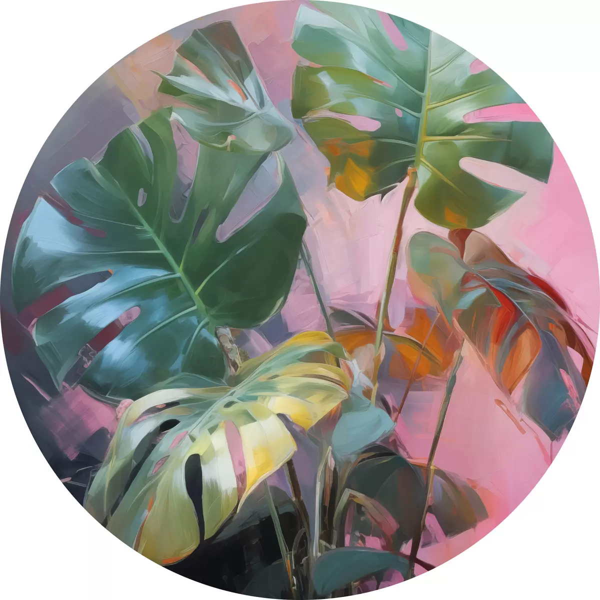 Cuadros redondos Planta monstera abstracta con hojas de un verde intenso, sobre un fondo de suaves tonos rosados y morados r46286