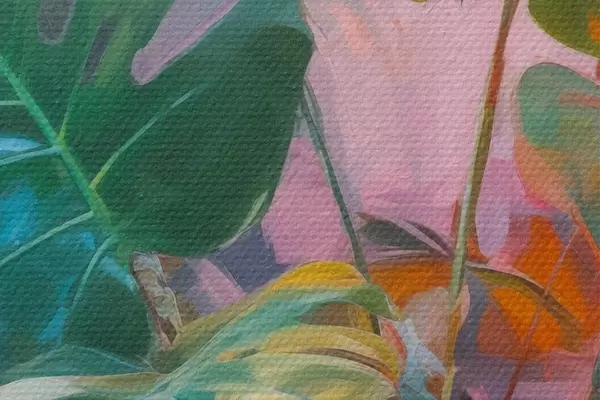 Foto Planta monstera abstracta con hojas de un verde intenso, sobre un fondo de suaves tonos rosados y morados Nr r46286