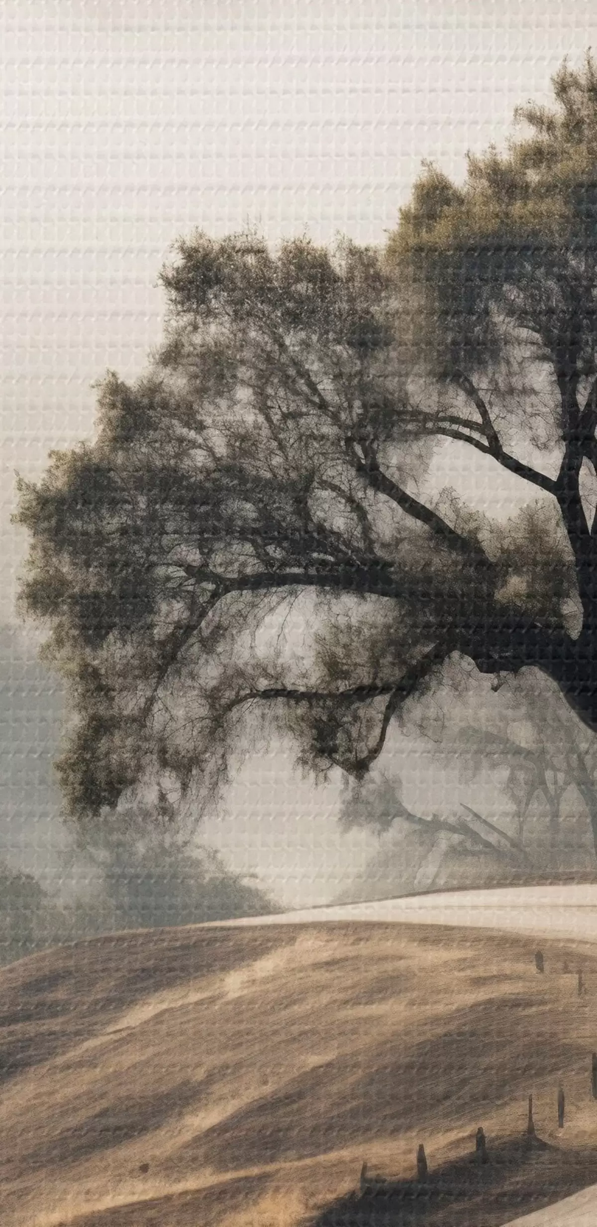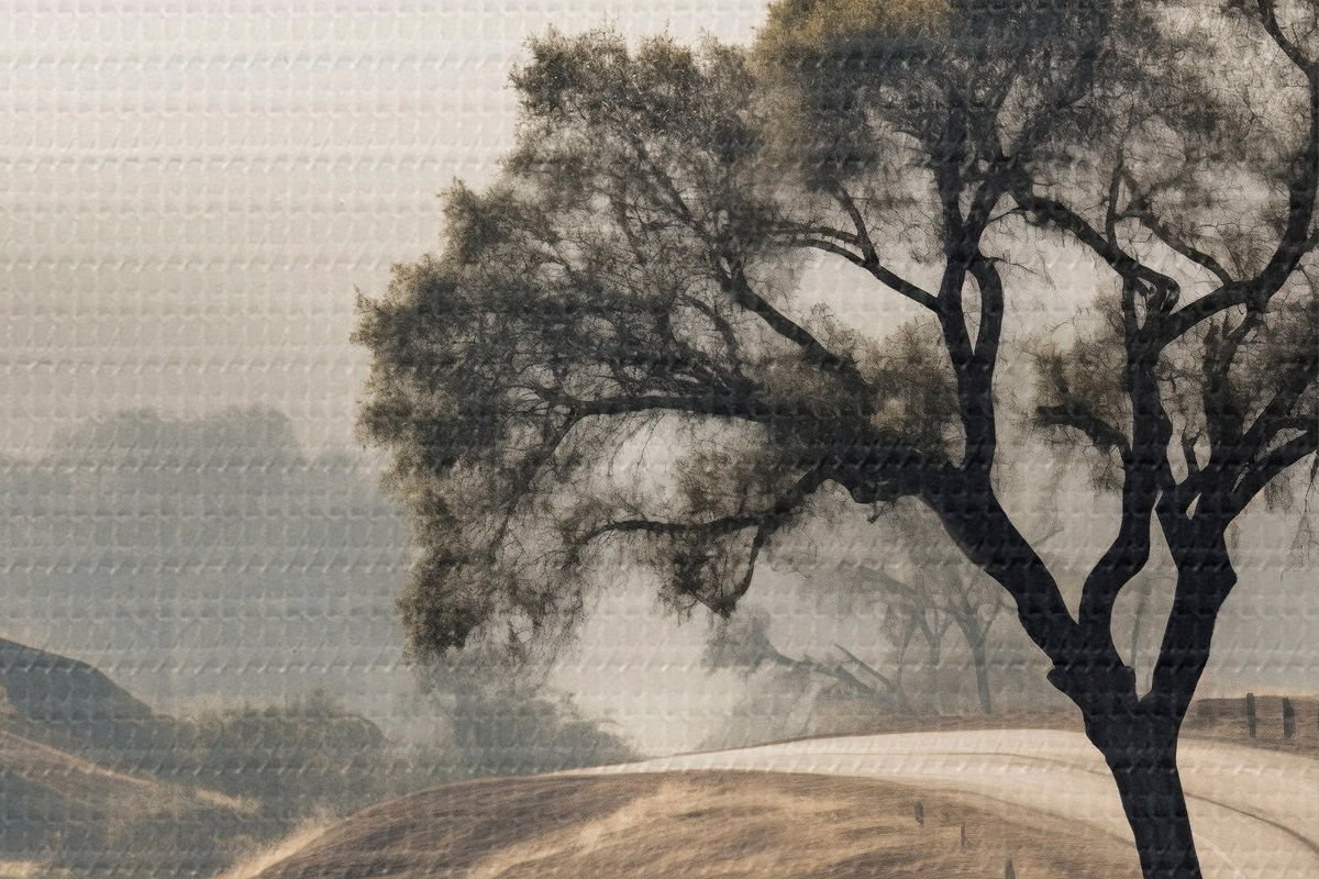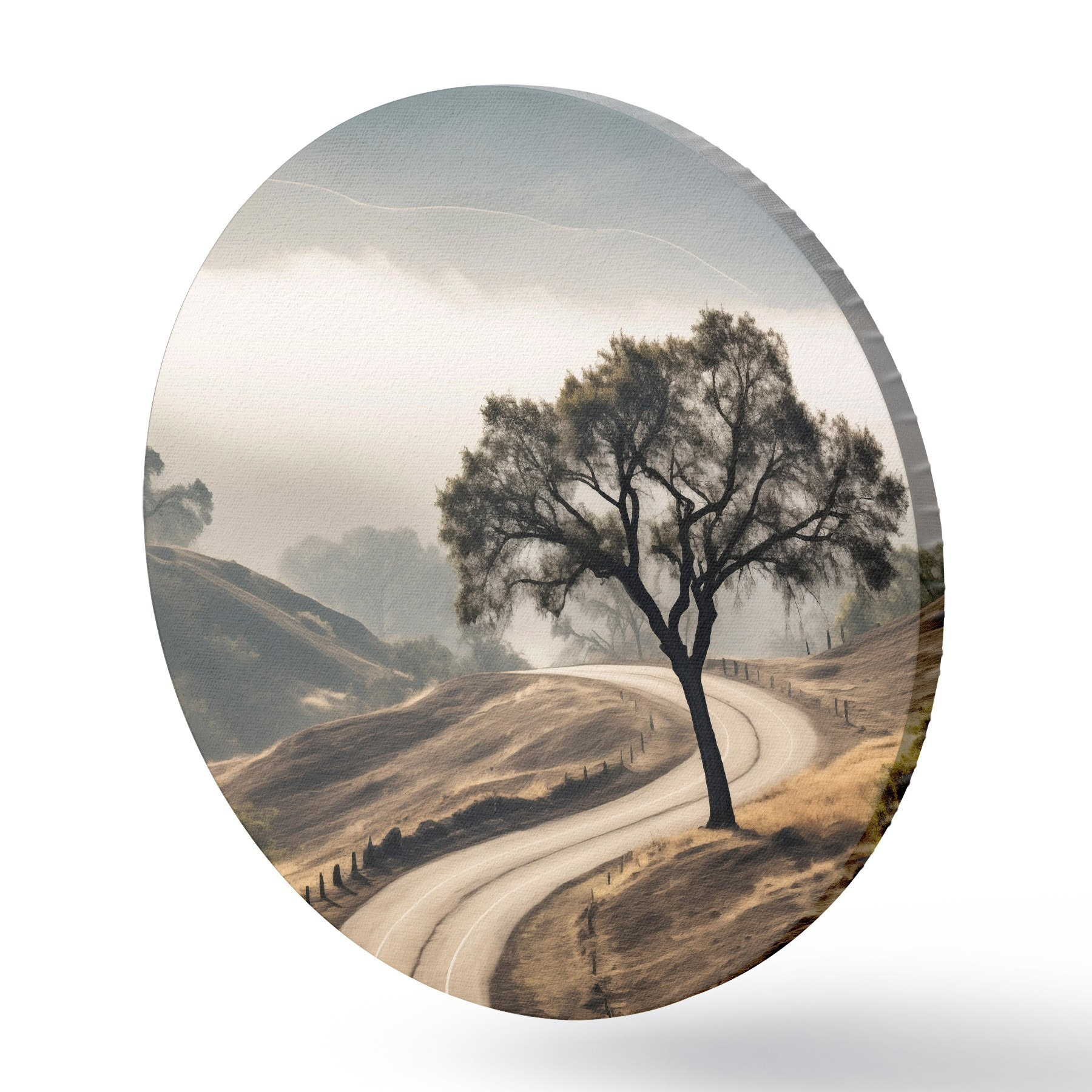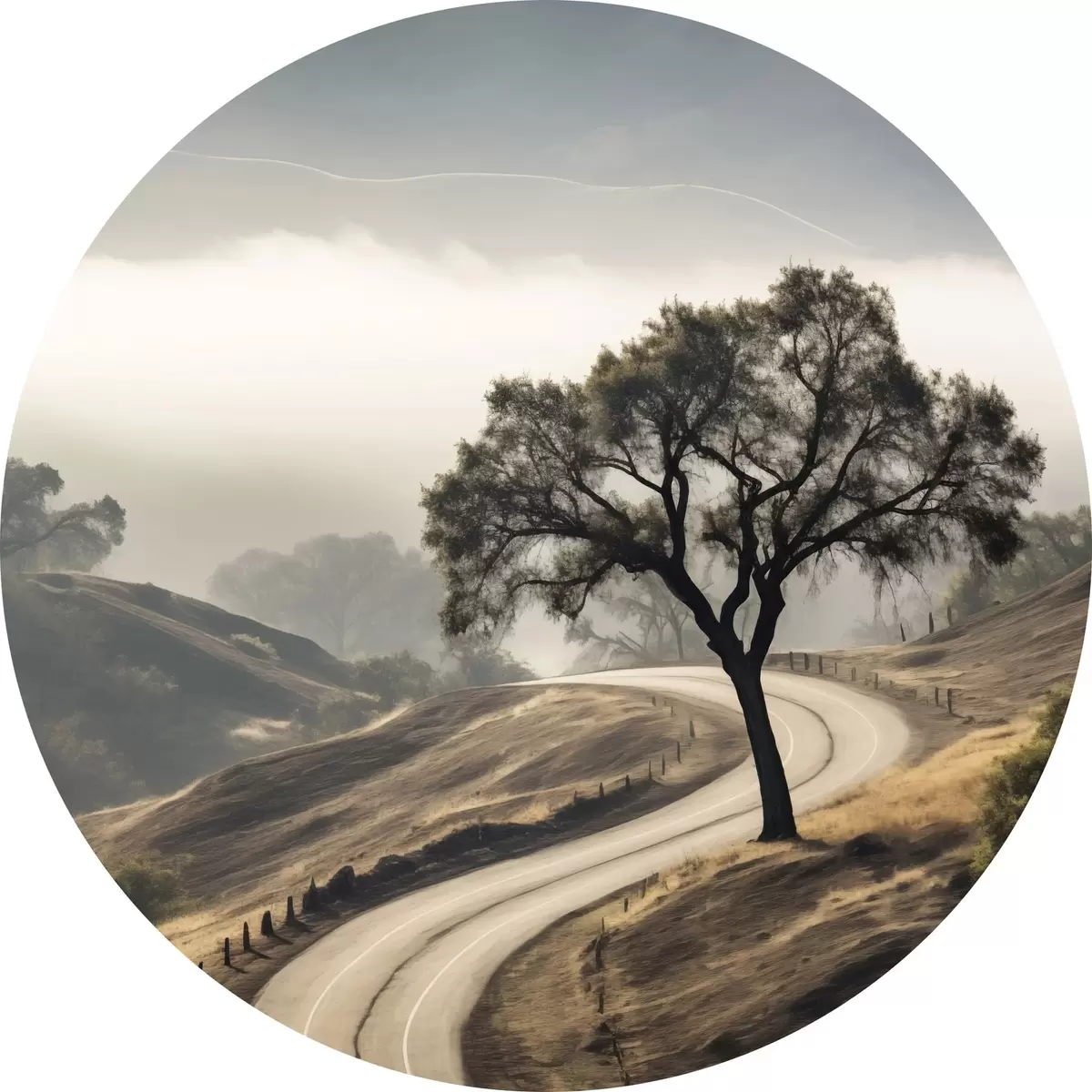Cuadros redondos Una carretera sinuosa que atraviesa colinas onduladas con un árbol en primer plano, y un fondo con niebla y montañas r46288