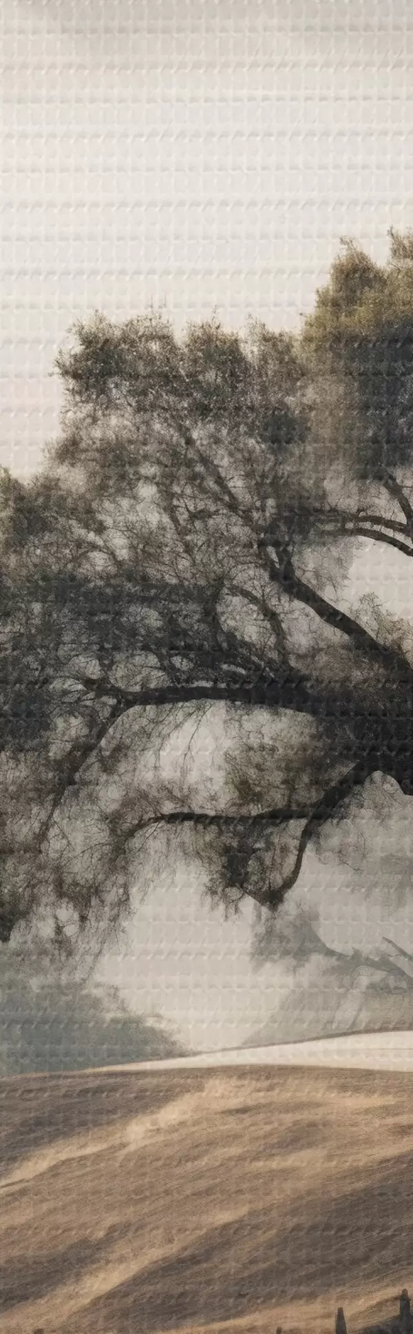 Foto Una carretera sinuosa que atraviesa colinas onduladas con un árbol en primer plano, y un fondo con niebla y montañas Nr r46288