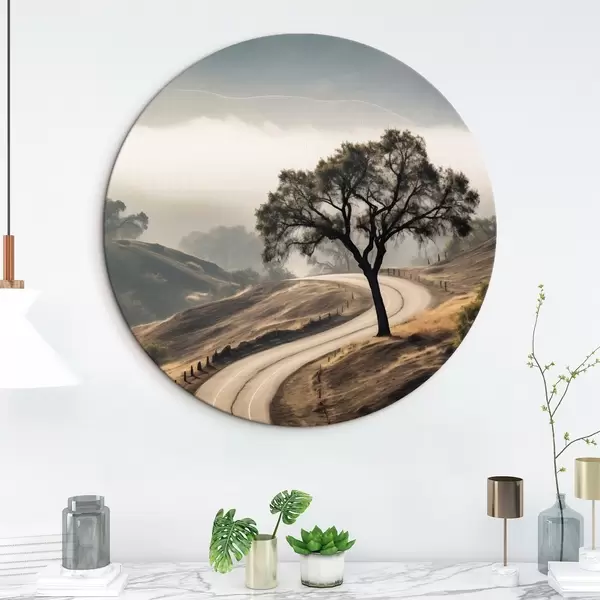 Cuadros redondos Una carretera sinuosa que atraviesa colinas onduladas con un árbol en primer plano, y un fondo con niebla y montañas r46288