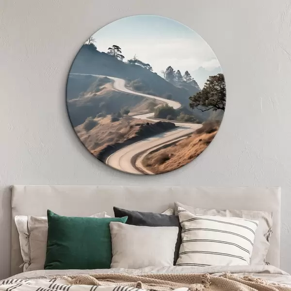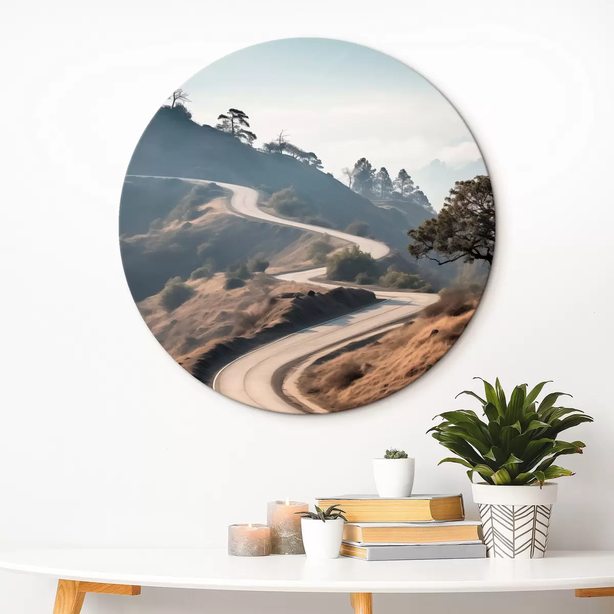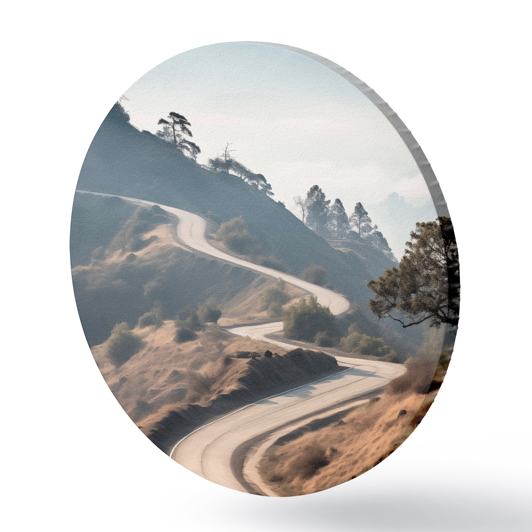 Cuadros redondos Una sinuosa carretera que atraviesa un paisaje montañoso con hierba seca bajo un cielo despejado y montañas en la distancia r46289