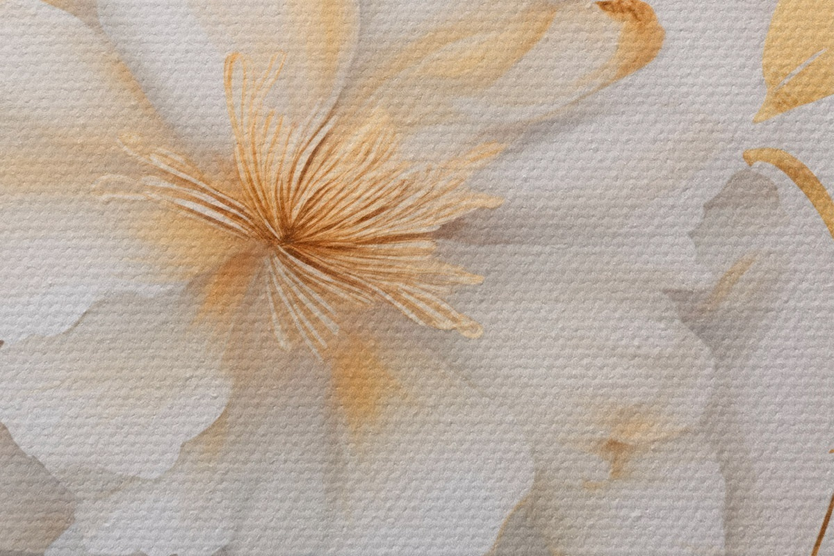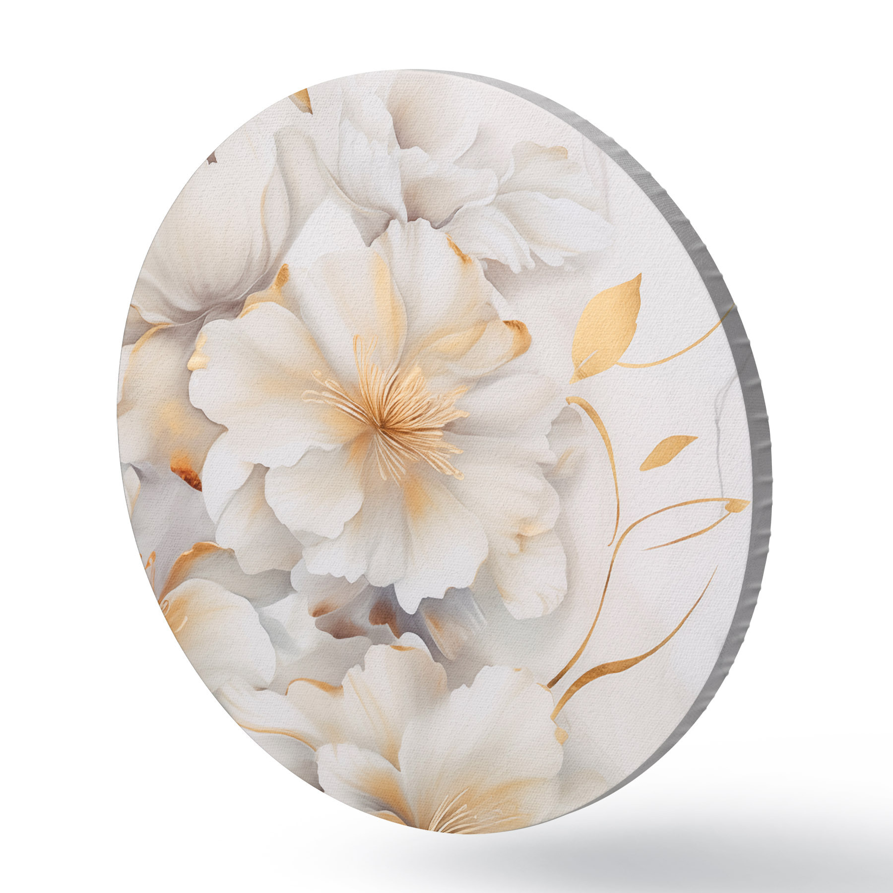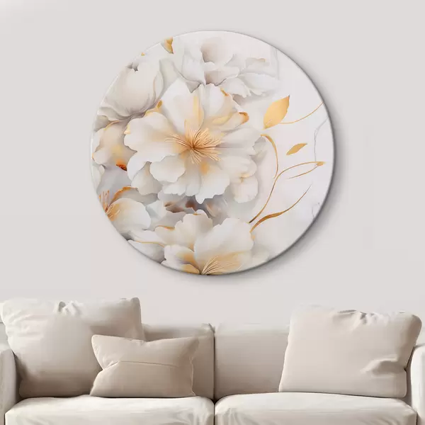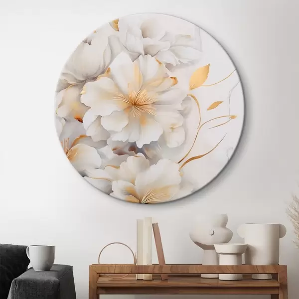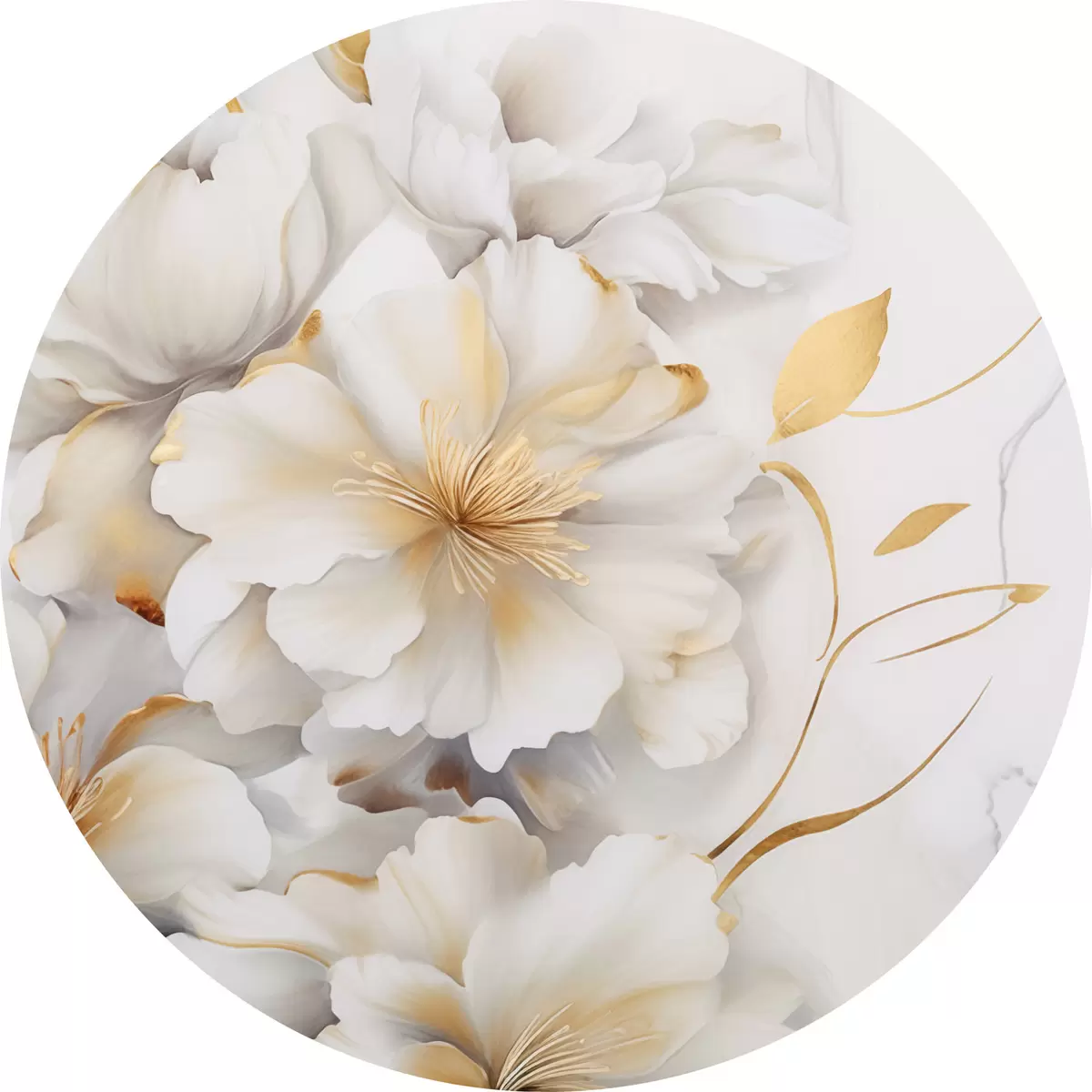 Cuadros redondos Flores blancas con detalles amarillos, pétalos con sombras sutiles, fondo claro con un sutil efecto marmolado r46292