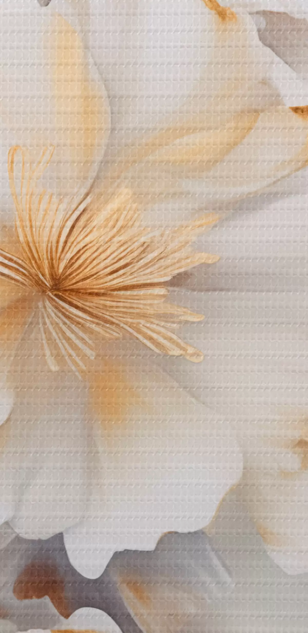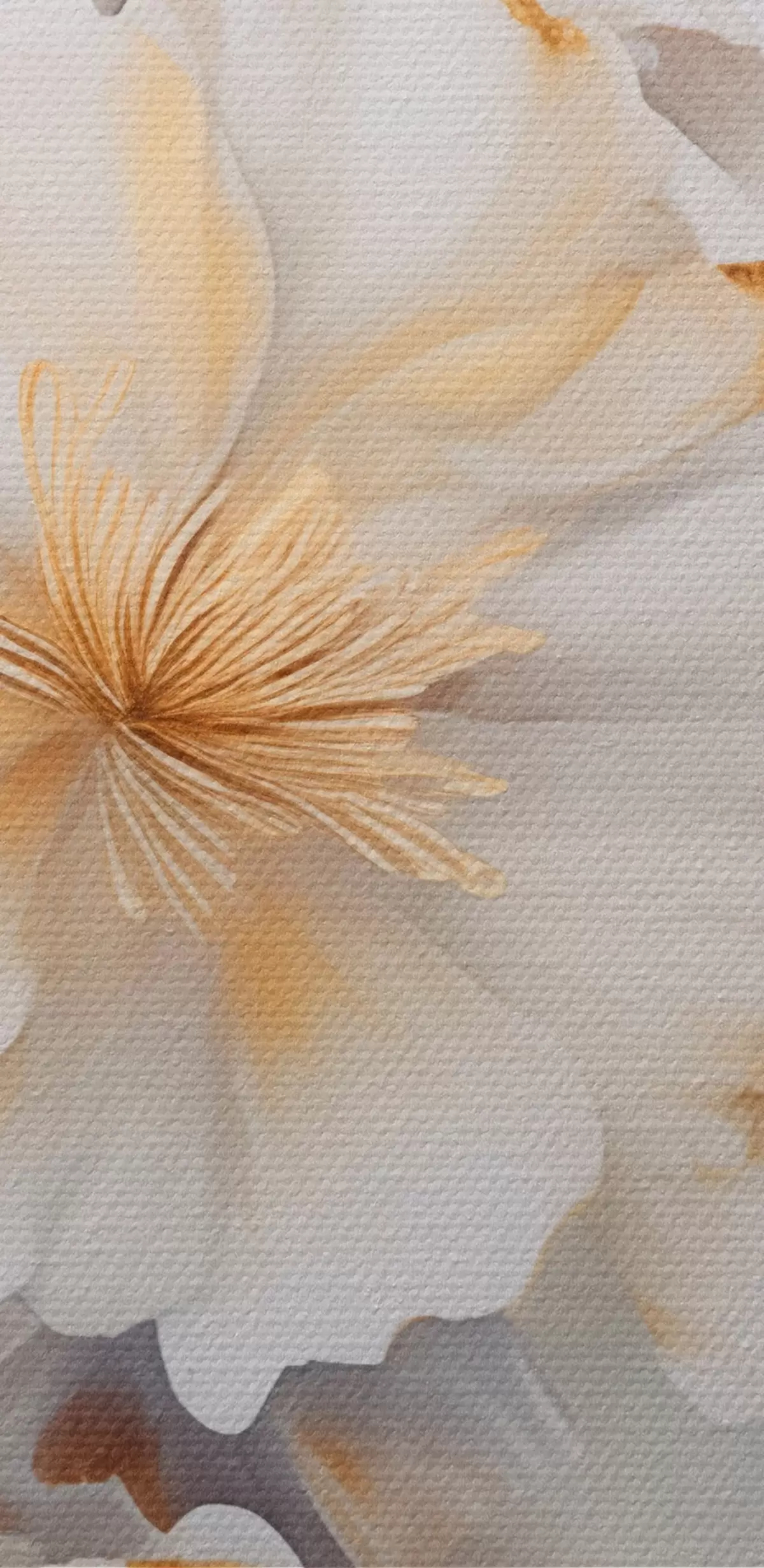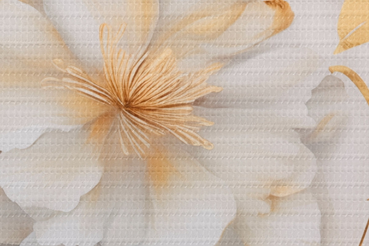 Cuadros redondos Flores blancas con detalles amarillos, pétalos con sombras sutiles, fondo claro con un sutil efecto marmolado r46292