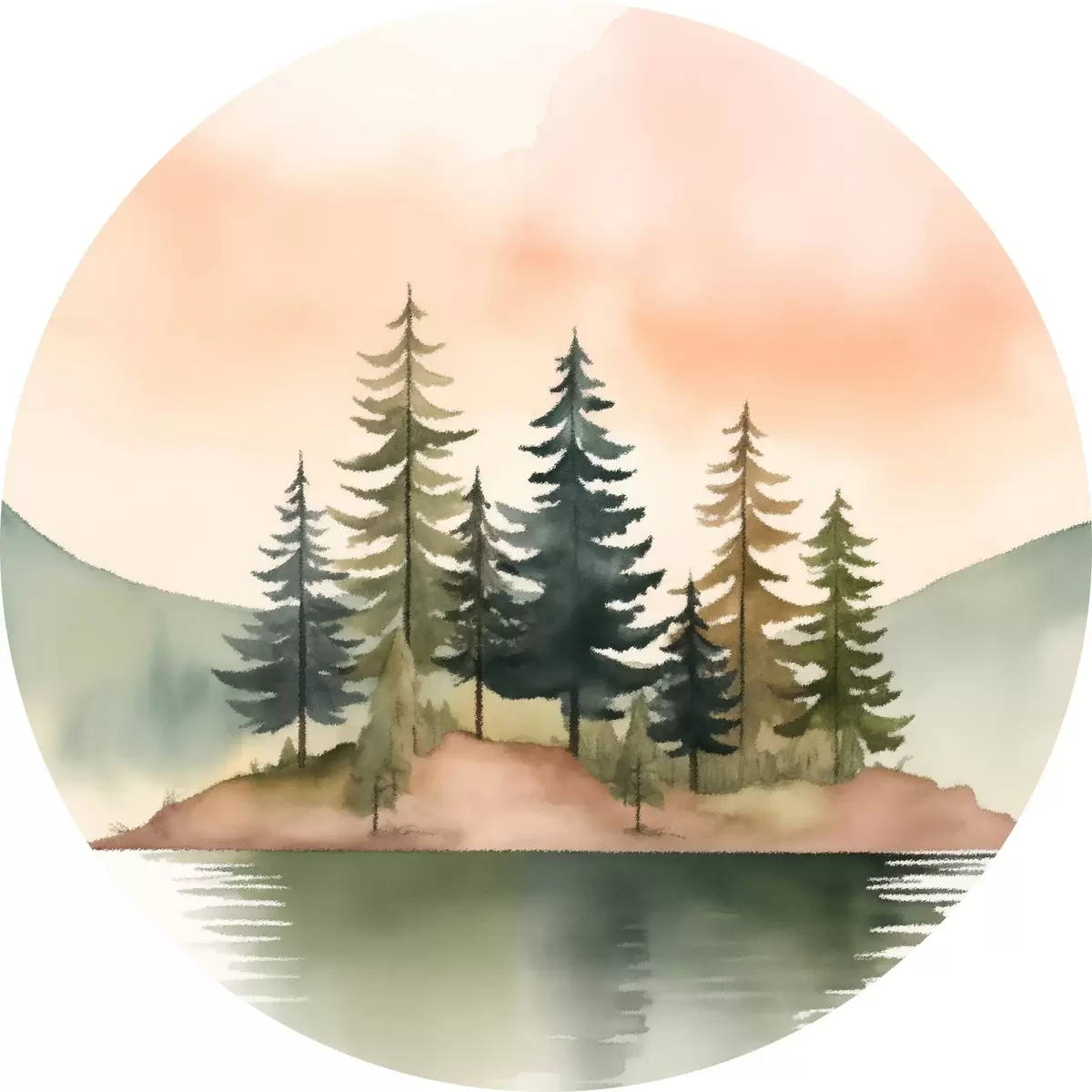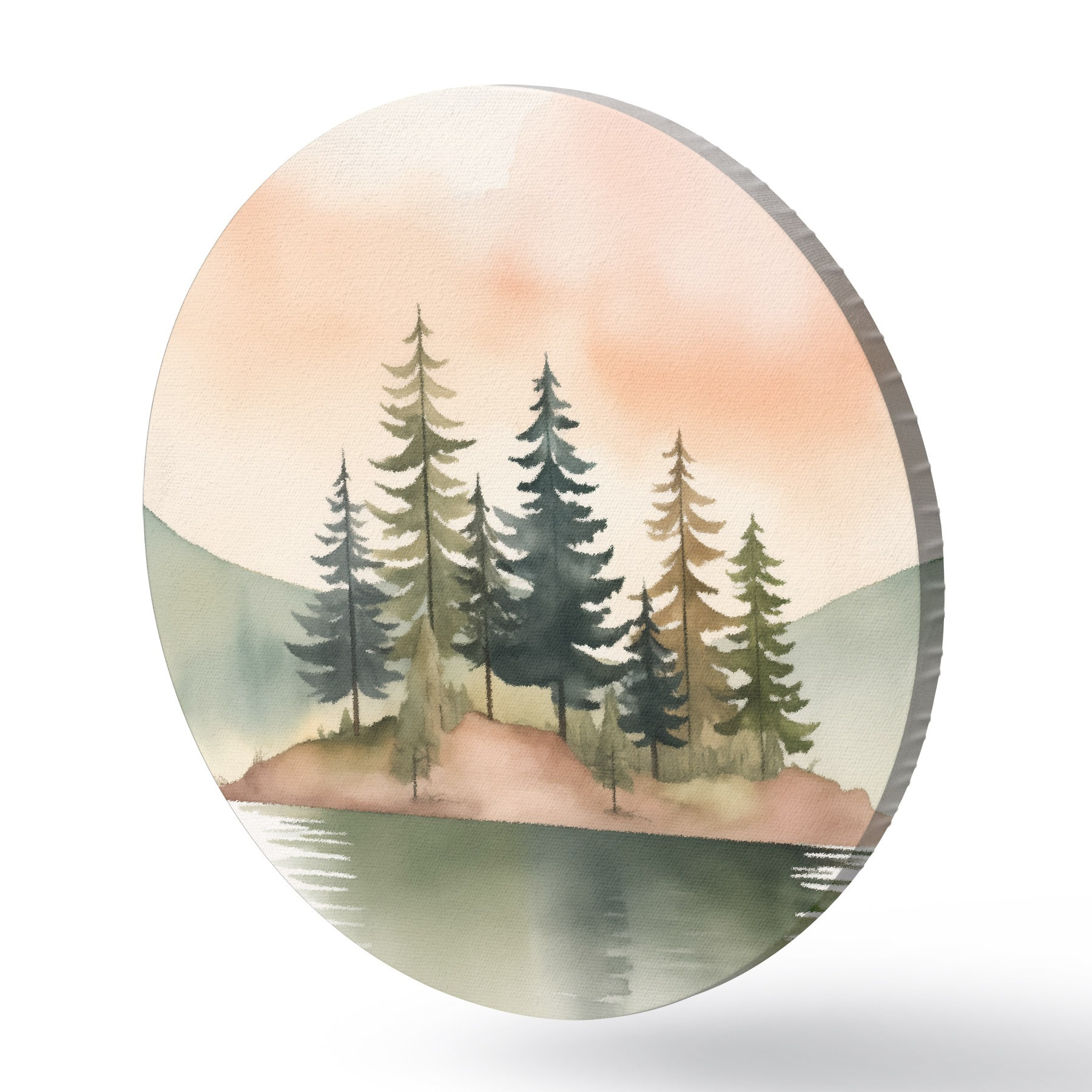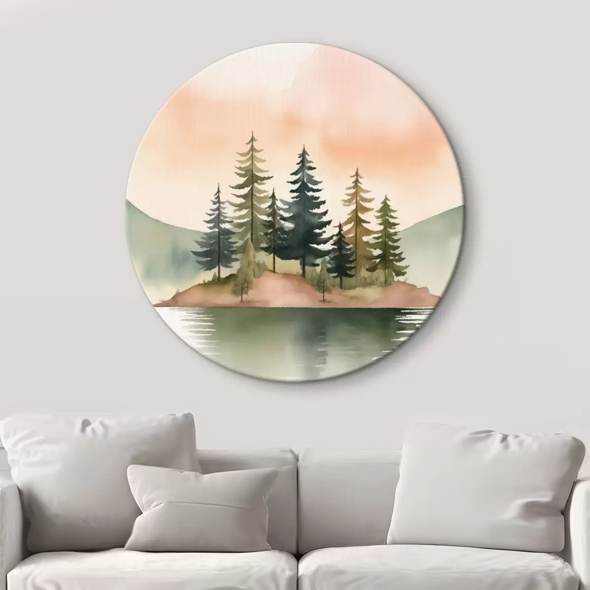 Cuadros redondos Pinos acuarelados en un islote brumoso, cielo suave color melocotón r46505