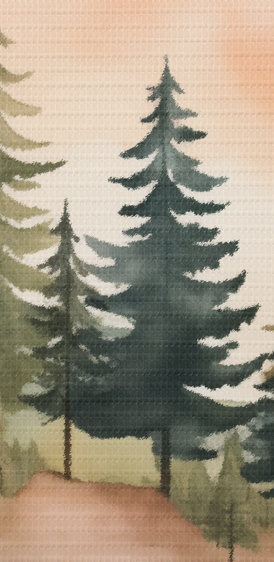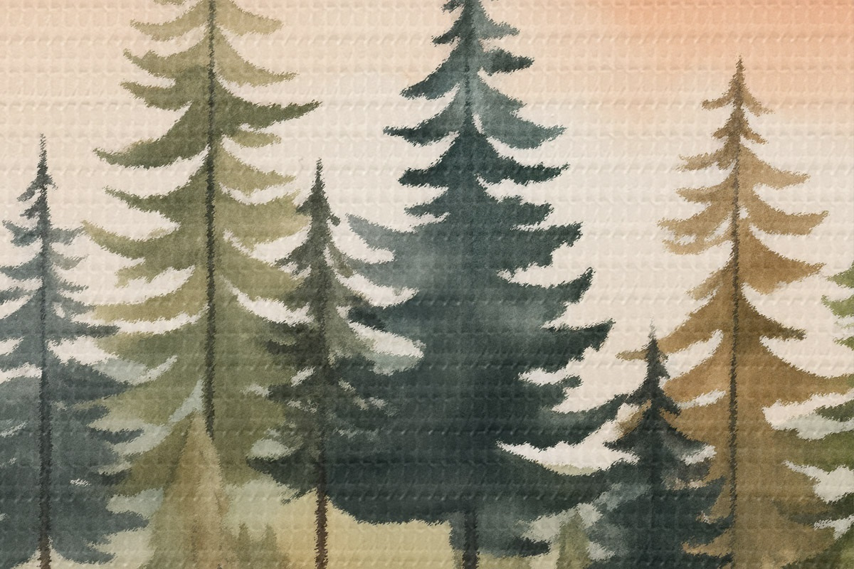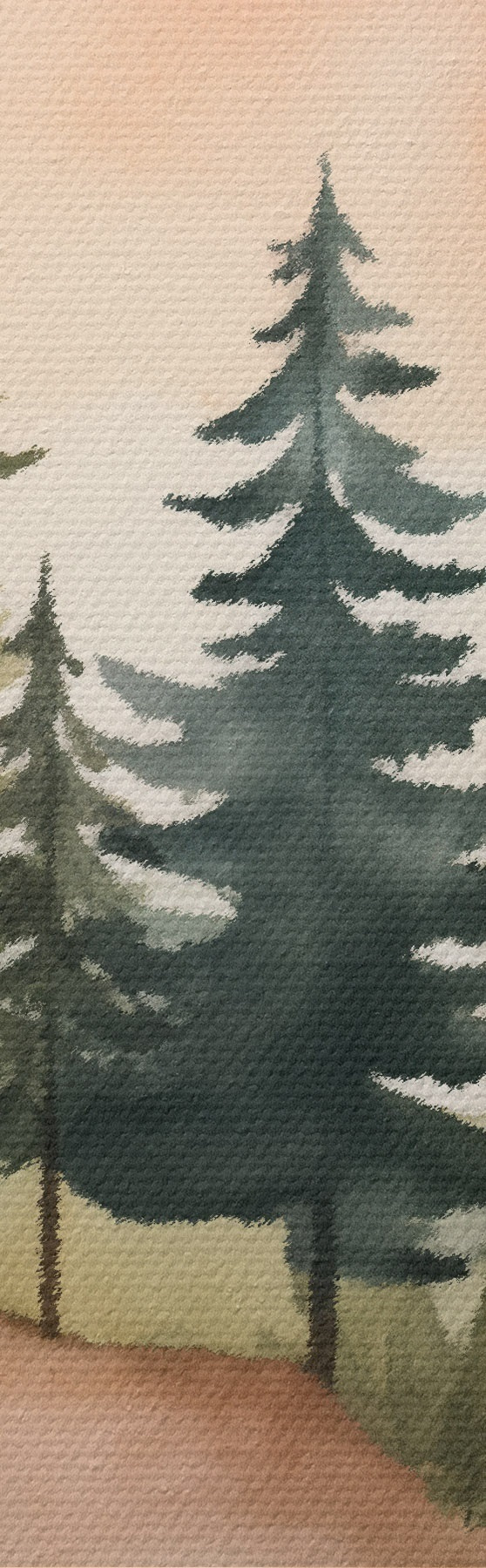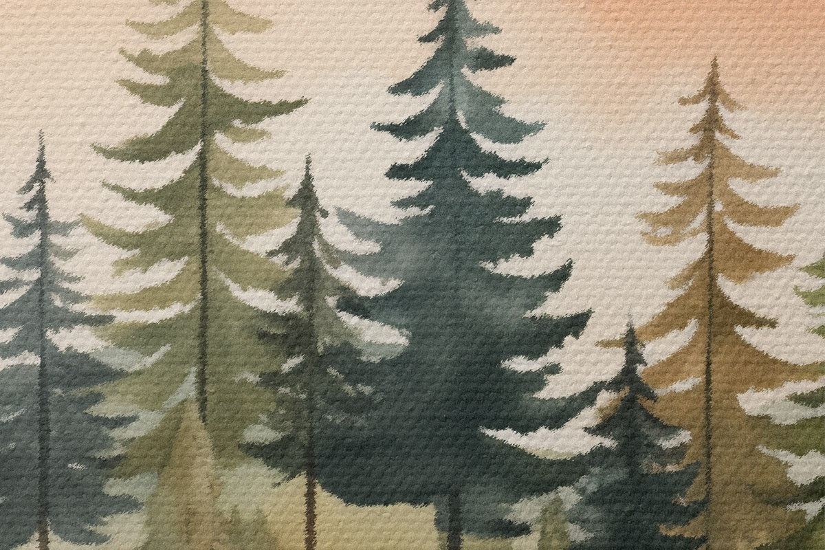 Foto Pinos acuarelados en un islote brumoso, cielo suave color melocotón Nr r46505