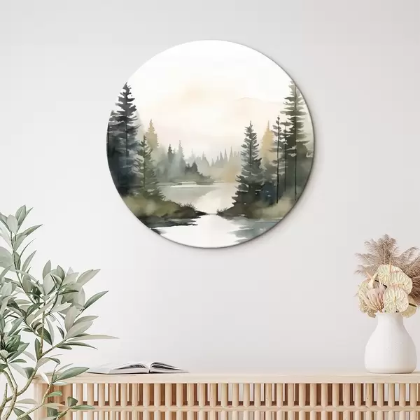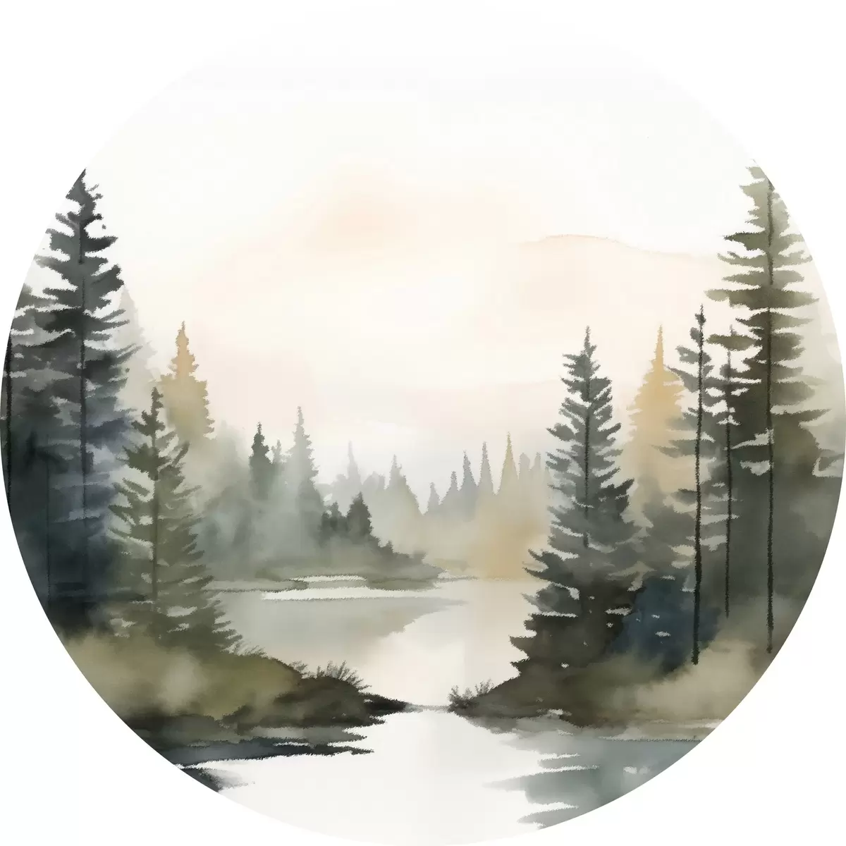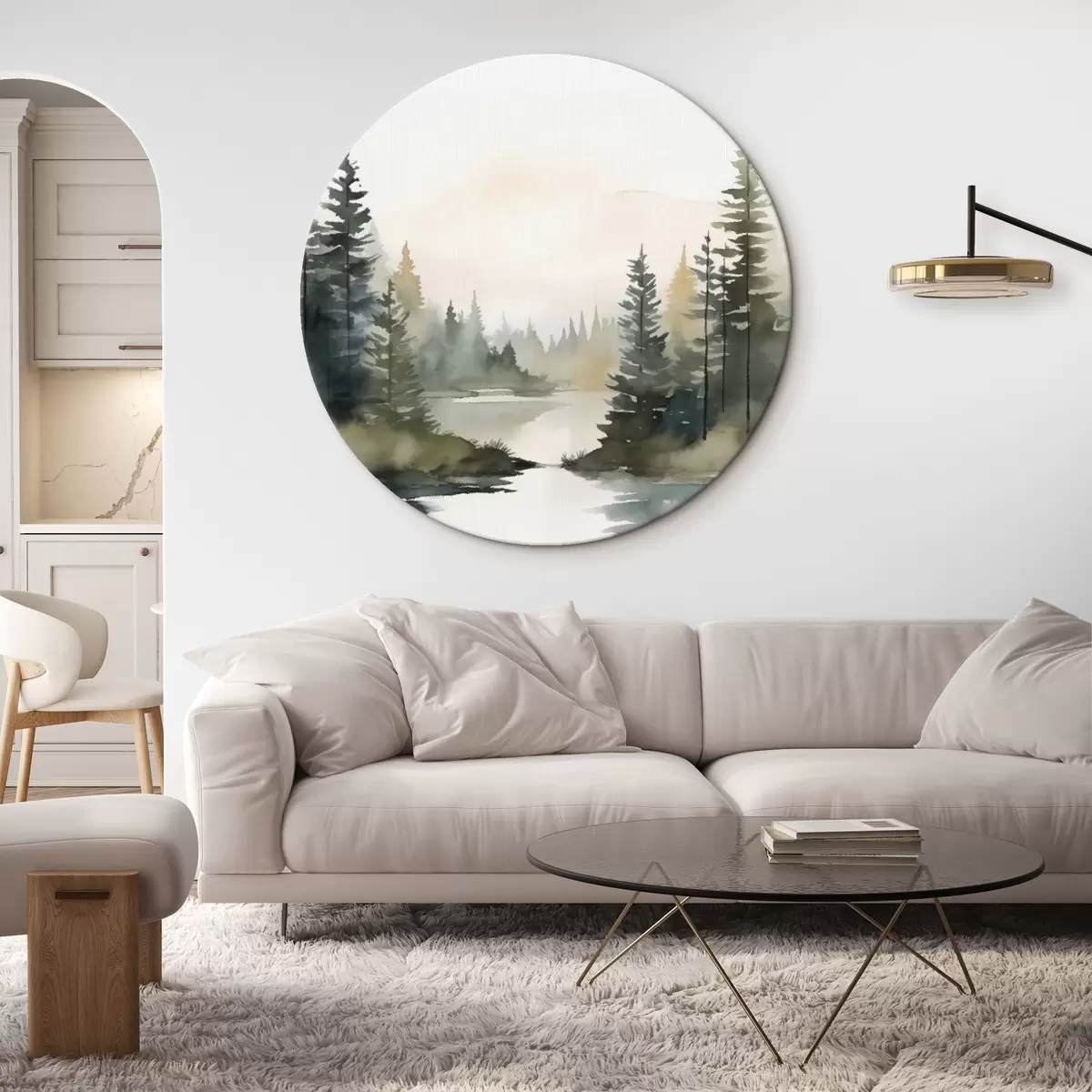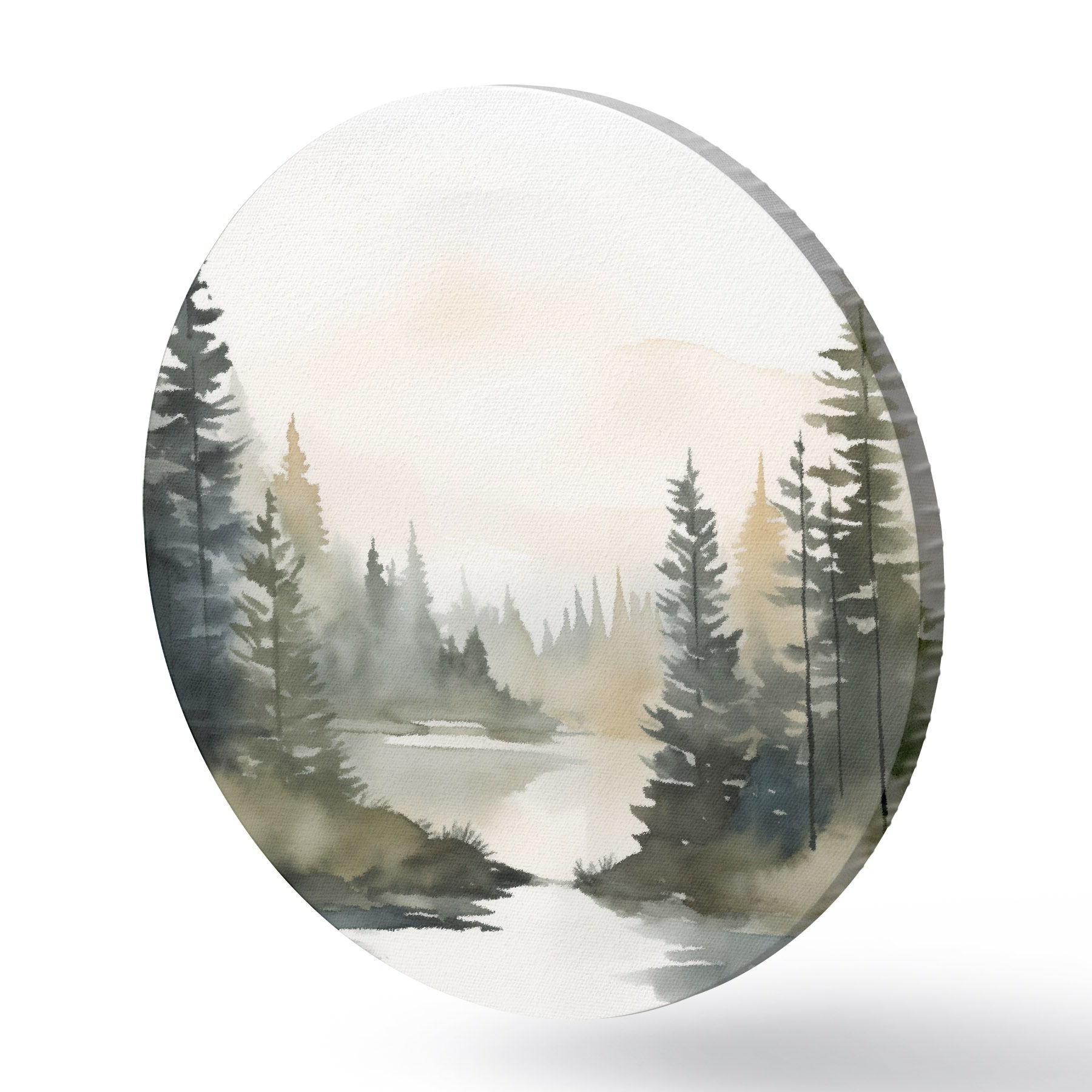 Cuadros redondos Bosque brumoso de coníferas sobre un río tranquilo, estilo acuarela r46507