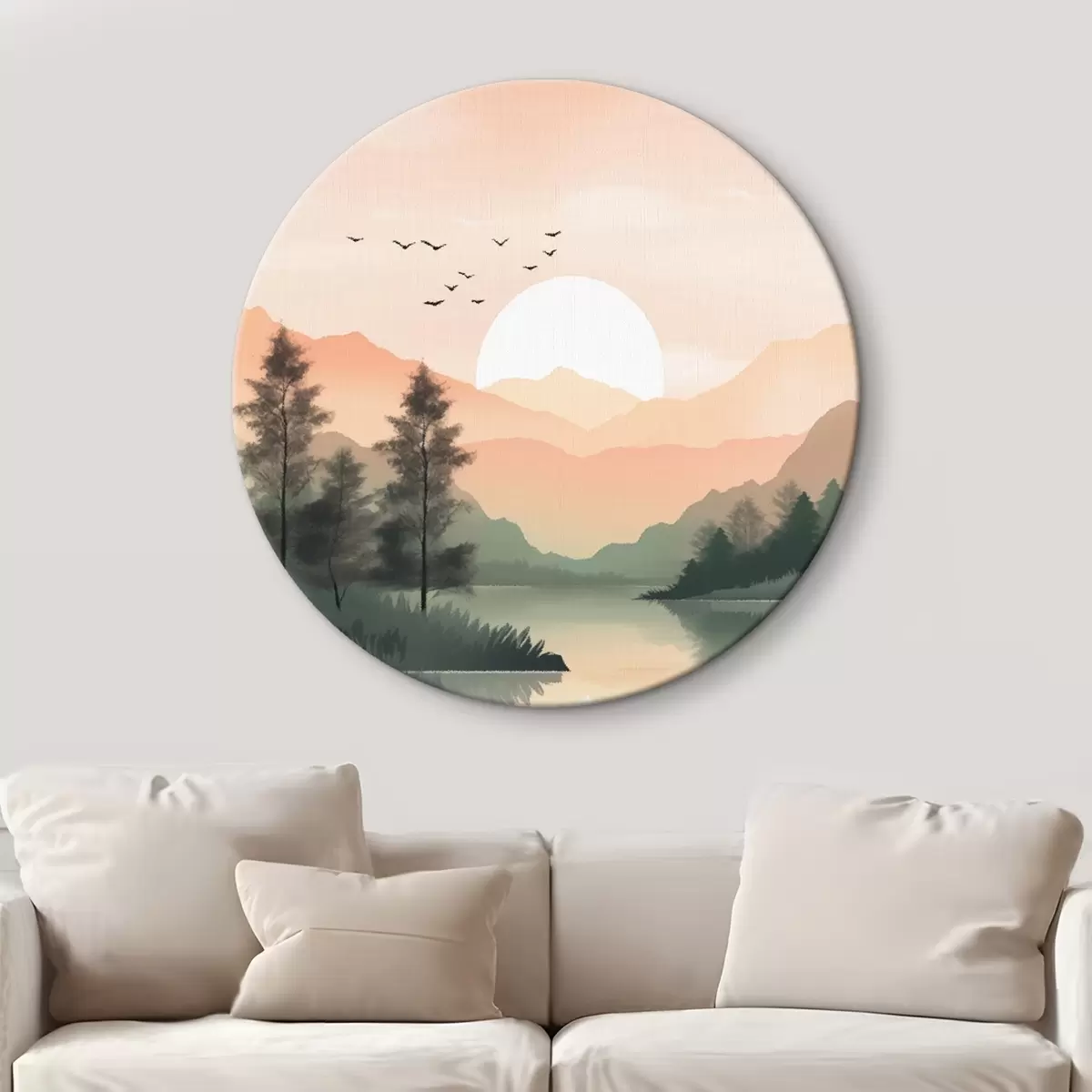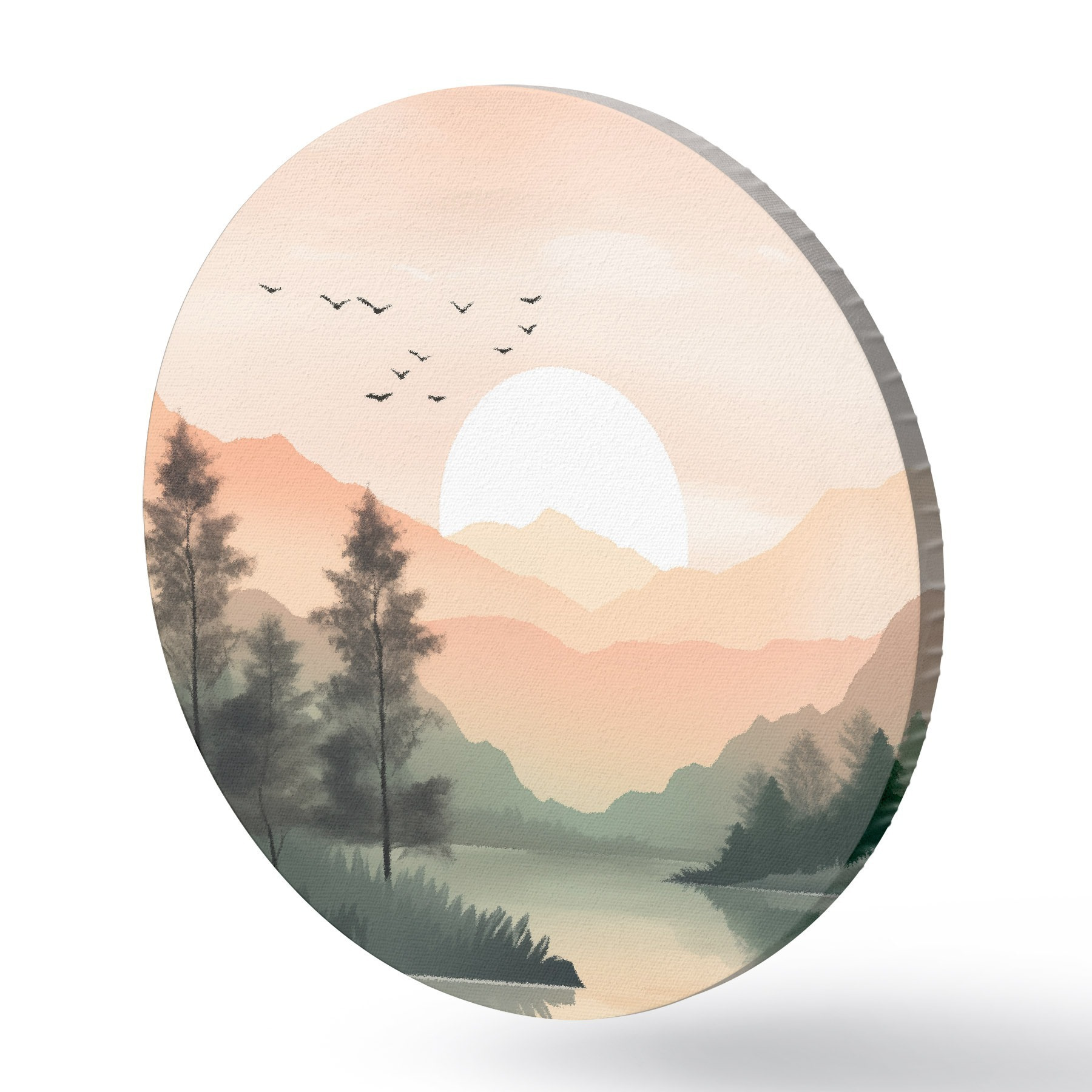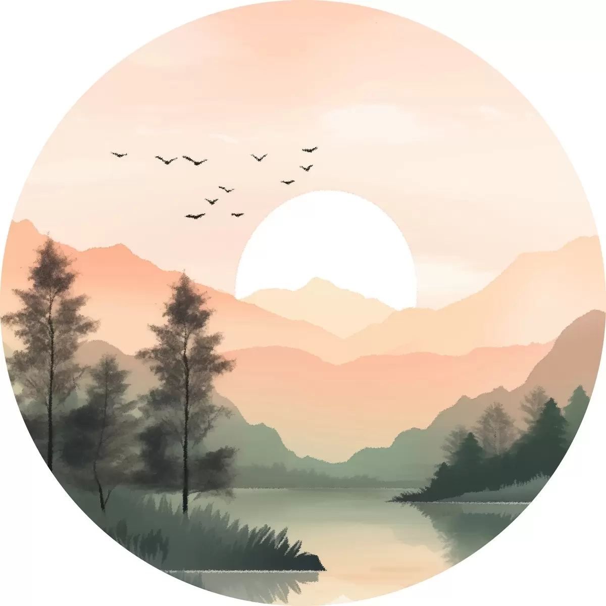 Cuadros redondos Puesta de sol en tonos pastel sobre un lago tranquilo con colinas lejanas y pájaros r46508