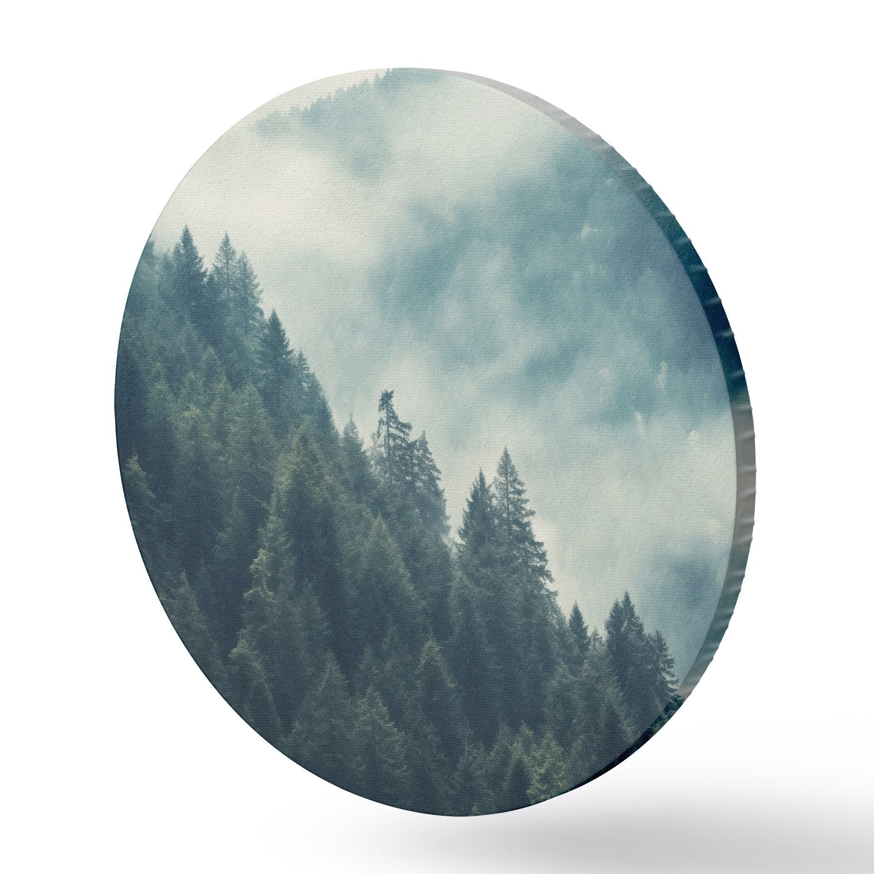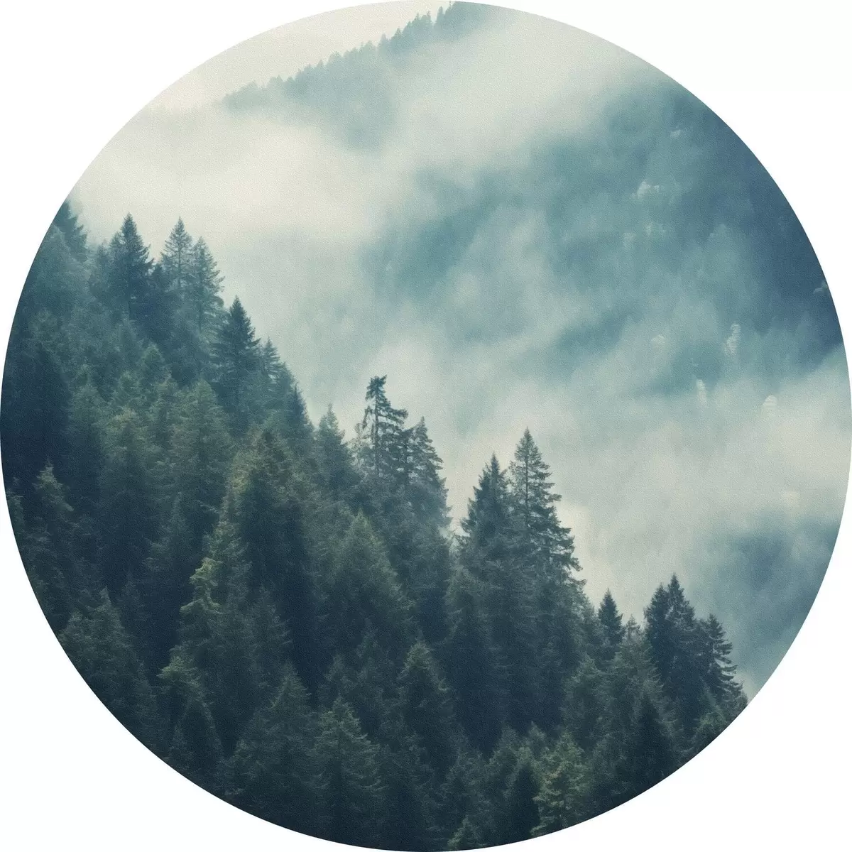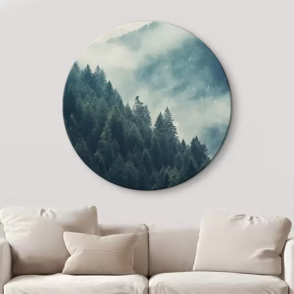 Cuadros redondos Crestas montañosas brumosas y bosques oscuros de coníferas r46518