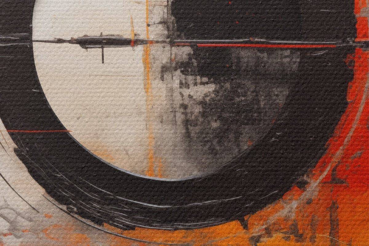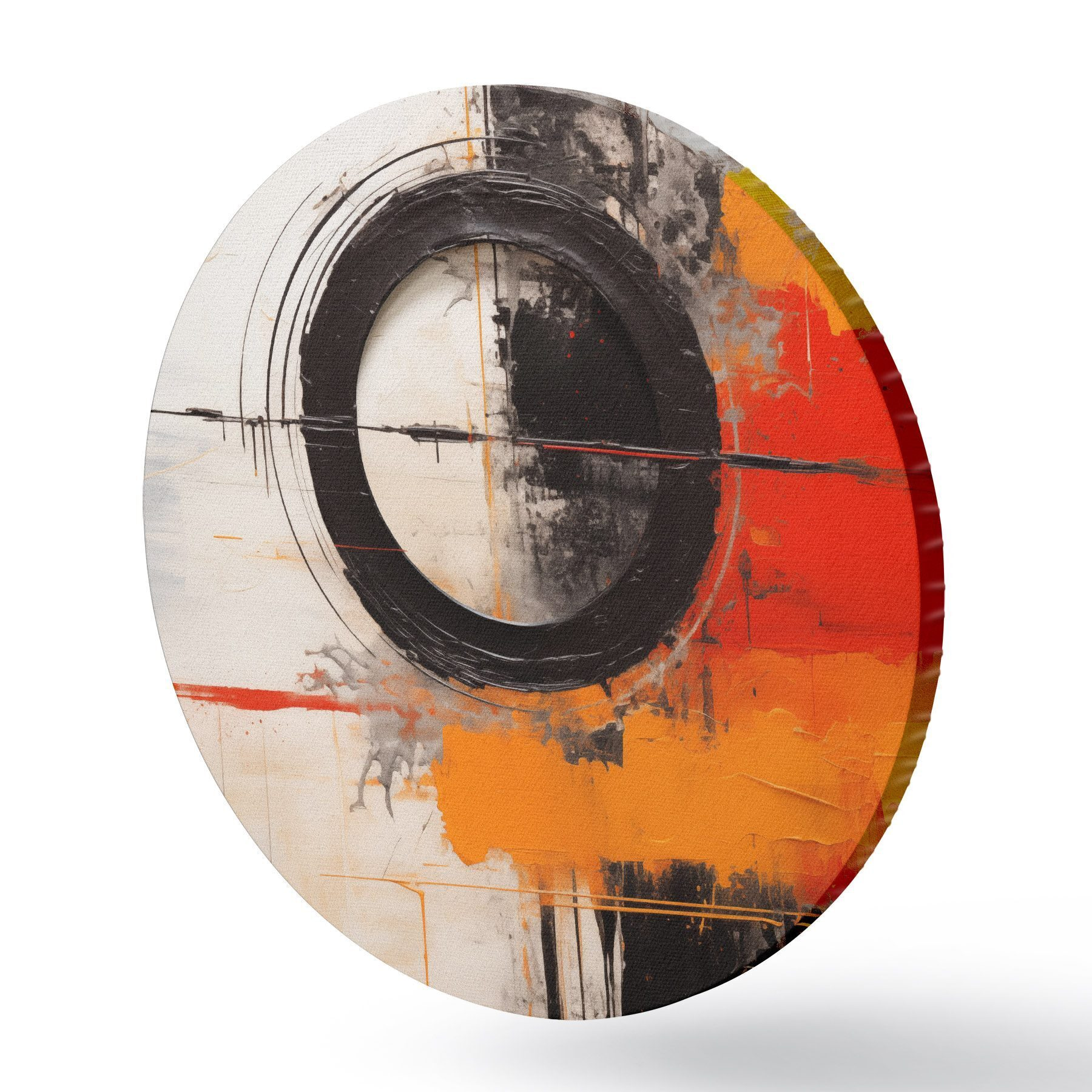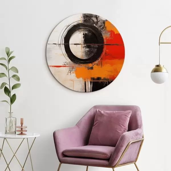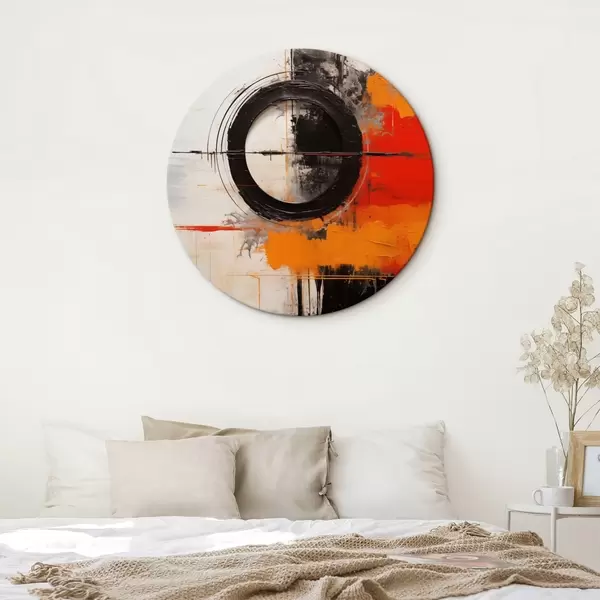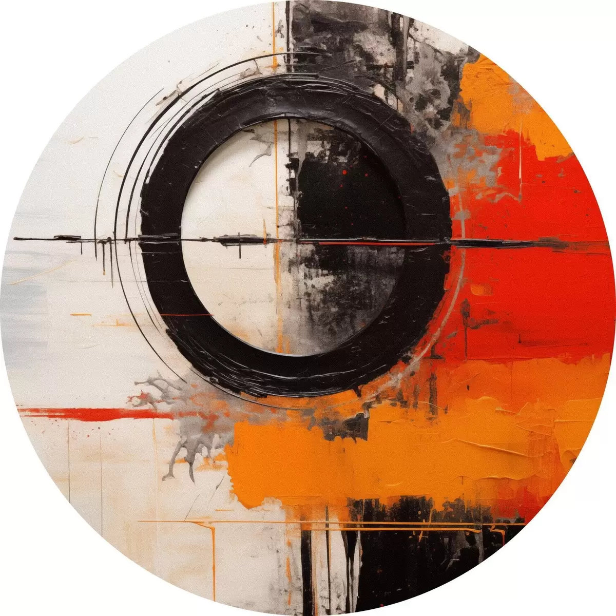 Cuadros redondos Círculo negro sobre fondo blanco, trazos y salpicaduras naranjas r46549