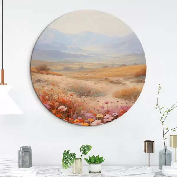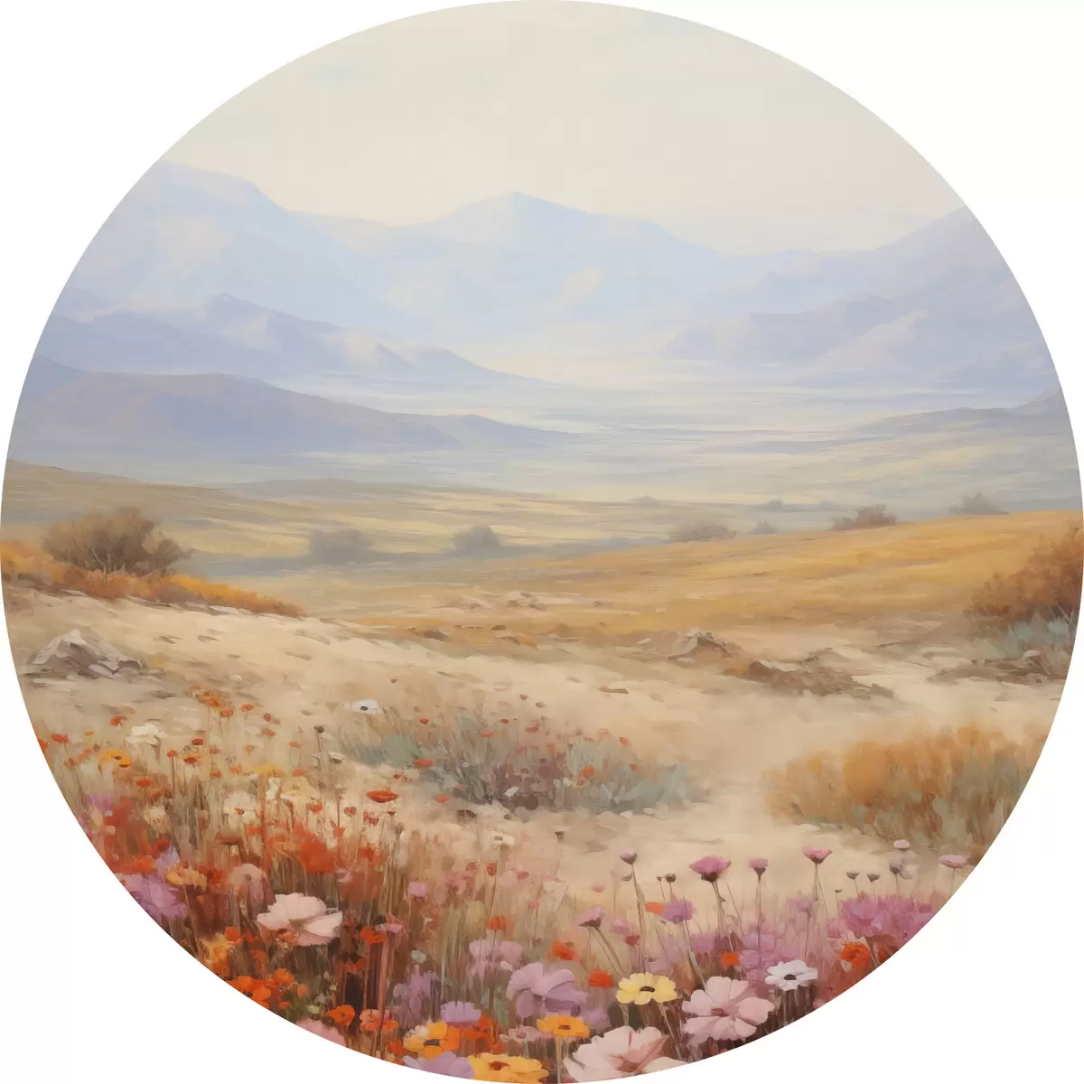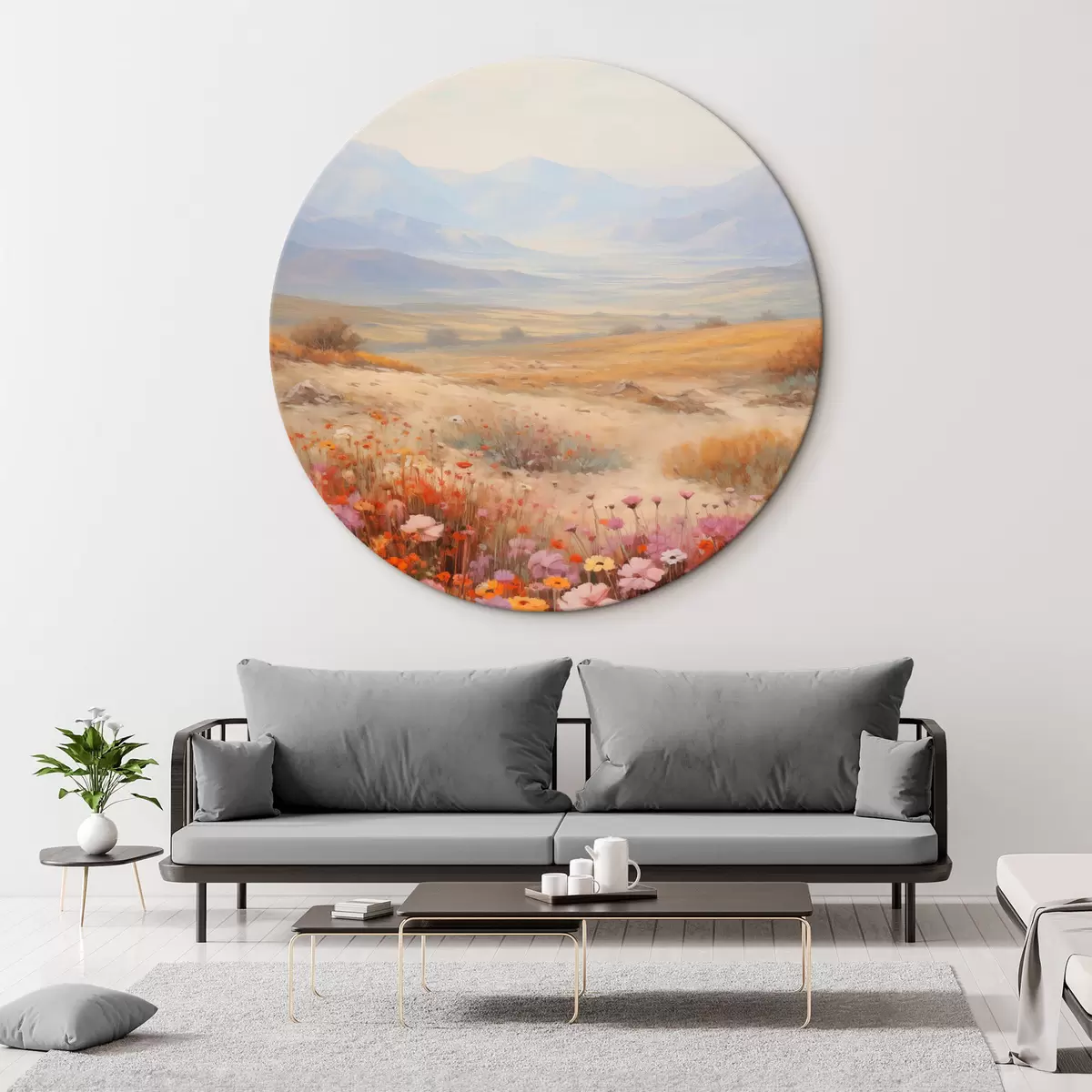 Cuadros redondos Paisaje, un campo de flores coloridas con montañas al fondo, colores suaves y pastel r46685
