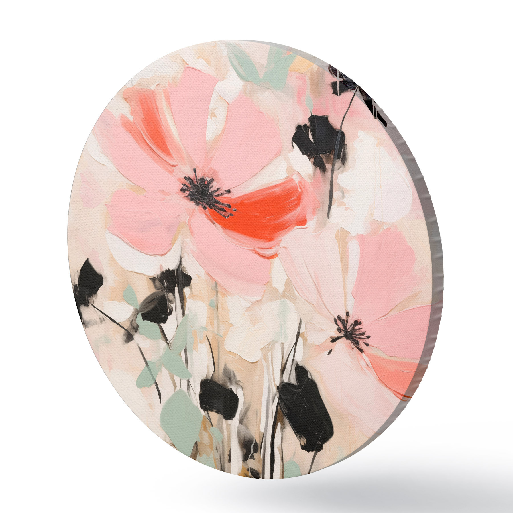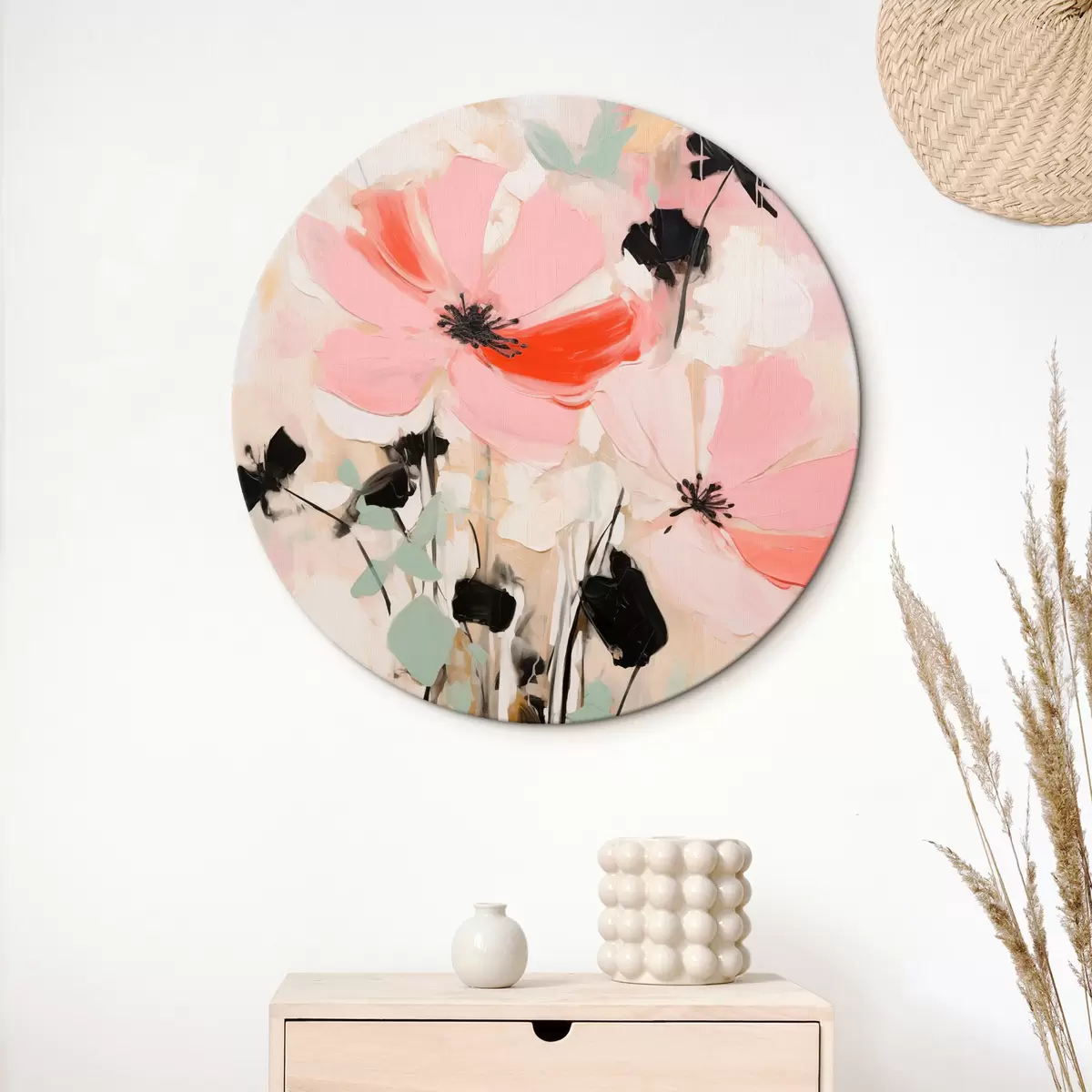 Cuadros redondos Flores rosas y negras con hojas, colores pastel suaves, arreglo floral abstracto, arte minimalista r46687