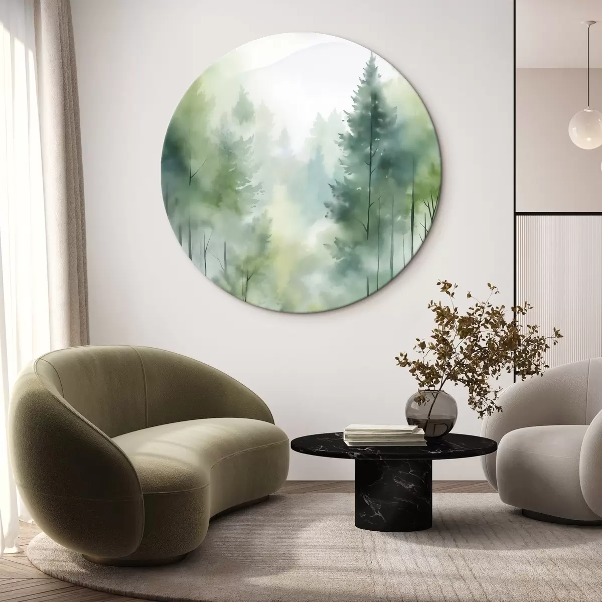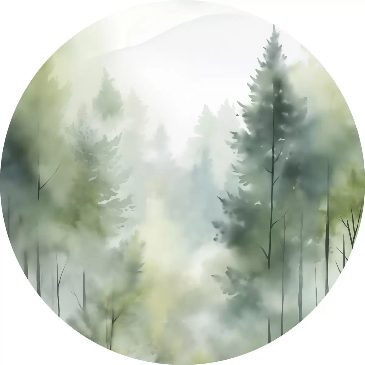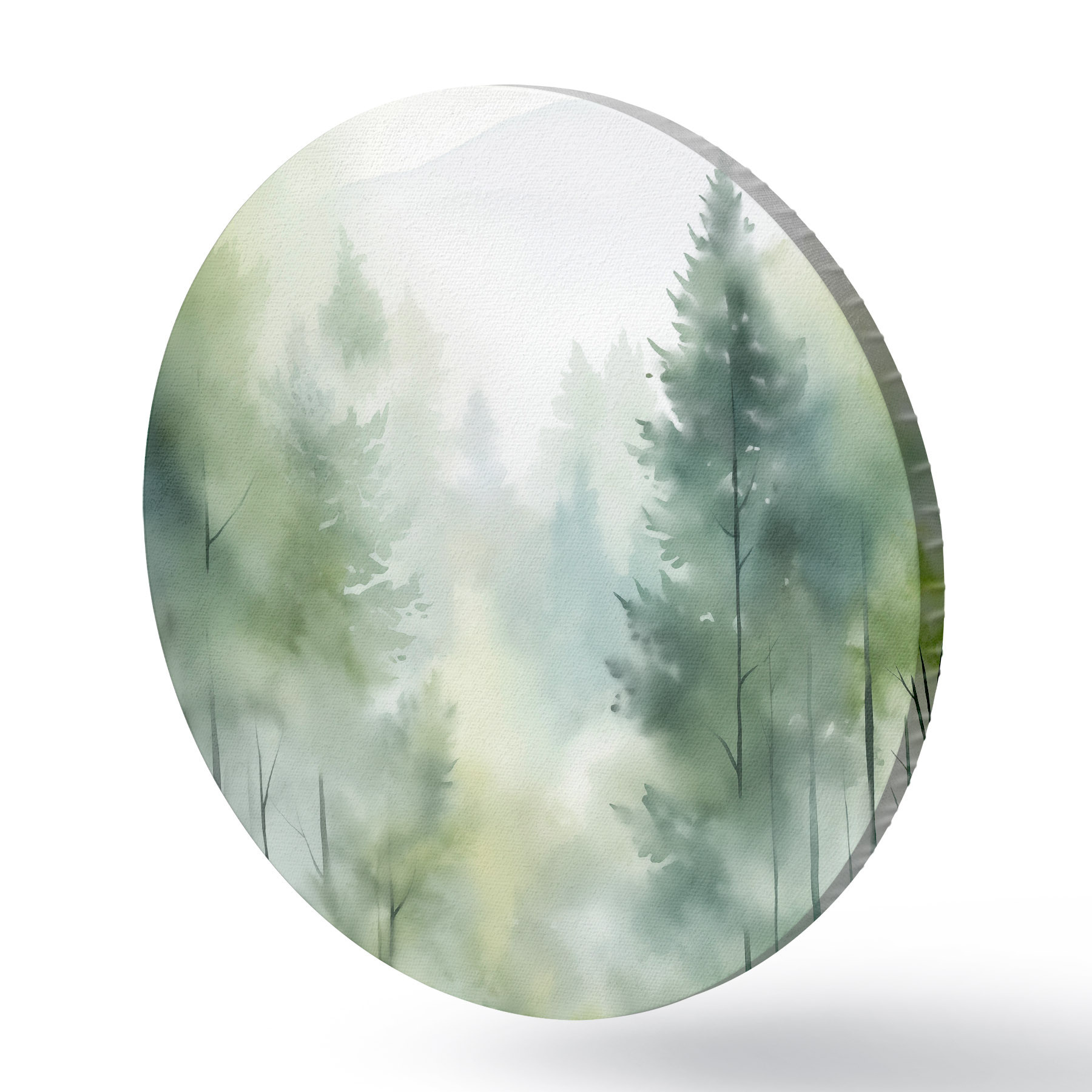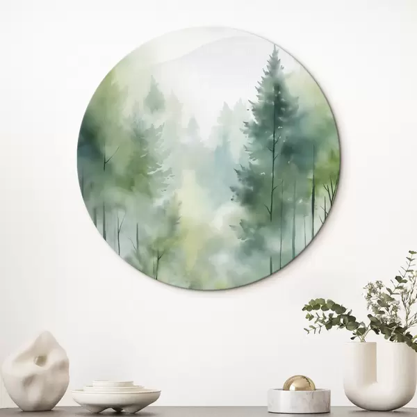Cuadros redondos Imitación de pintura en acuarela de un bosque brumoso con altos pinos y montañas al fondo r46690