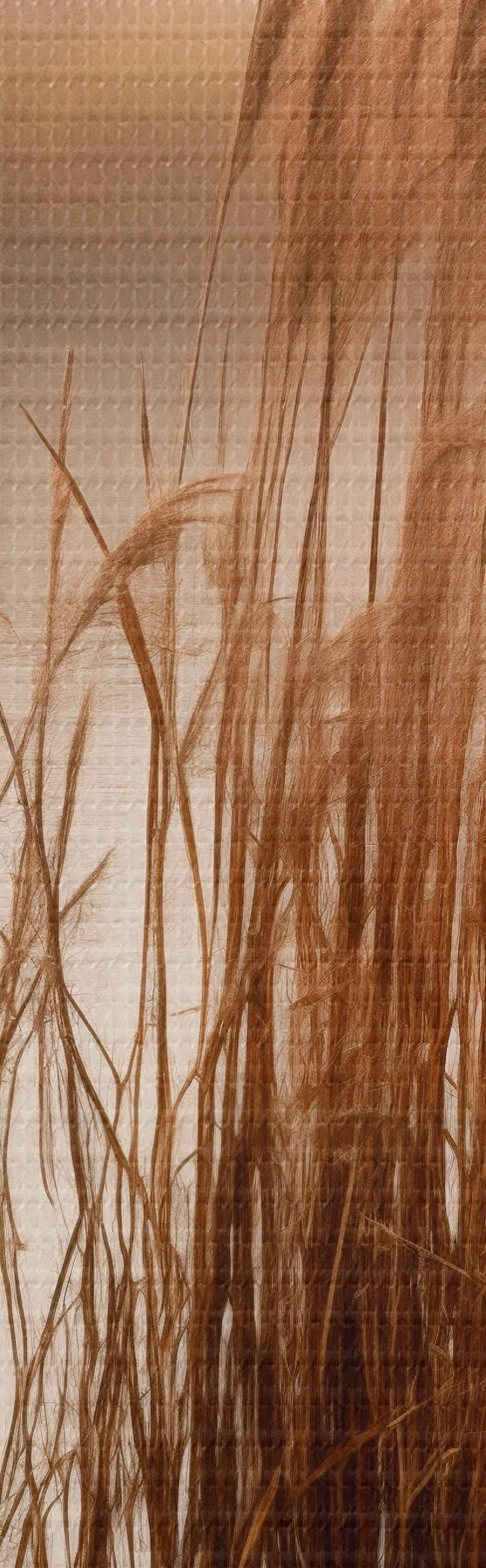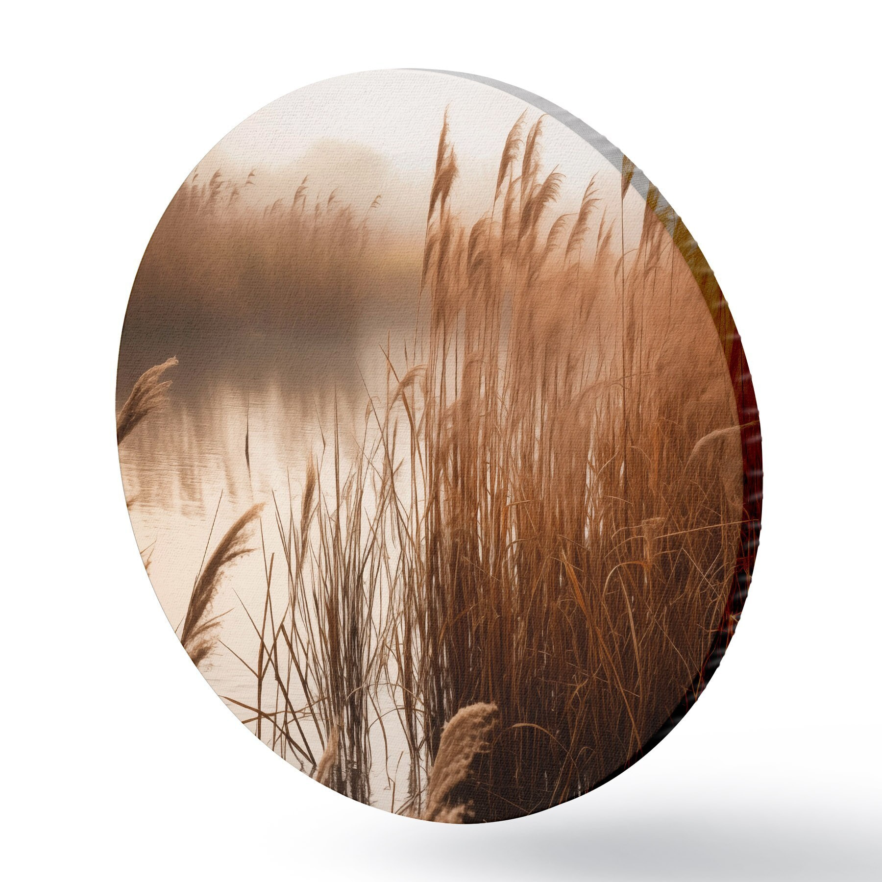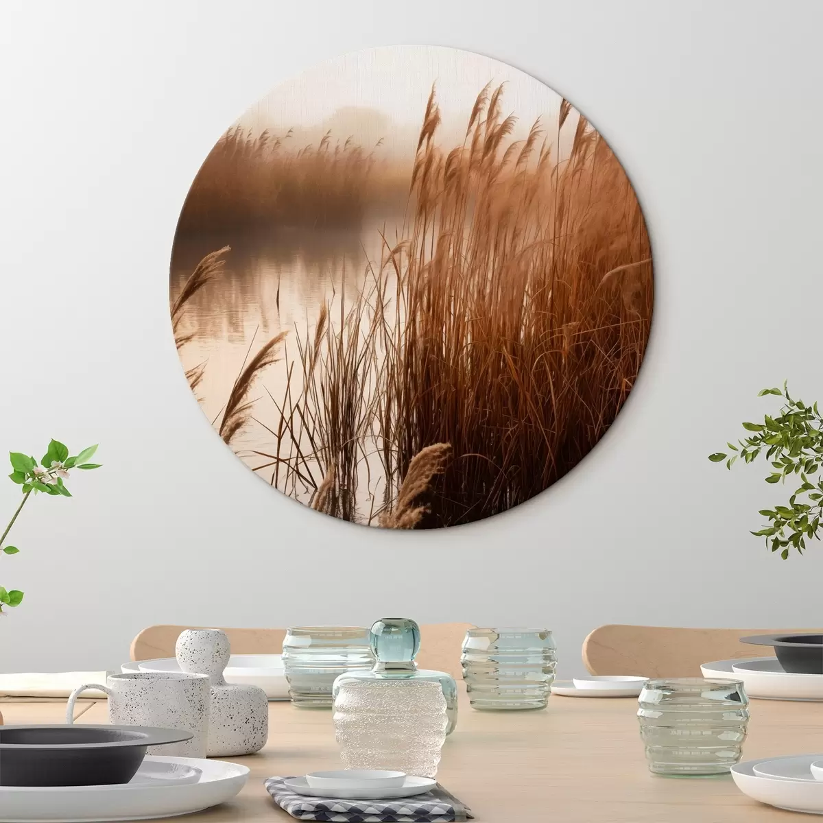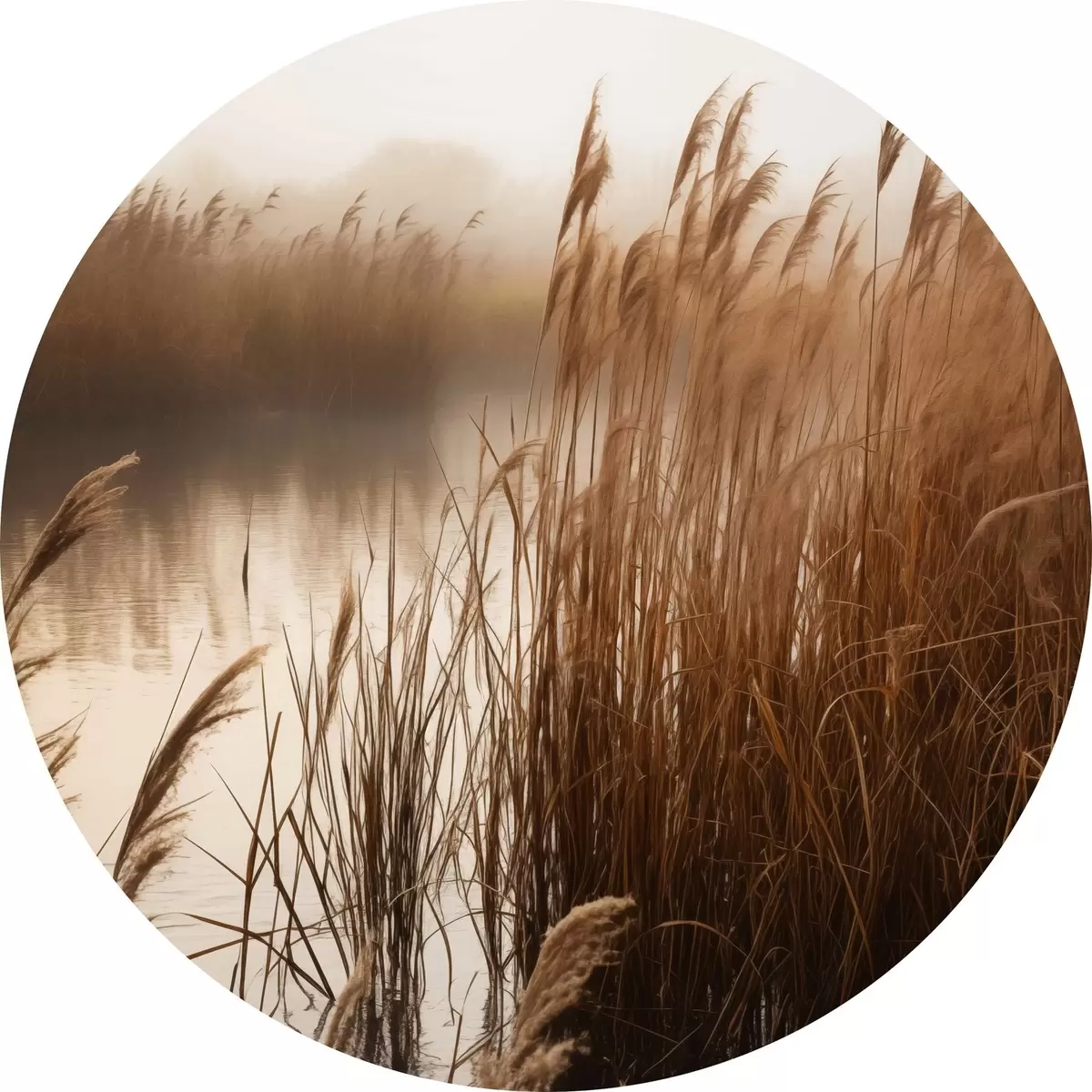 Cuadros redondos Juncos altos que crecen en un cuerpo de agua, el agua refleja los juncos, fondo brumoso, luz suave, escena natural r46695
