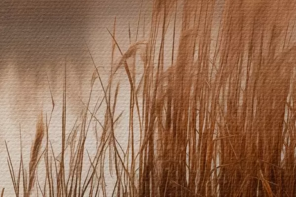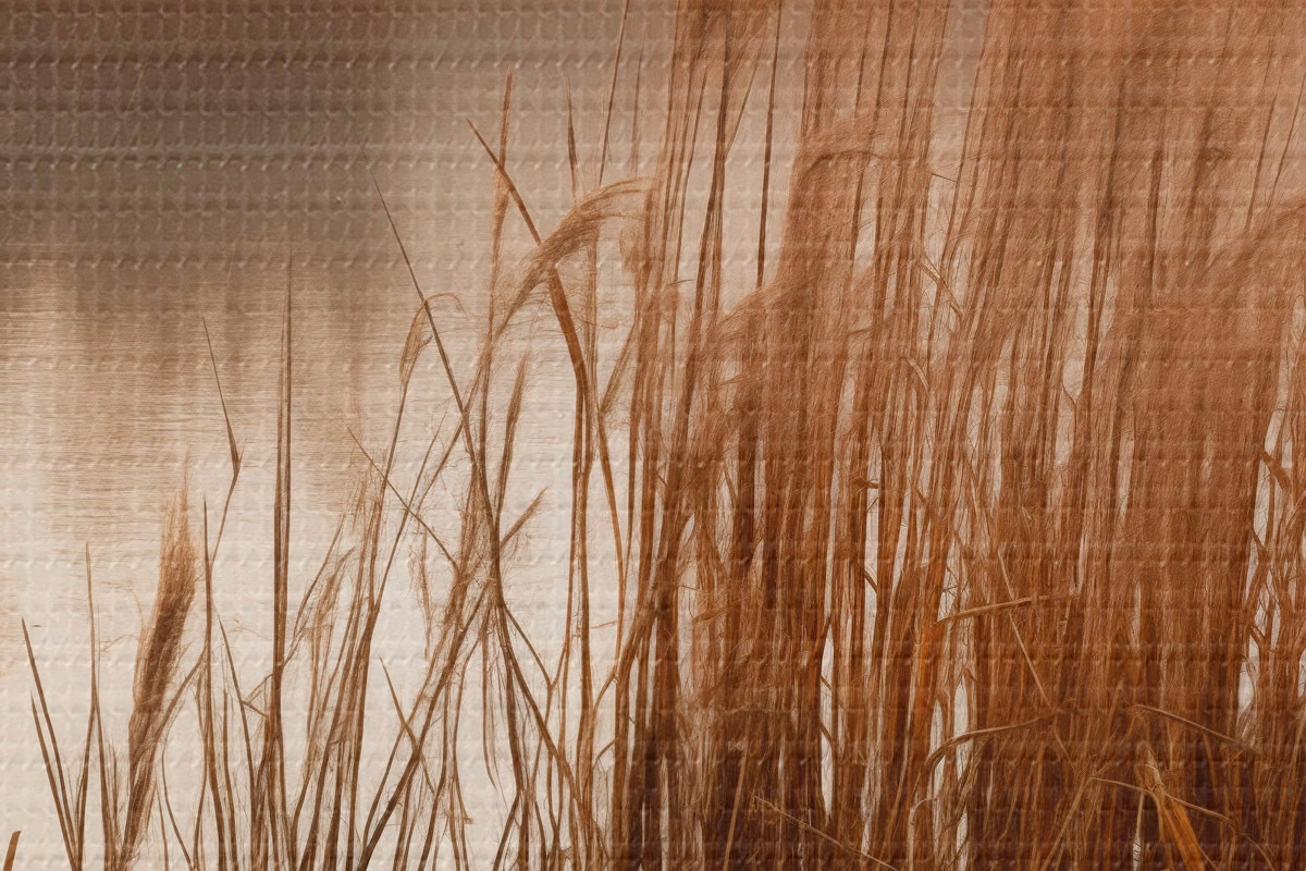 Foto Juncos altos que crecen en un cuerpo de agua, el agua refleja los juncos, fondo brumoso, luz suave, escena natural Nr r46695