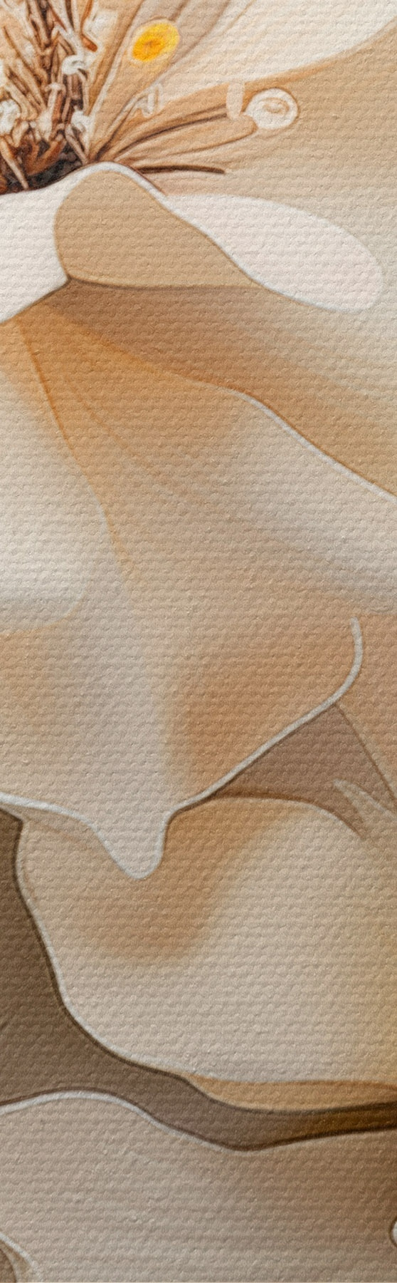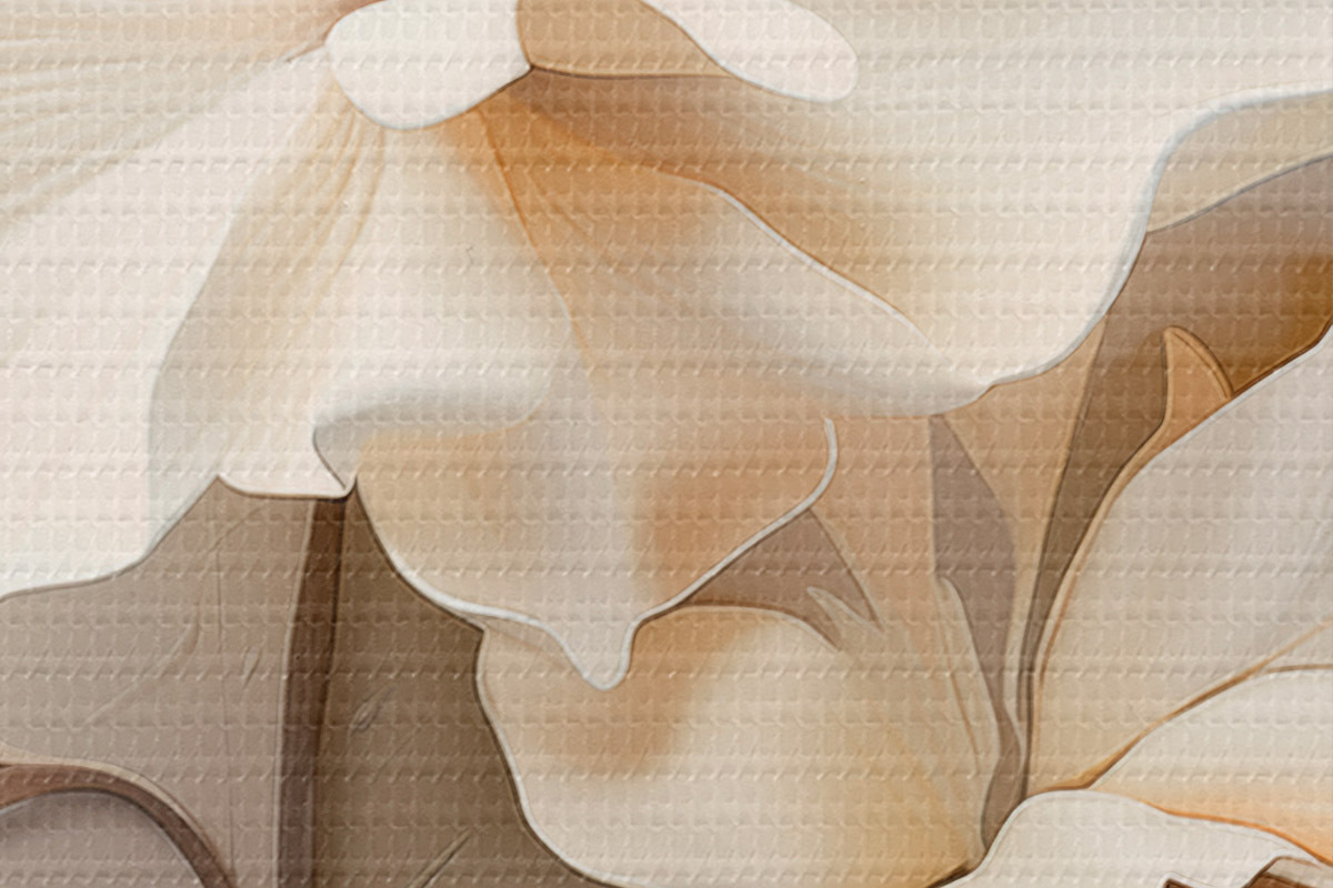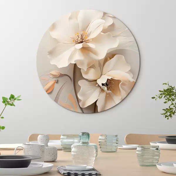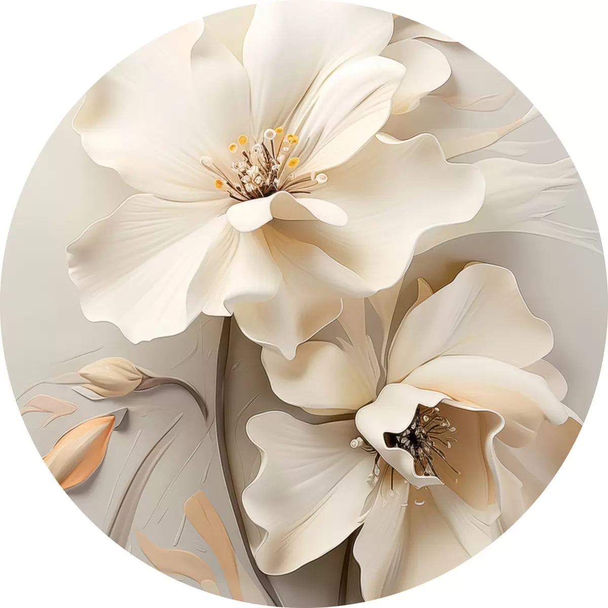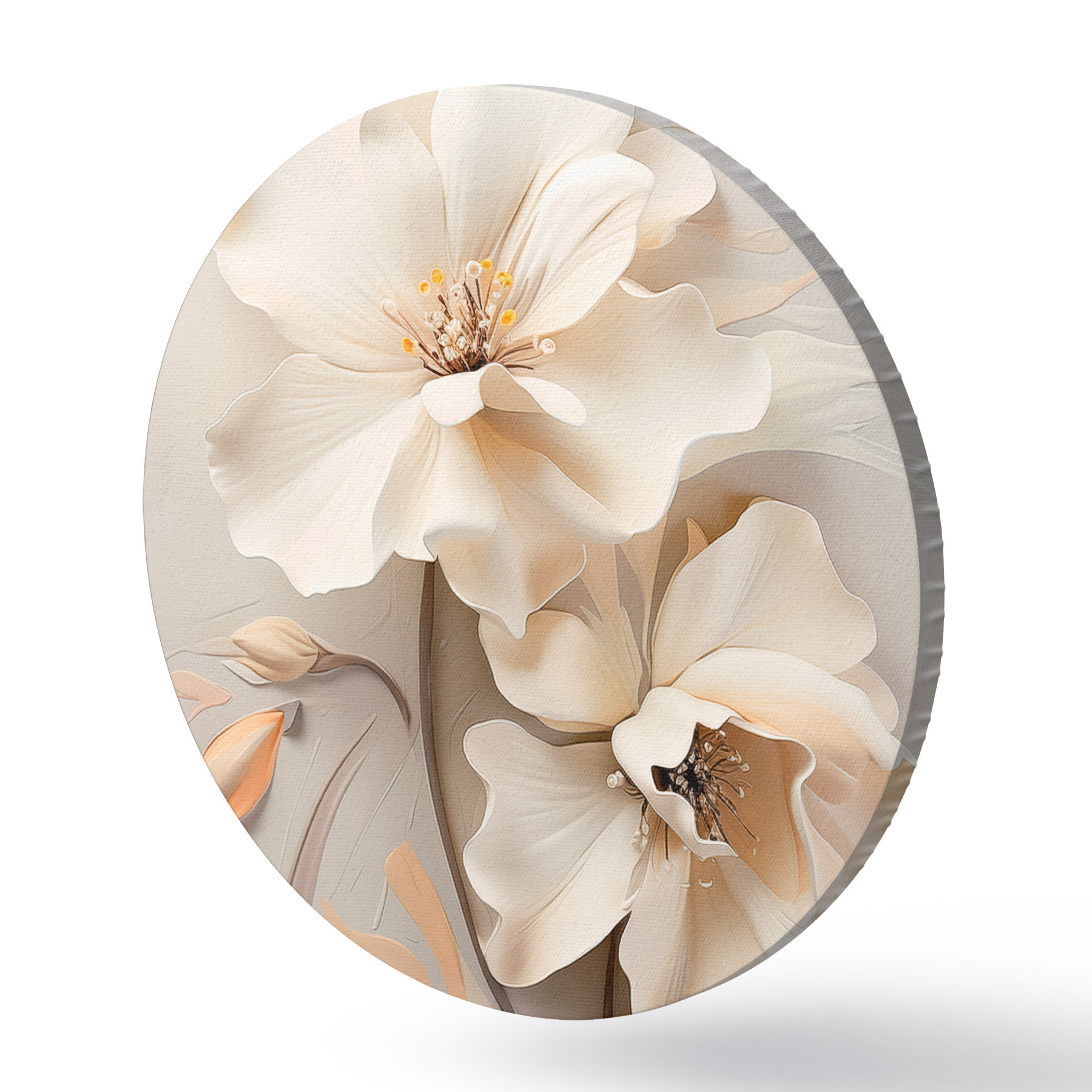 Cuadros redondos Flores blancas, pétalos con sombras suaves, fondo beige claro, composición elegante, estilo minimalista r46700