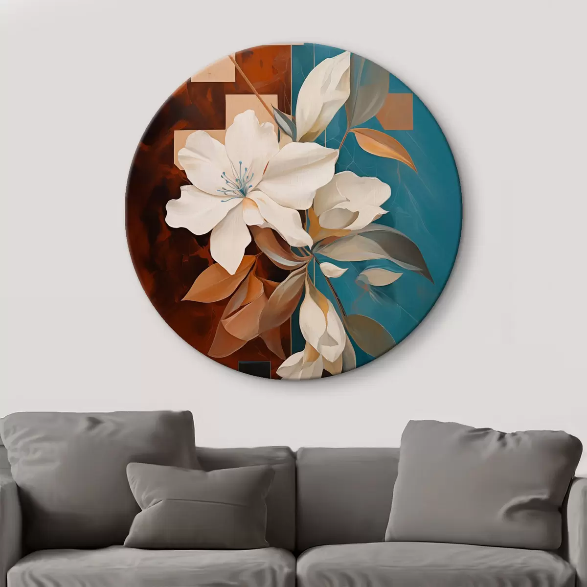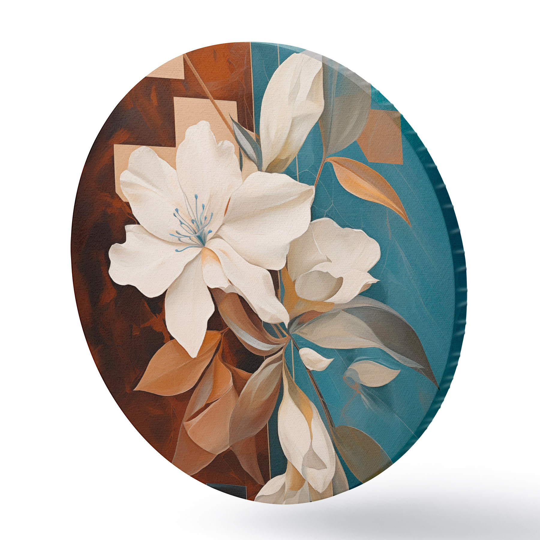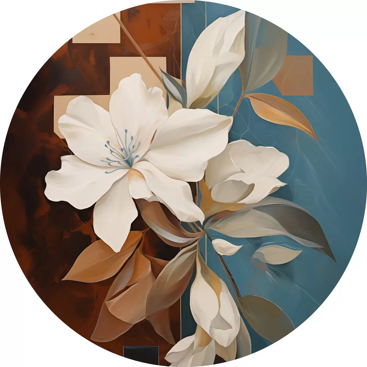Cuadros redondos Flores y hojas blancas abstractas con un fondo marrón y azul con formas abstractas, en un estilo minimalista r46709