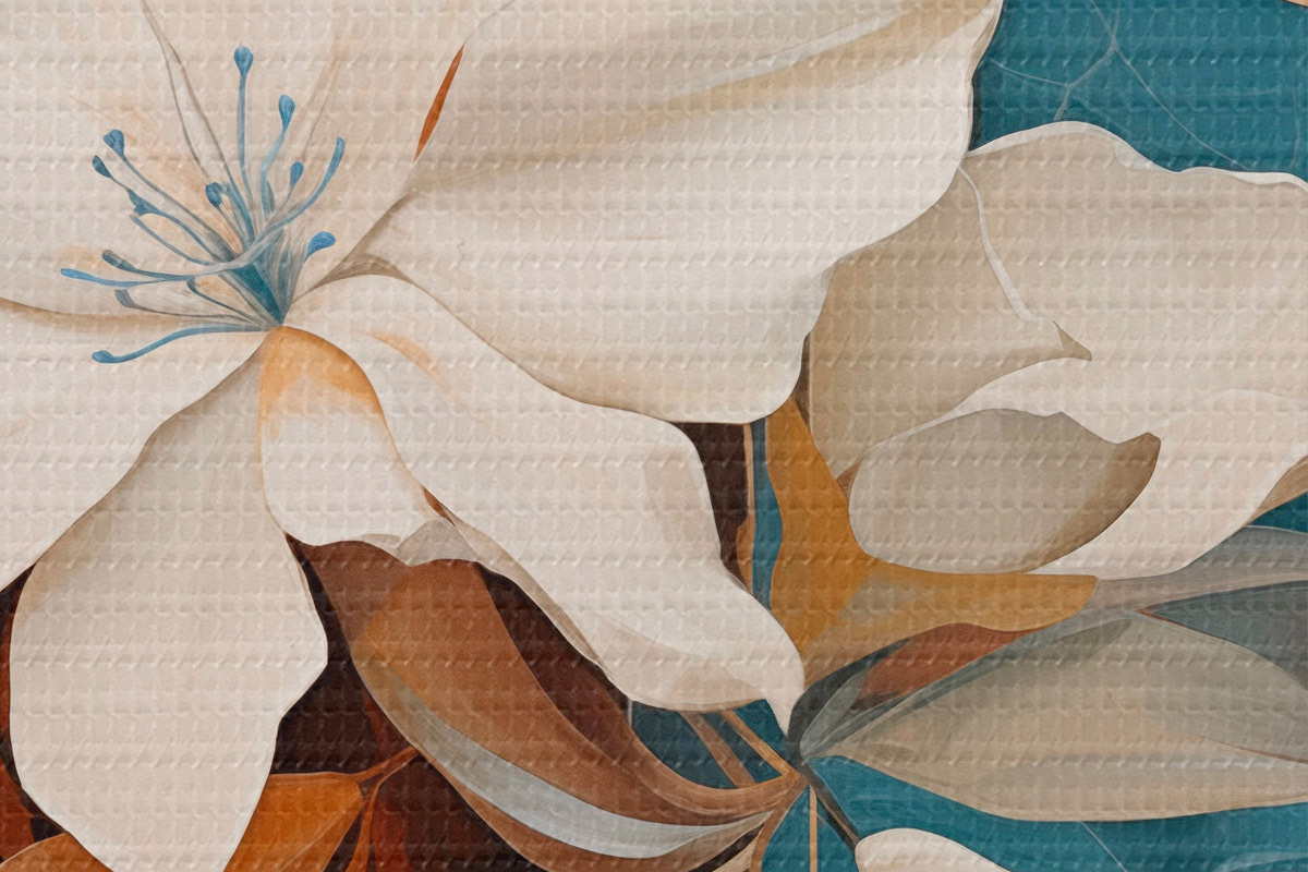 Foto Flores y hojas blancas abstractas con un fondo marrón y azul con formas abstractas, en un estilo minimalista Nr r46709