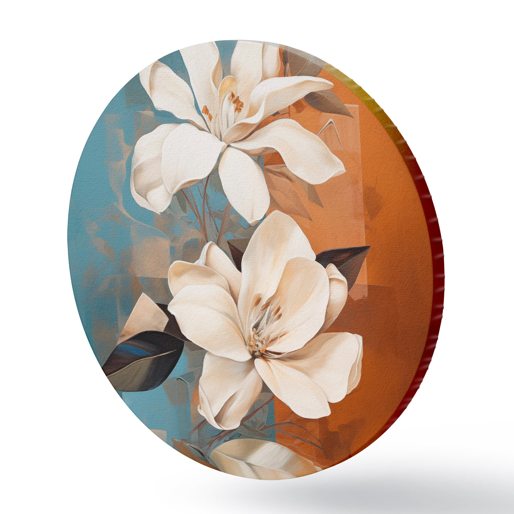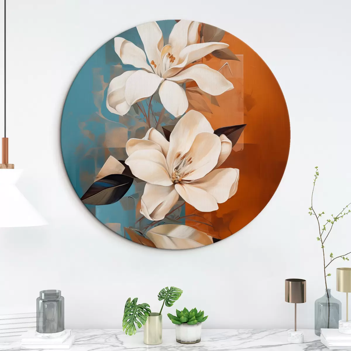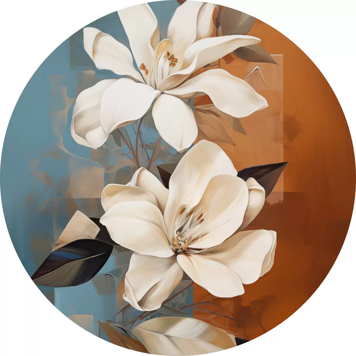 Cuadros redondos Flores y hojas blancas abstractas con un fondo marrón y azul con formas abstractas, en un estilo minimalista r46710