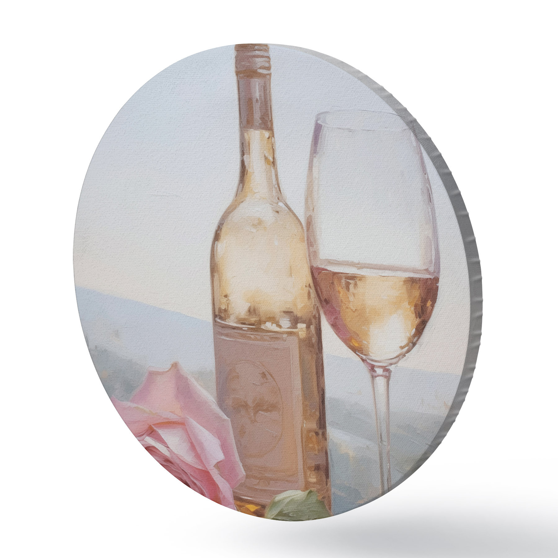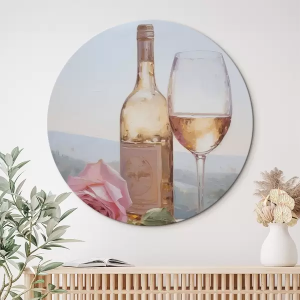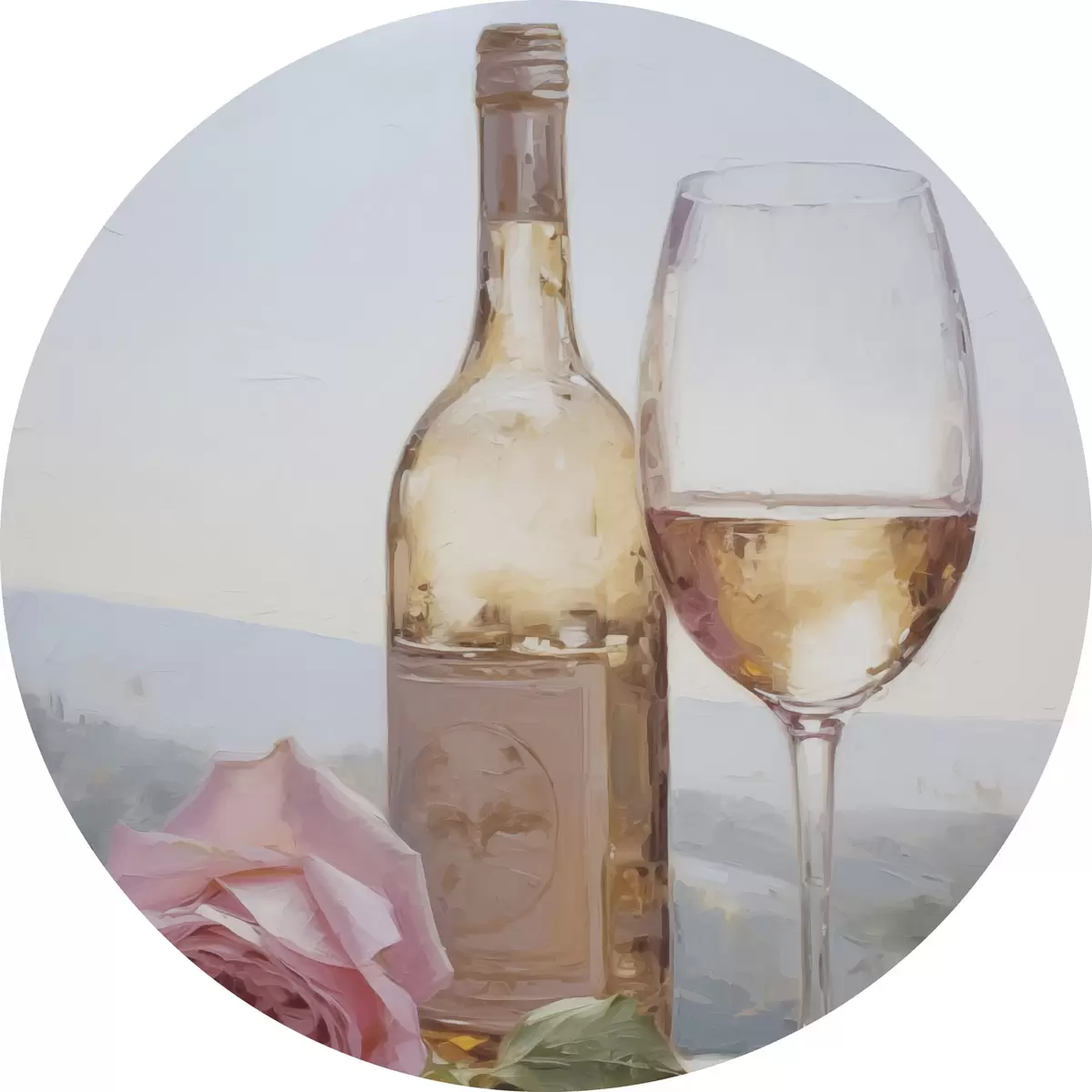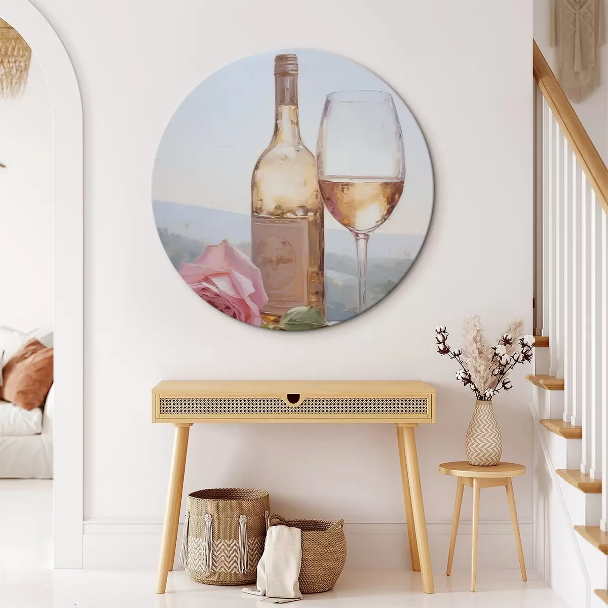 Cuadros redondos Una botella y una copa de vino y un perro pequeño con gafas, pintura de imitación r46721