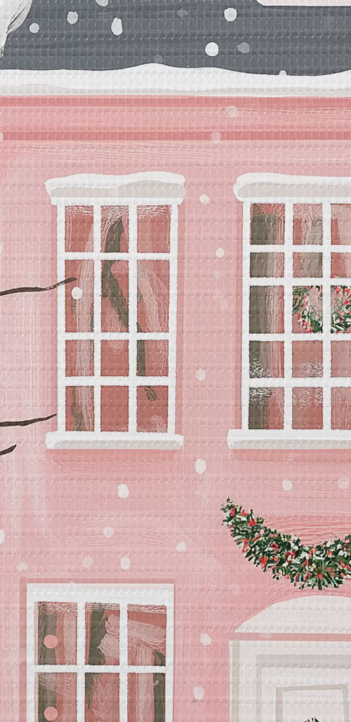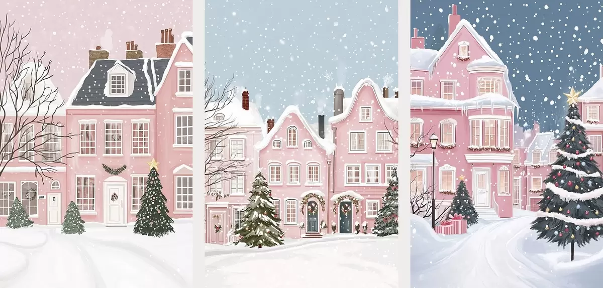 murales de pared Preciosa ciudad invernal con casas rosas, pinos y copos de nieve  m00410