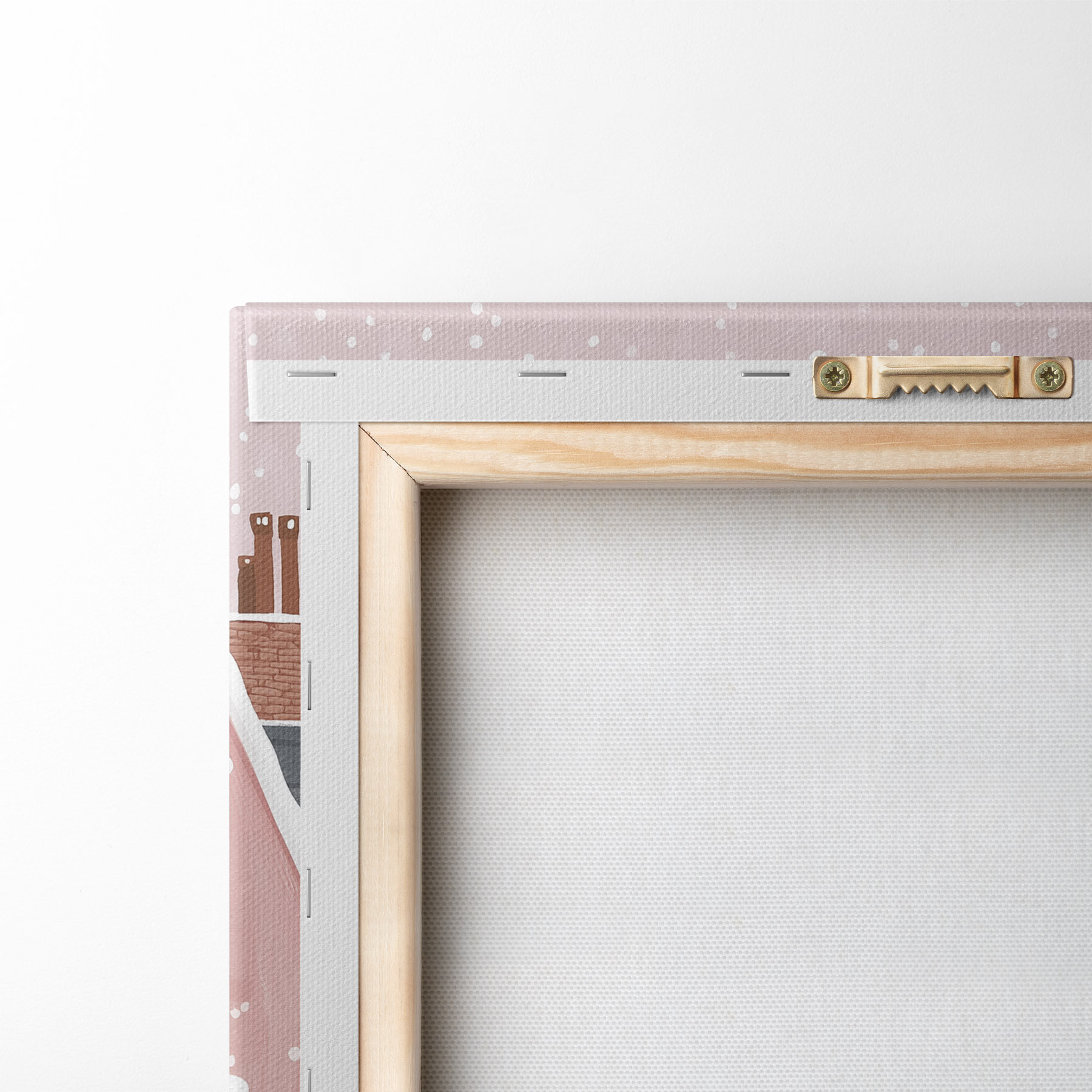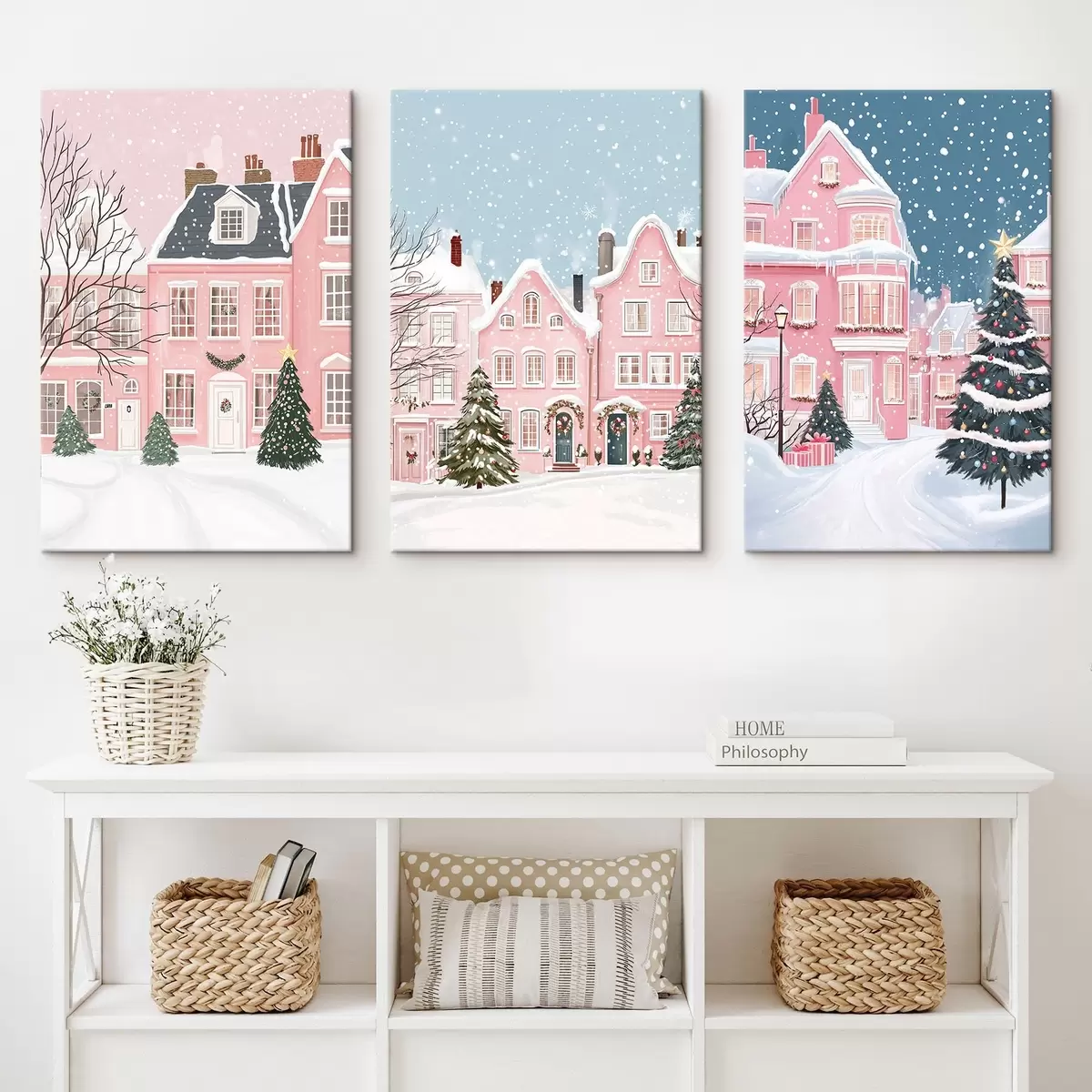 Cuadros Preciosa ciudad invernal con casas rosas, pinos y copos de nieve Nr m00410