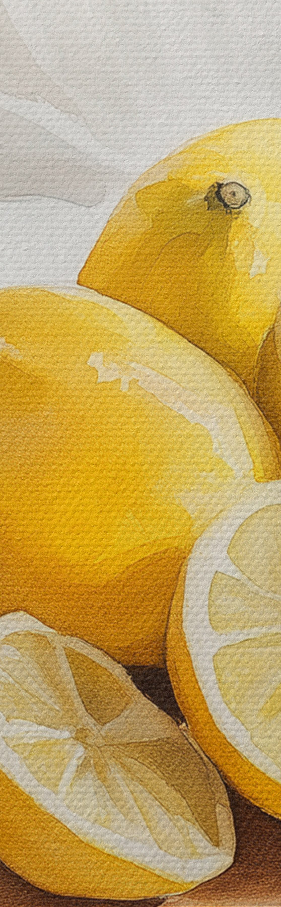 Cuadros Panqueques con mantequilla de maní, limones en la tabla de madera, estilo acuarela Nr m00416