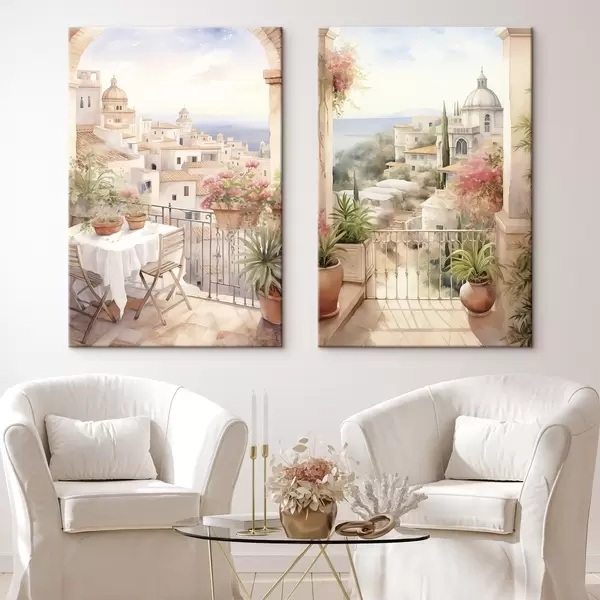Cuadros Puesta de sol en el balcón, arquitectura, flores en flor, estilo acuarela, mediterráneo Nr m00420
