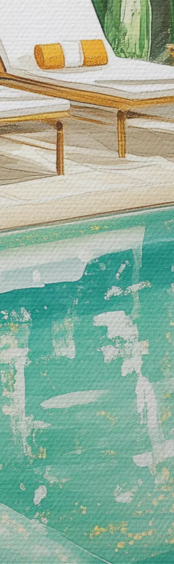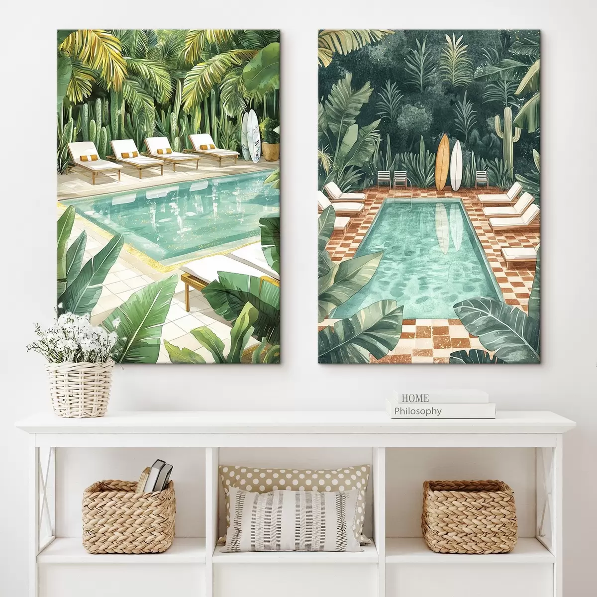 Cuadros Piscina de verano, vintage, bosque tropical, vegetación, palmeras, estilo acuarela Nr m00422