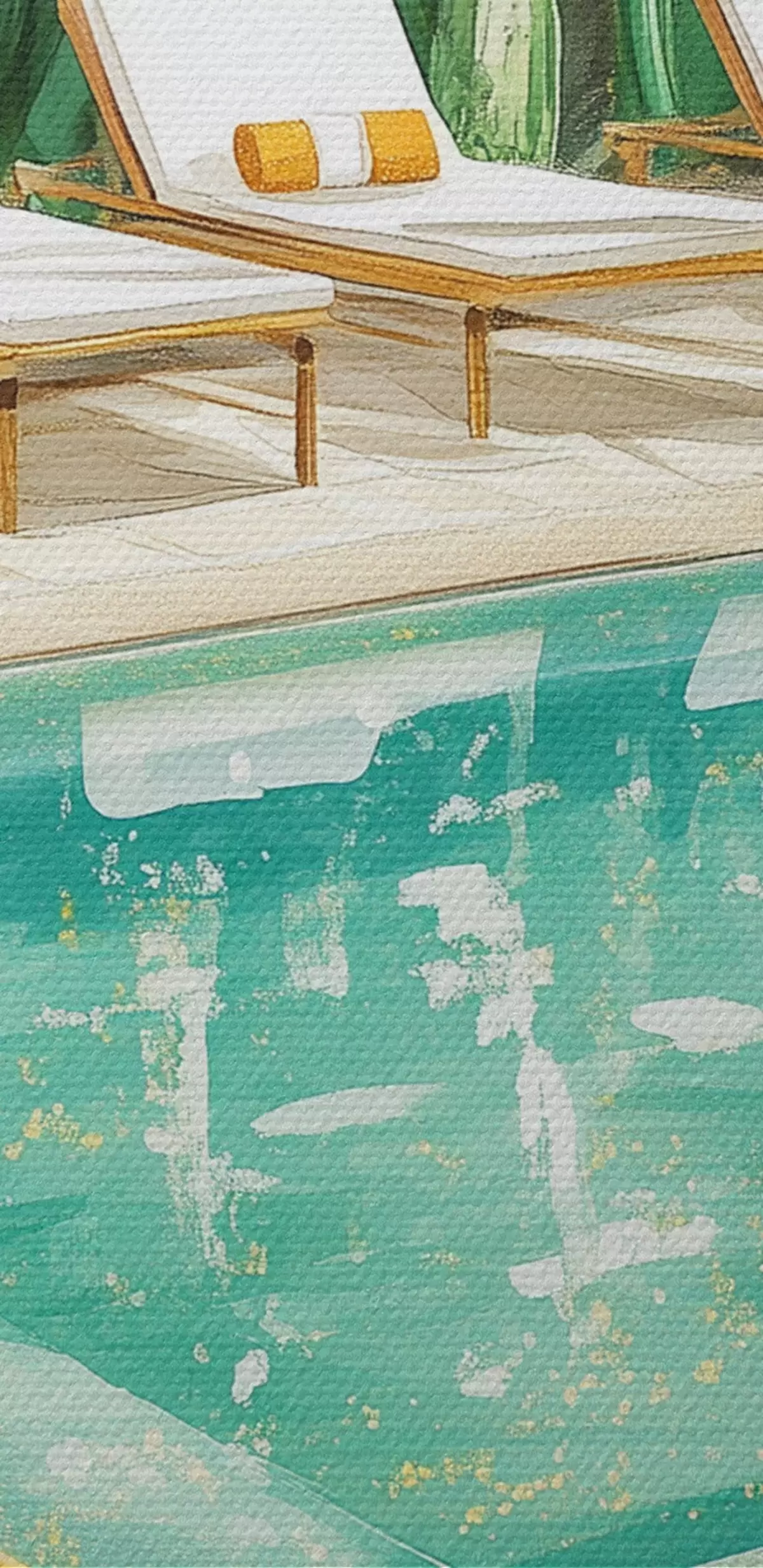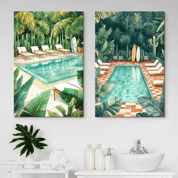 Cuadros Piscina de verano, vintage, bosque tropical, vegetación, palmeras, estilo acuarela Nr m00422