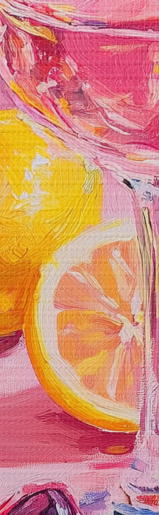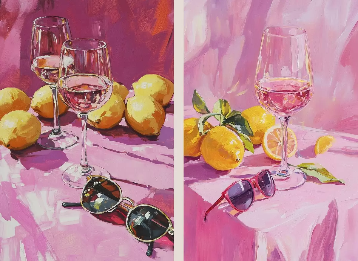 Cuadros Abstracción al óleo con copas de champán, limones y gafas de sol, colores rosas Nr m00444