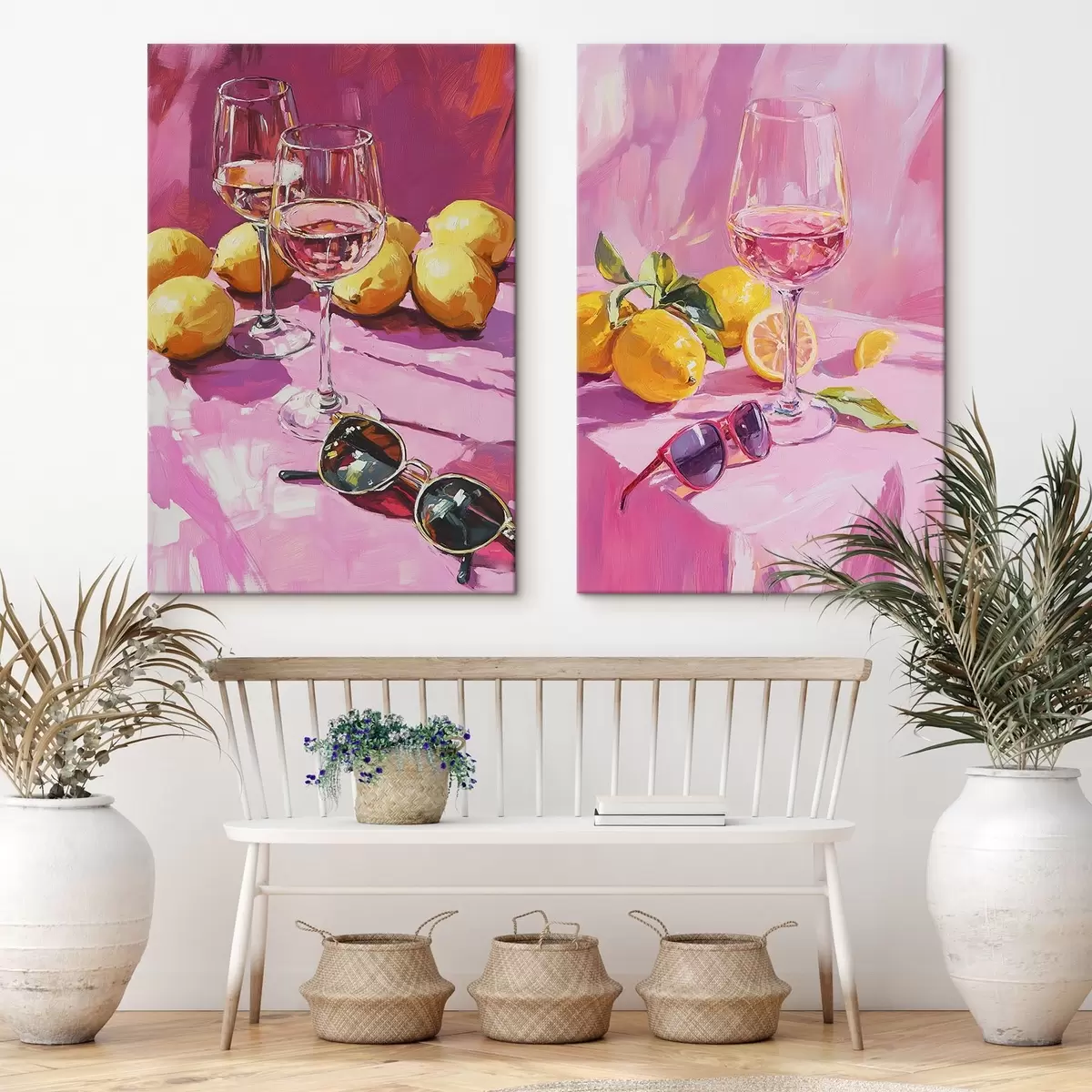 murales de pared Abstracción al óleo con copas de champán, limones y gafas de sol, colores rosas m00444
