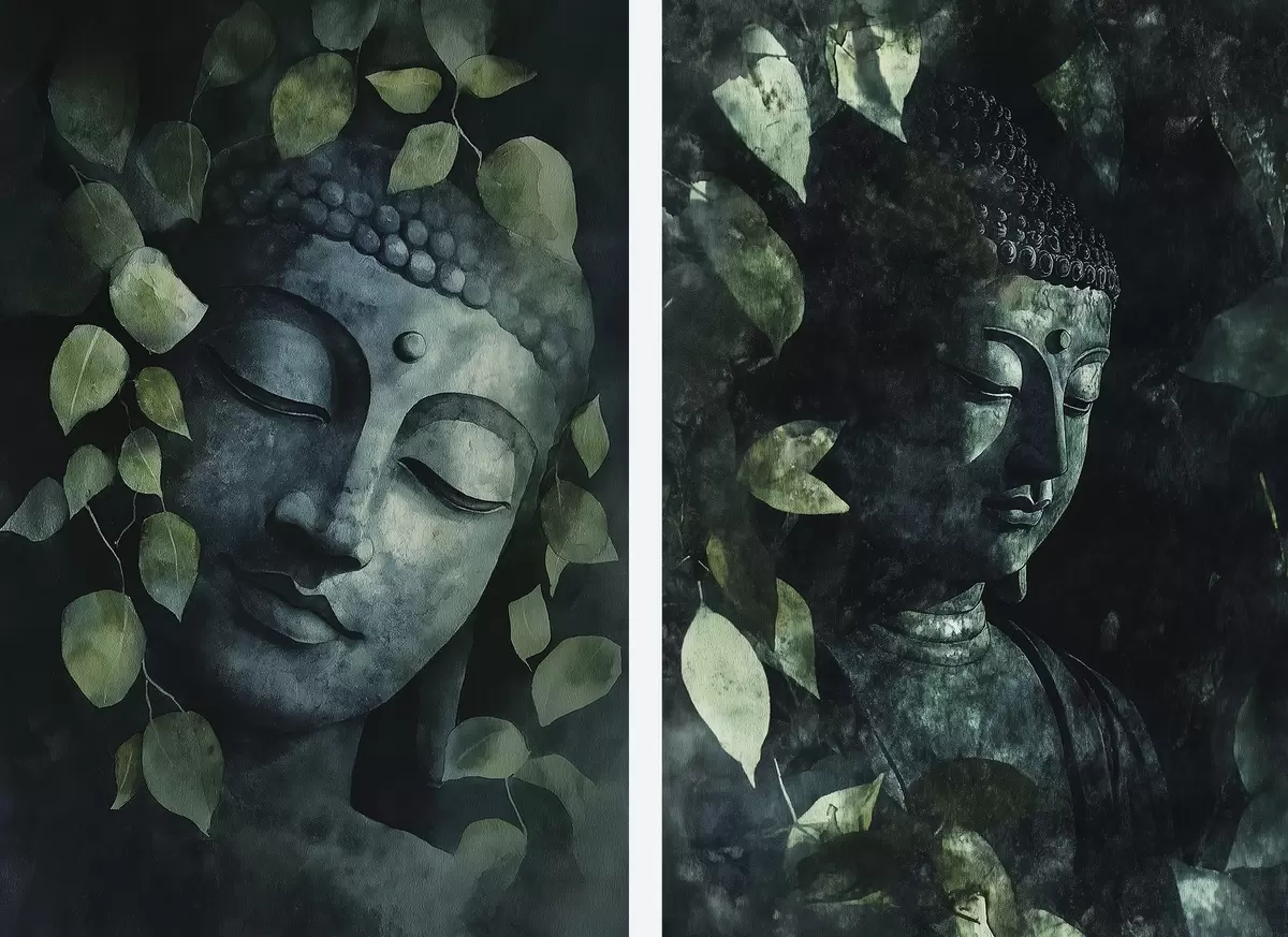 murales de pared Buda verde en hojas tropicales, estilo acuarela m00451