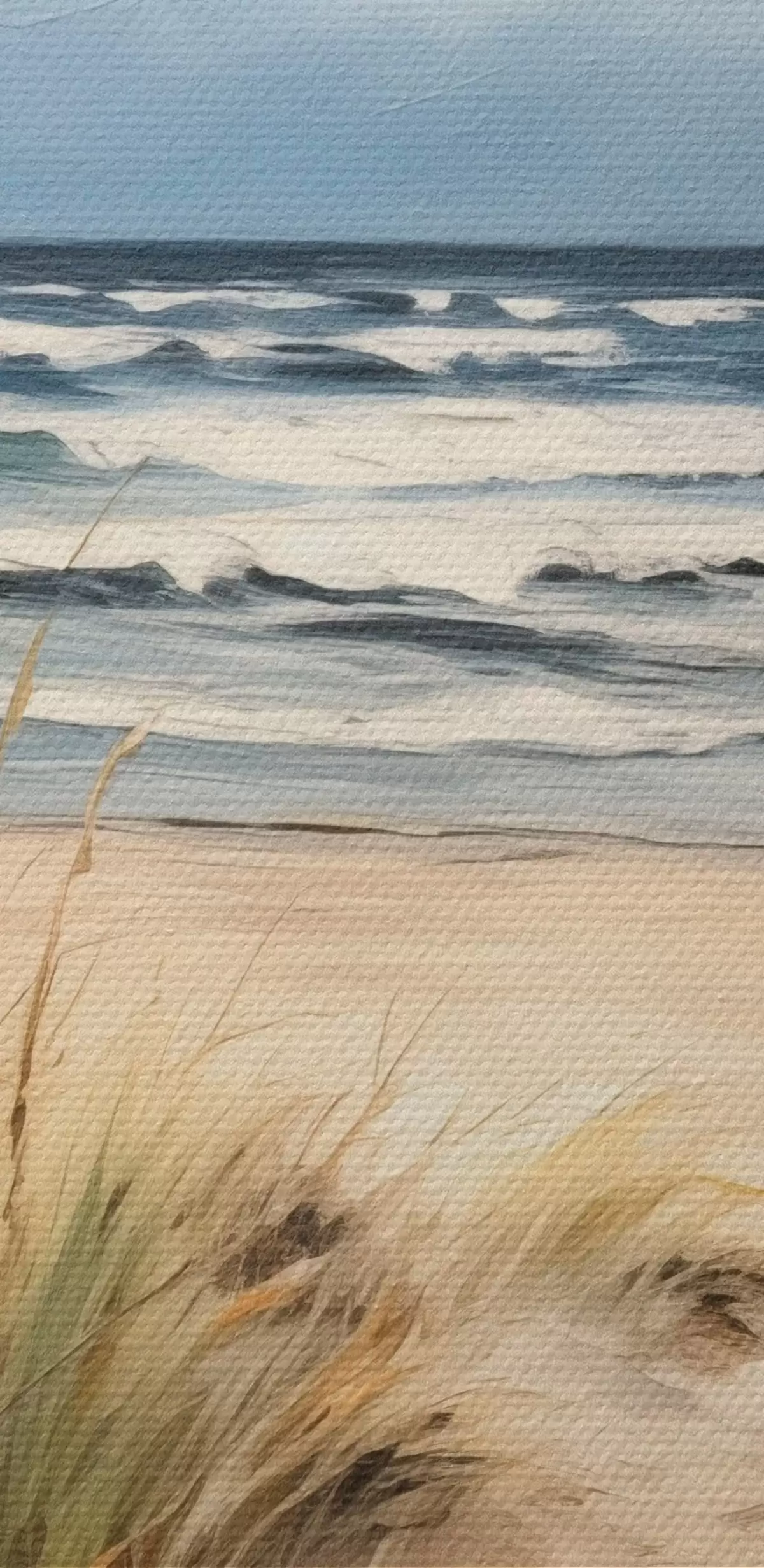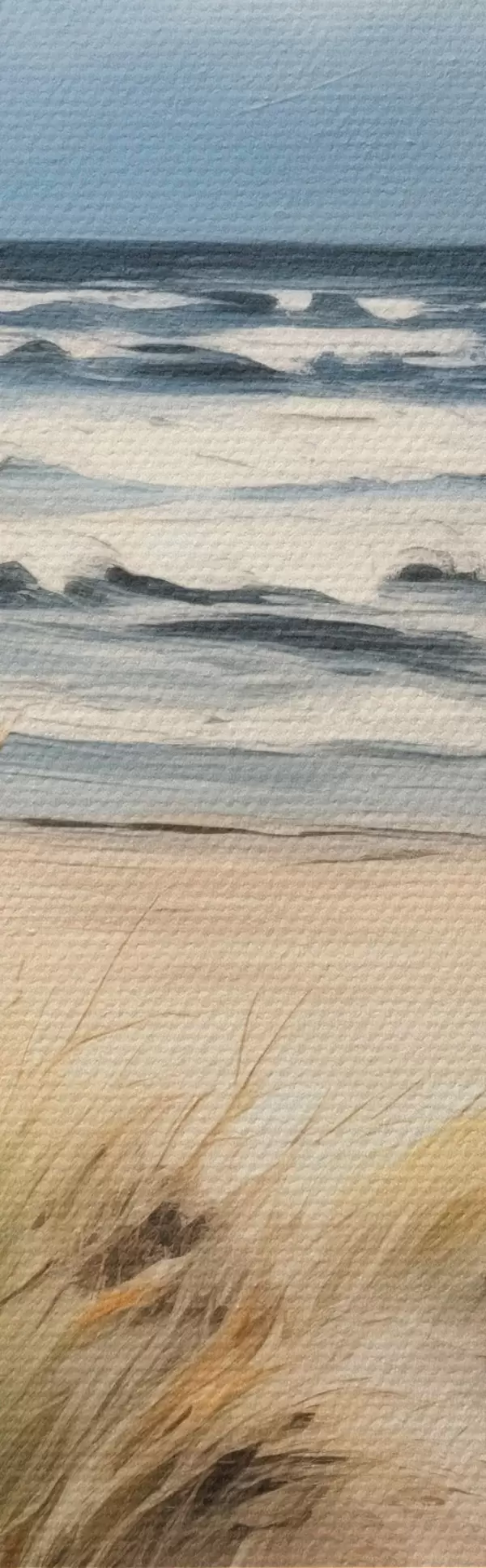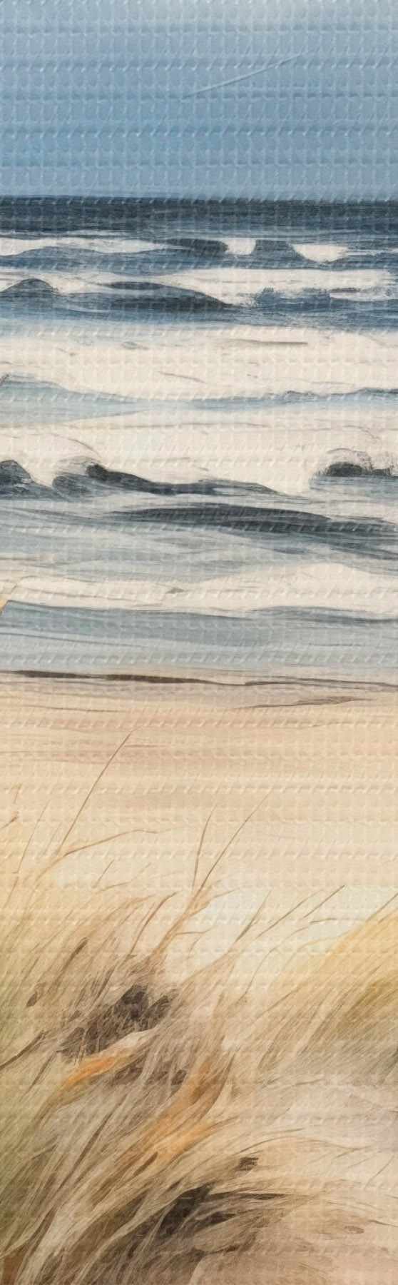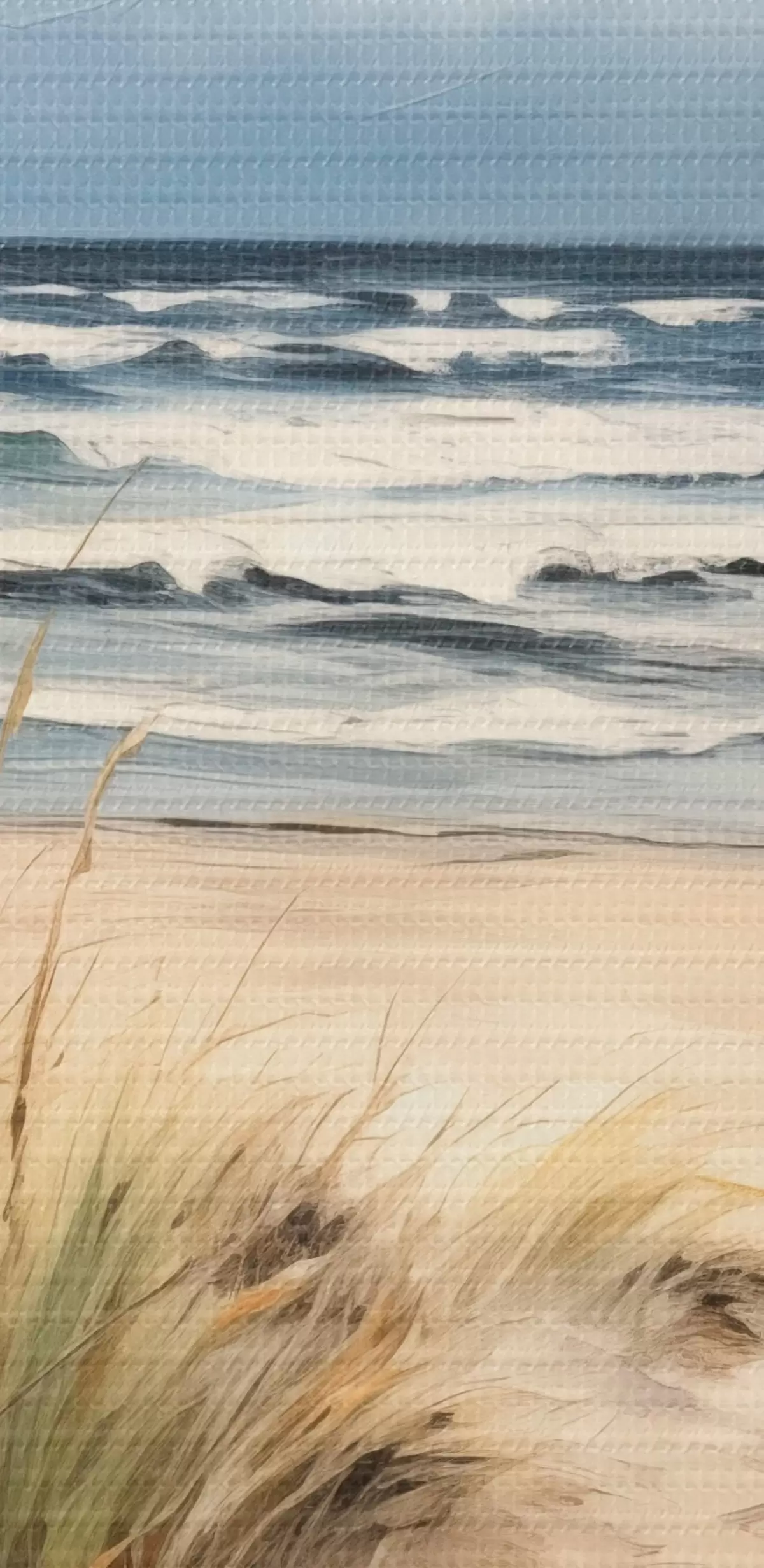 Cuadros Una playa de arena con hierba alta en primer plano, el océano con olas y un cielo nublado al fondo Nr m00521